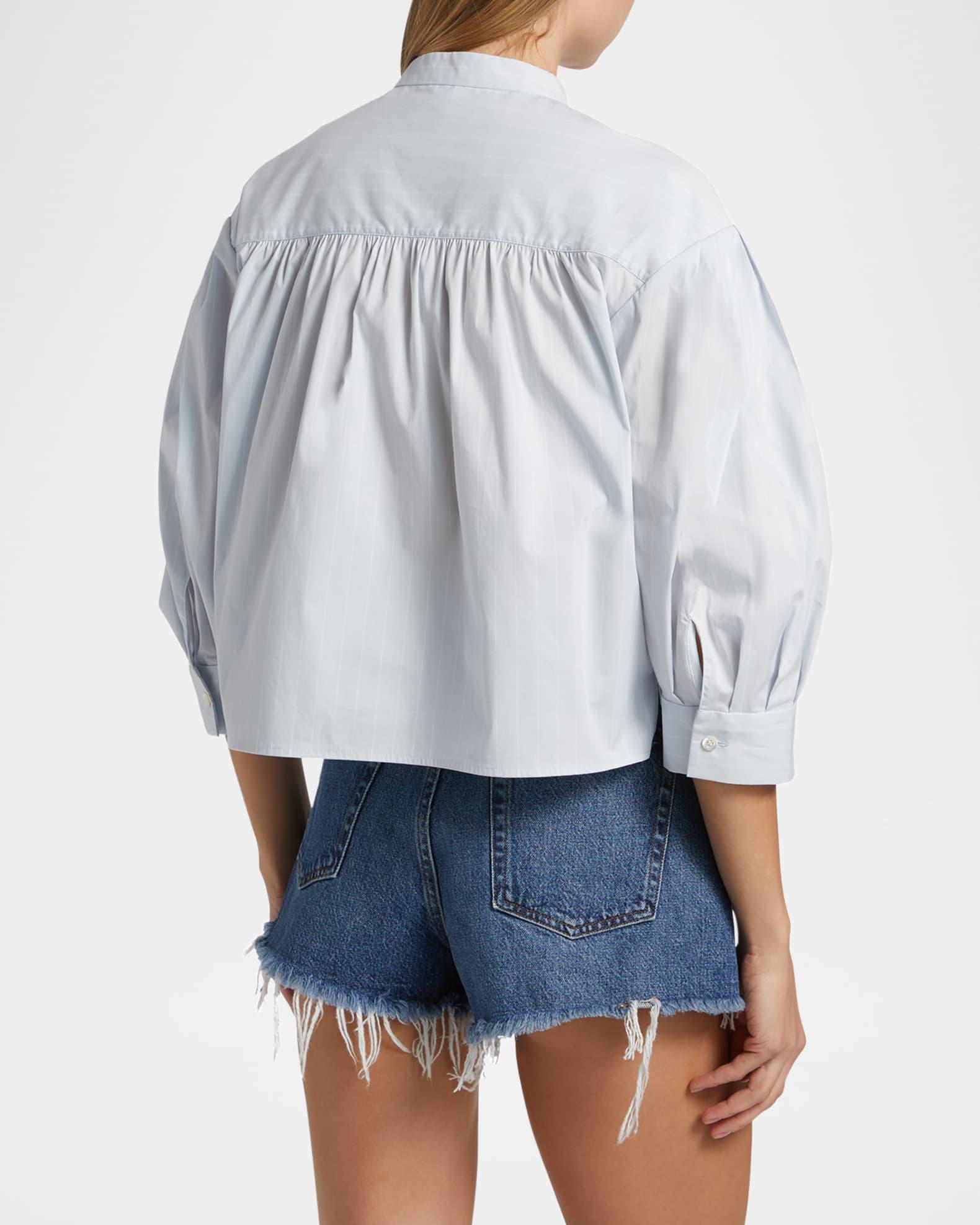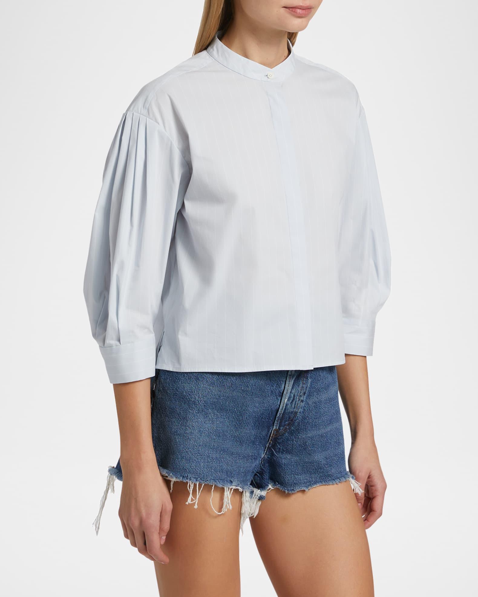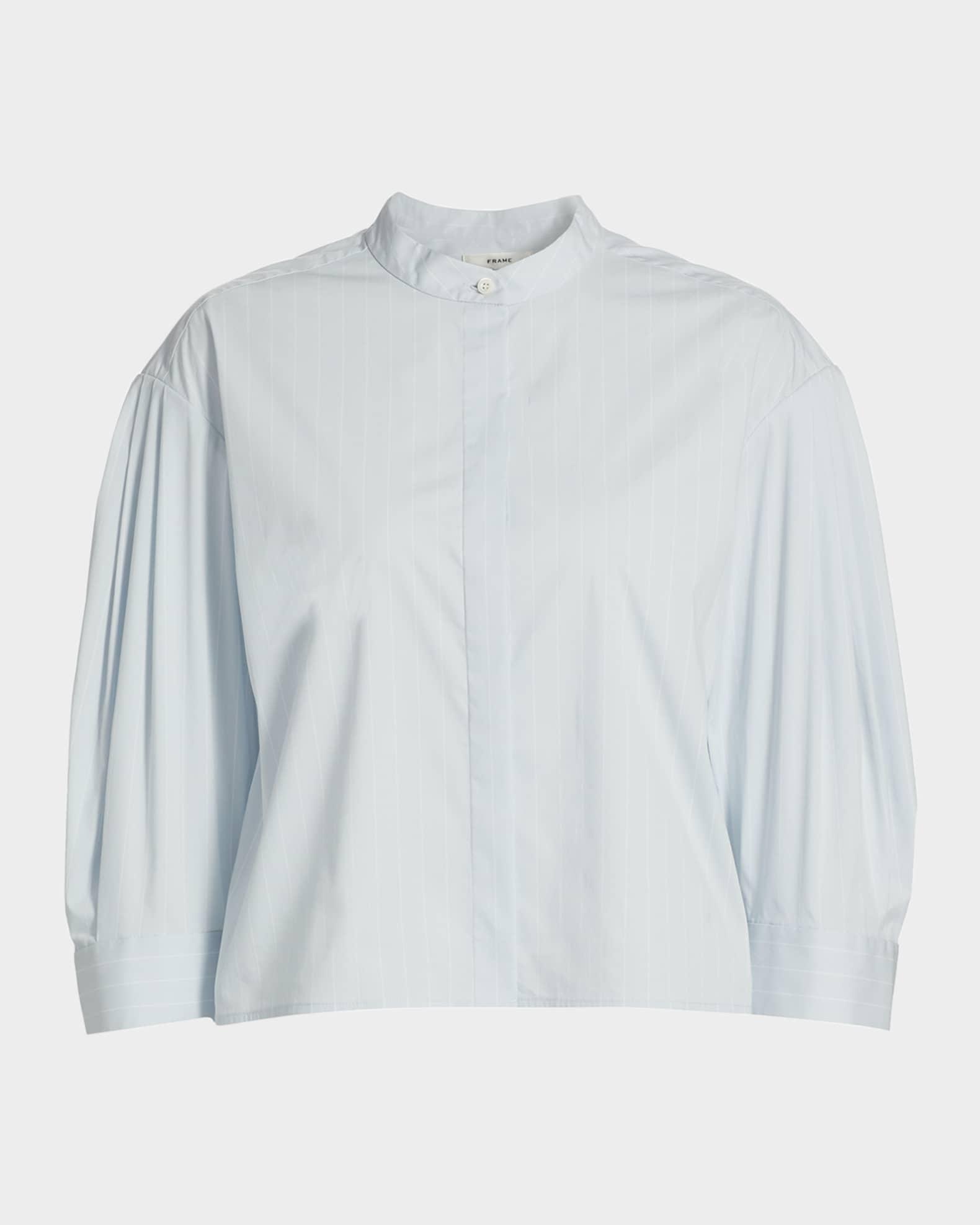 FRAME pinstriped crisp cotton top Slight stand collar Three-quarter puff sleeves Classic fit Hem sits at the hip Concealed button-front Cotton Machine wash cold Imported