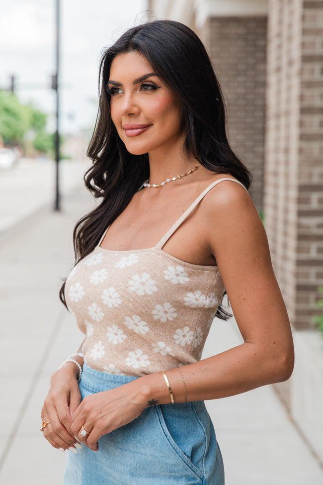 Details Beige Floral Sweater Fabric has stretch Adjustable straps Pair this sweater tank with a cute skort! Unlined Size small from shoulder to hem: 12" Material and Care 43% viscose 32% nylon 25% polyester Machine wash cold, no drum drying Patterns may vary Materials may have natural variations Colors may vary from different viewing devices