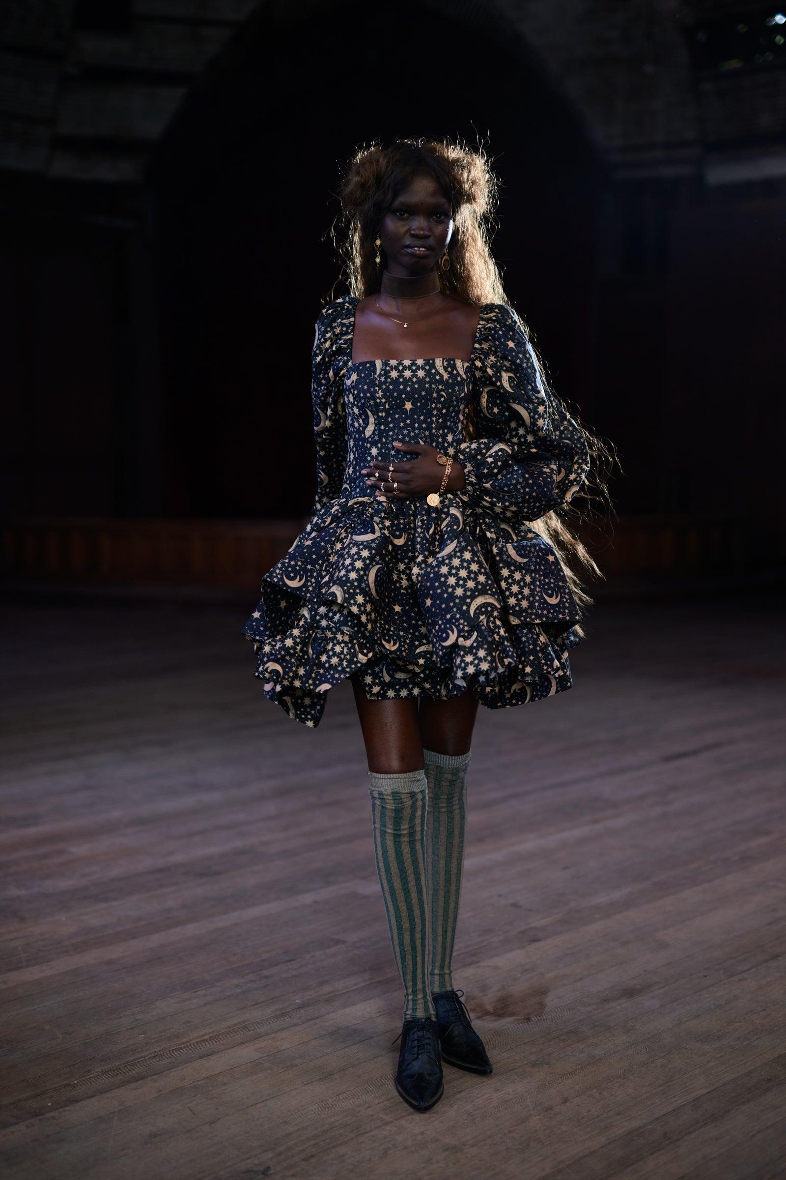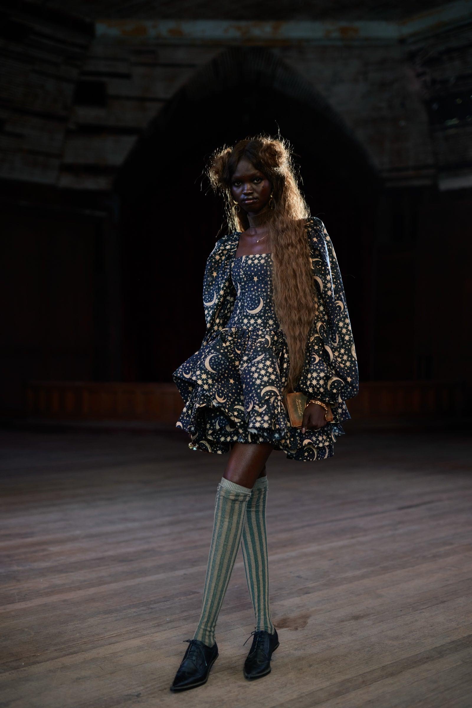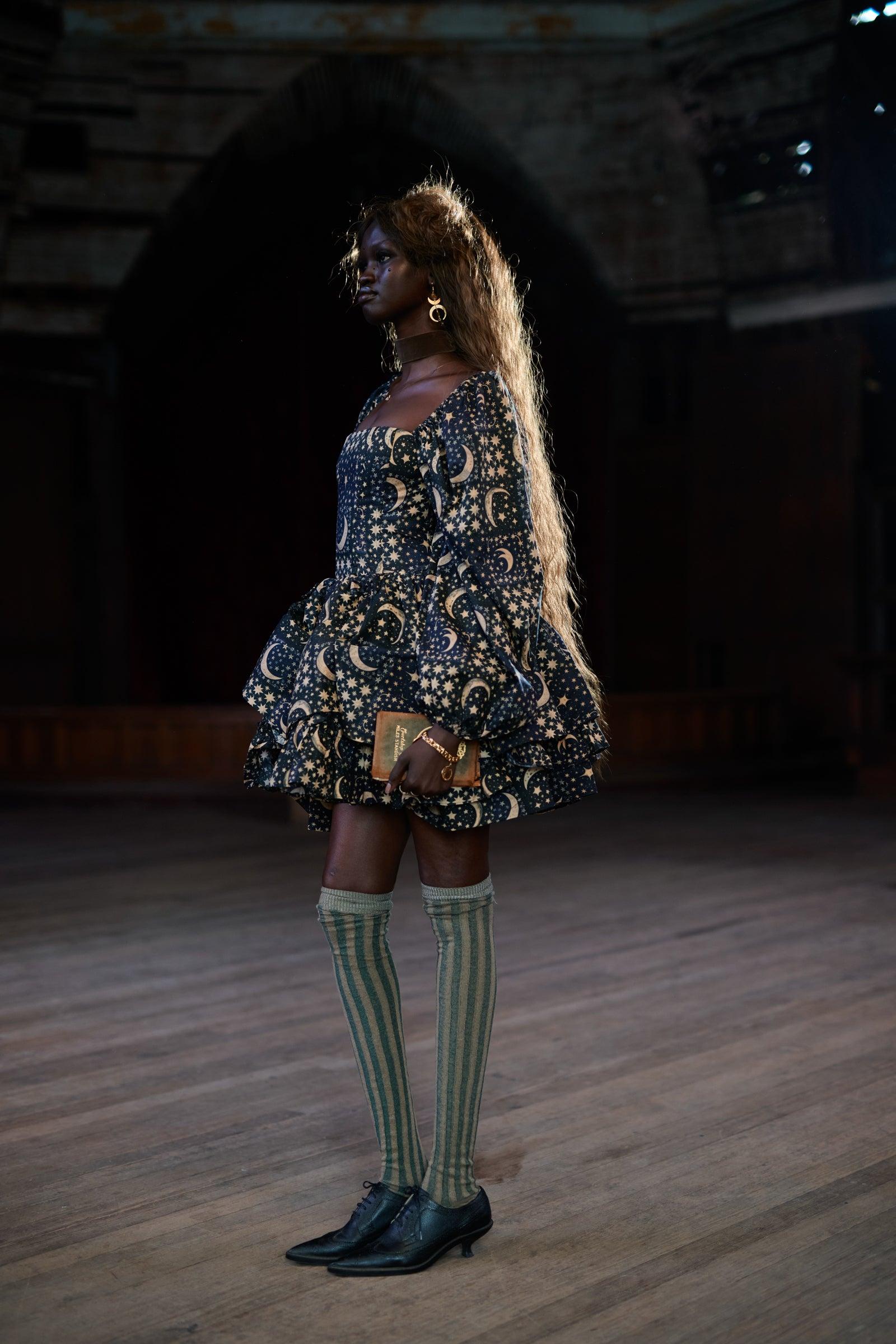 In a hue as deep black as the night sky over an Edwardian observatory, this cotton dress brings celestial charm to any occasion. The boned and drop-waist silhouette recalls the elegance of pioneering female astronomers, while long puff sleeves add a touch of drama. Two layers of tiered pleats cascade like the milky way, with faux horsehair at the hem for a touch of structure. Bustle the top layer with ease using the adjustable drawstrings - ideal for transitioning from an afternoon lecture on planetary movements to an evening of stargazing through the grand telescope. Paper cotton drop-waist mini dress Long elastic puff sleeves Boning at waist Two layers of tiered pleated skirt and faux horsehair at hem for structure Top skirt layer bustles with adjustable drawstrings Center back invisible zipper closure Fully lined To ensure the best fit, measure your across bust and high waist before ordering and steam for optimal beauty. Diana is 5’11” and wearing a size XXS in Selkie. Her measurements are 31” bust, 22” waist, 34” hip. Fabric: 100% Paper Cotton Lining: 100% Cotton
