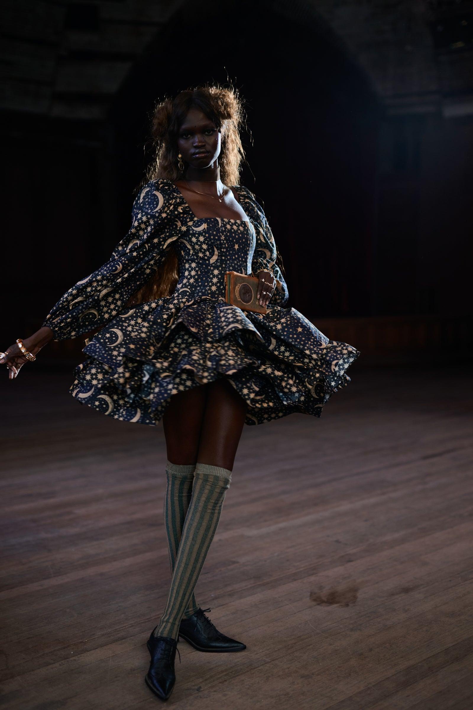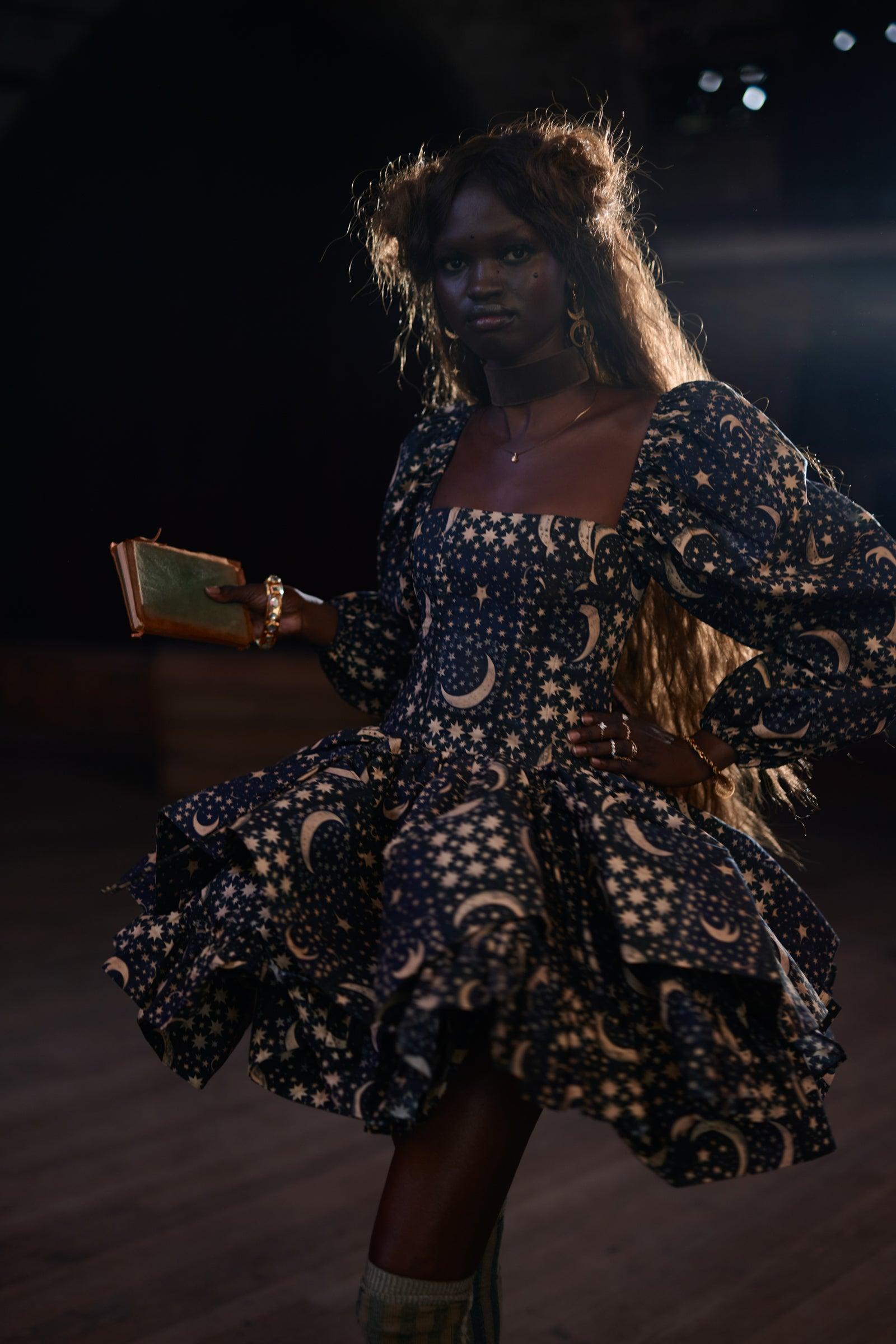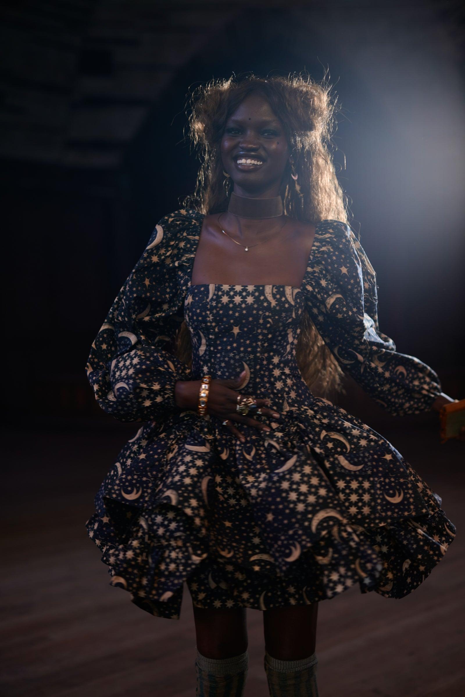 In a hue as deep black as the night sky over an Edwardian observatory, this cotton dress brings celestial charm to any occasion. The boned and drop-waist silhouette recalls the elegance of pioneering female astronomers, while long puff sleeves add a touch of drama. Two layers of tiered pleats cascade like the milky way, with faux horsehair at the hem for a touch of structure. Bustle the top layer with ease using the adjustable drawstrings - ideal for transitioning from an afternoon lecture on planetary movements to an evening of stargazing through the grand telescope. Paper cotton drop-waist mini dress Long elastic puff sleeves Boning at waist Two layers of tiered pleated skirt and faux horsehair at hem for structure Top skirt layer bustles with adjustable drawstrings Center back invisible zipper closure Fully lined To ensure the best fit, measure your across bust and high waist before ordering and steam for optimal beauty. Diana is 5’11” and wearing a size XXS in Selkie. Her measurements are 31” bust, 22” waist, 34” hip. Fabric: 100% Paper Cotton Lining: 100% Cotton