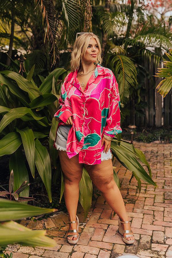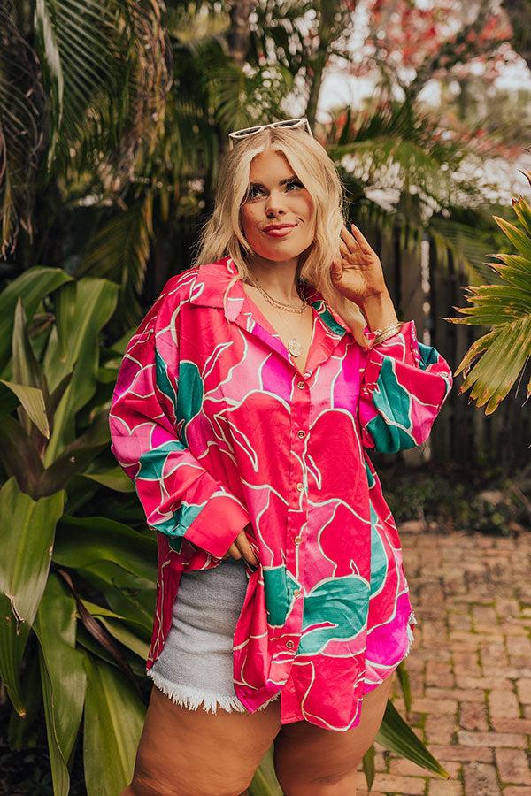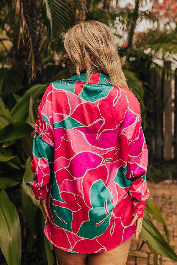 - Be a bold beauty with this vibrant top! - Unlined material with a green, pink, and purple hued abstract print and a satin finish - A collared v-cut neckline - A button closure front - Long, loose sleeves with button closure cuff - A relaxed silhouette that ends in a rounded hemline with side slit accents