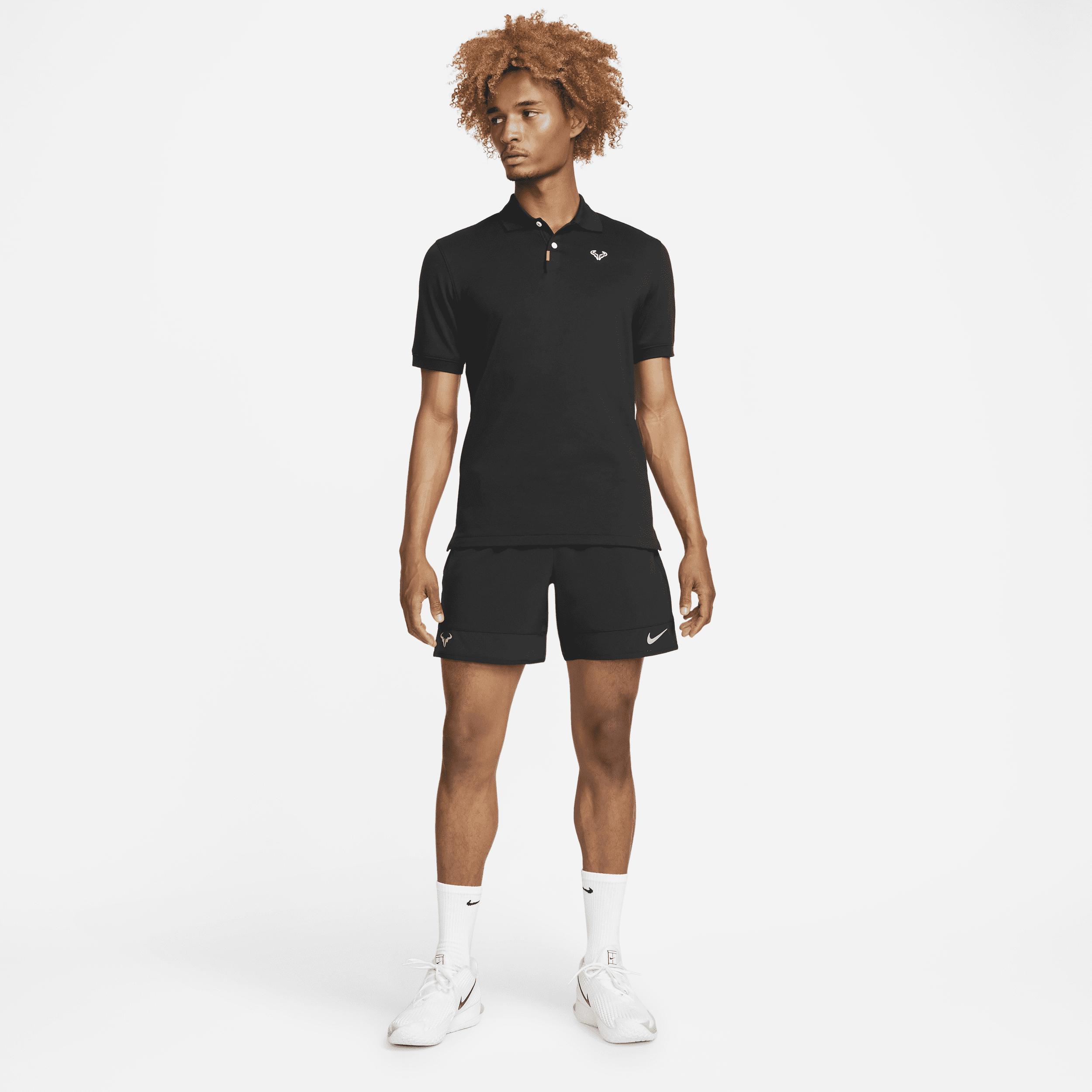 A CLASSIC REMADE THE NIKE WAY. This isn�t your average polo�it�s The Nike Polo. Every detail, from its innovative, sweat-wicking fabric to the hints of orange that nod to Nike�s original shoebox, has been thoughtfully crafted to meet the needs of the everyday you. The result is a street-ready style that looks at home on the course, the court and everywhere else. Rafa's bull logo is featured on the chest. This product is made with 100% sustainable materials, using a blend of both recycled polyester and organic cotton fibers. The blend is at least 10% recycled fibers or at least 10% organic cotton fibers. Crafted and Obsessed: Premium details, from the Jacquard fabric to the breathable design, create street-ready style that�s also built for the course or court. Dry Design: Breathable knit fabric with Dri-FIT technology helps you stay dry and comfortable in warm weather. Nike DNA: An orange label on the placket, orange thread on the top button, and a Swoosh logo under the back collar infuse your look with heritage style. More Benefits: Longer back hem and side vents let you wear the polo untucked for a more casual look. Embroidered eyelets at each underarm enhance airflow. Product Details: Slim fit for a tailored feel. Fold-over collar. 2-button placket. 65% cotton/35% polyester. Machine wash. Imported. Style: DD8532; Color: Black/White; Size: M; Gender: Male; Age Group: Adult | The Nike Polo Rafa Men's Slim-Fit Polo in Black, Size: Medium | DD8532-010