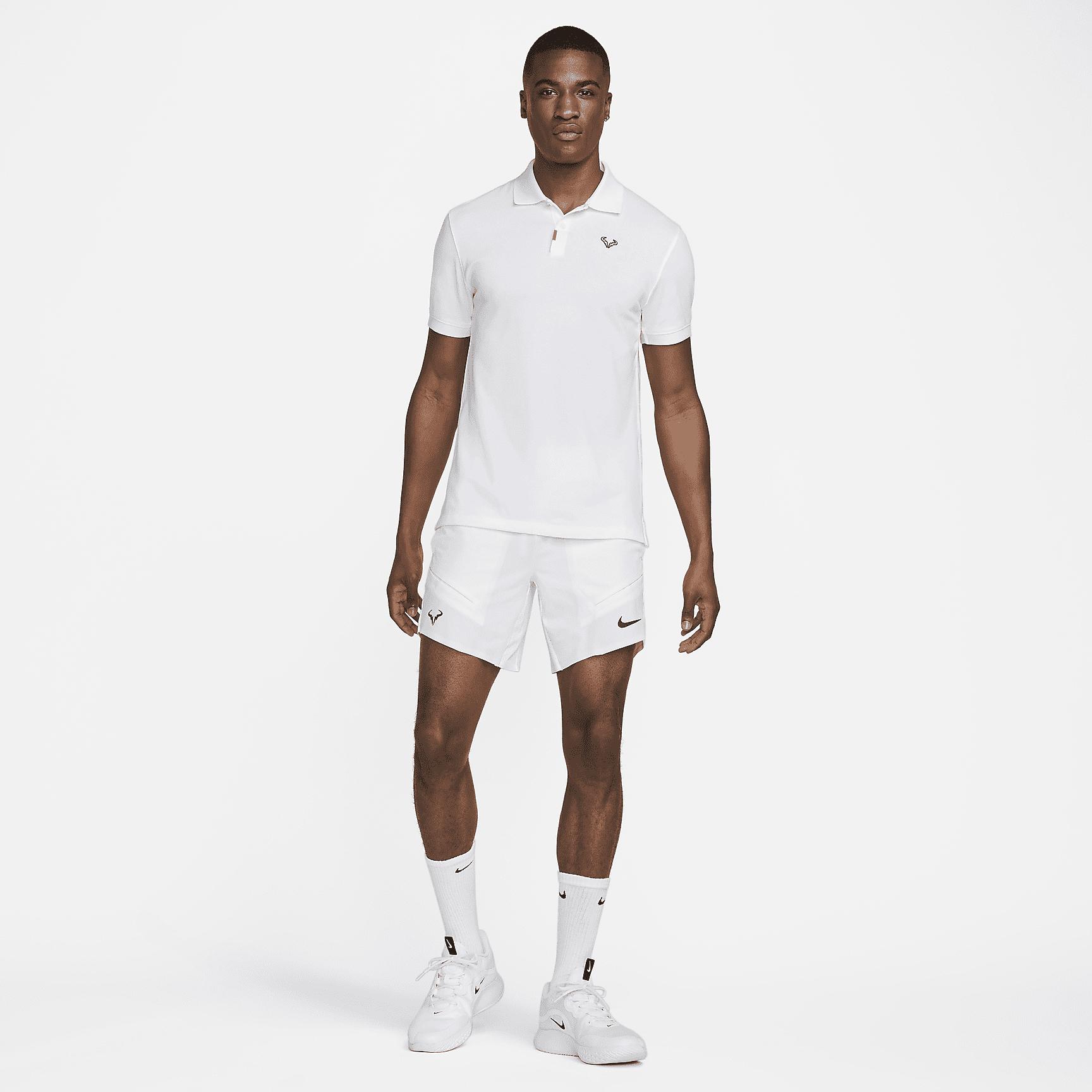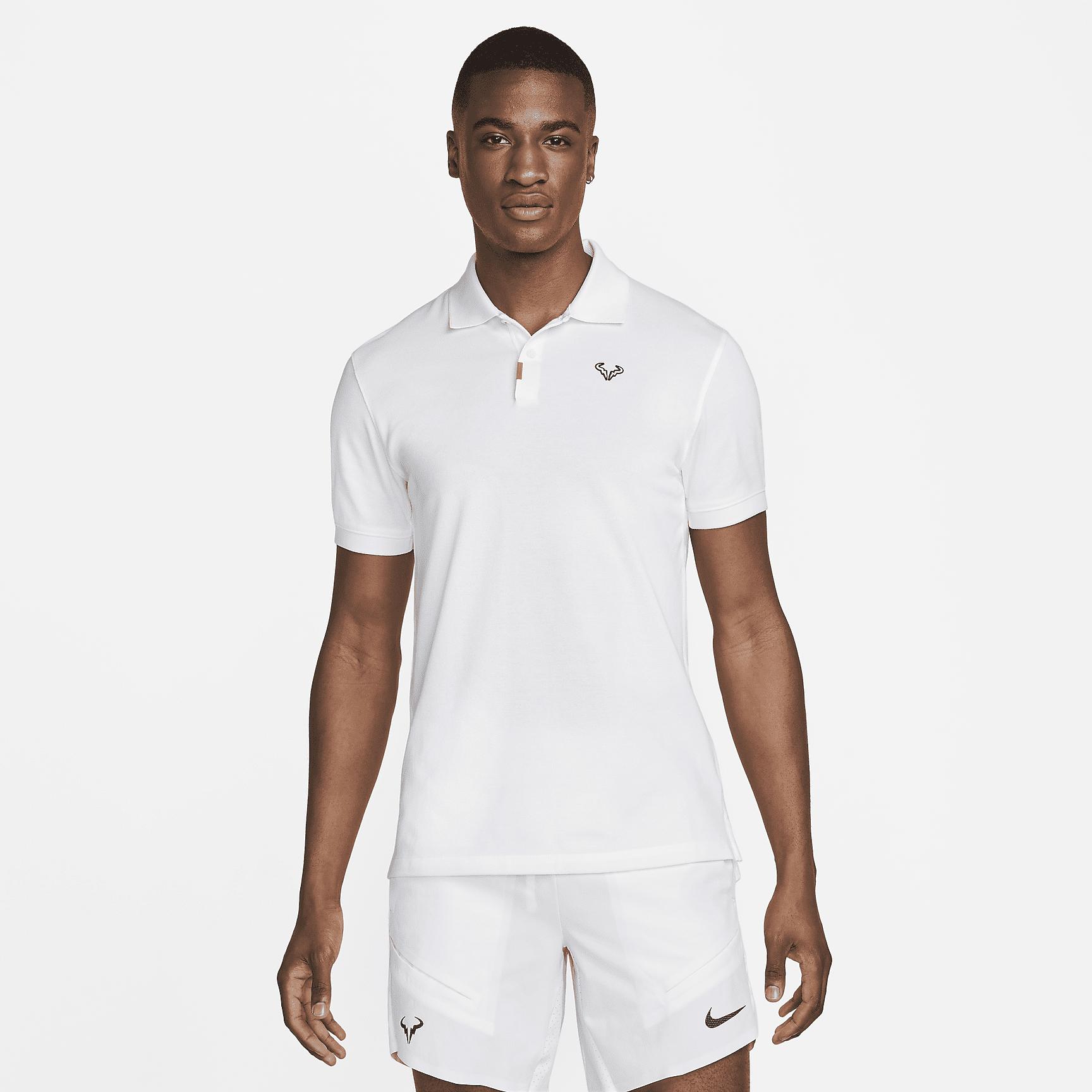 A CLASSIC REMADE THE NIKE WAY. This isn�t your average polo�it�s The Nike Polo. Every detail, from its innovative, sweat-wicking fabric to the hints of orange that nod to Nike�s original shoebox, has been thoughtfully crafted to meet the needs of the everyday you. The result is a street-ready style that looks at home on the course, the court and everywhere else. Rafa's bull logo is featured on the chest. This product is made with 100% sustainable materials, using a blend of both recycled polyester and organic cotton fibers. The blend is at least 10% recycled fibers or at least 10% organic cotton fibers. Crafted and Obsessed: Premium details, from the Jacquard fabric to the breathable design, create street-ready style that�s also built for the course or court. Dry Design: Breathable knit fabric with Dri-FIT technology helps you stay dry and comfortable in warm weather. Nike DNA: An orange label on the placket, orange thread on the top button, and a Swoosh logo under the back collar infuse your look with heritage style. More Benefits: Longer back hem and side vents let you wear the polo untucked for a more casual look. Embroidered eyelets at each underarm enhance airflow. Product Details: Slim fit for a tailored feel. Fold-over collar. 2-button placket. 65% cotton/35% polyester. Machine wash. Imported. Style: DD8532; Color: White/Black; Size: XL; Gender: Male; Age Group: Adult | The Nike Polo Rafa Men's Slim-Fit Polo in White, Size: XL | DD8532-100