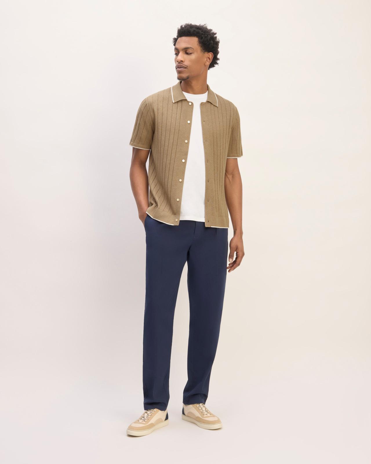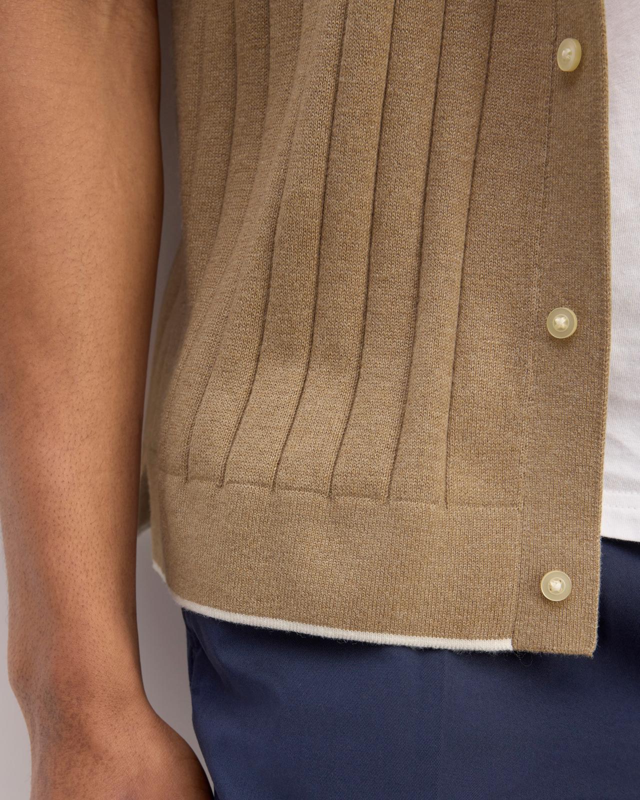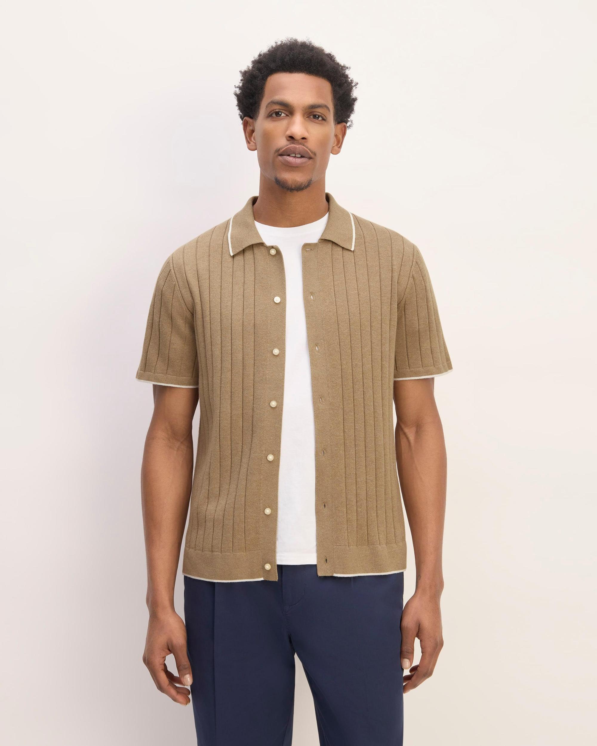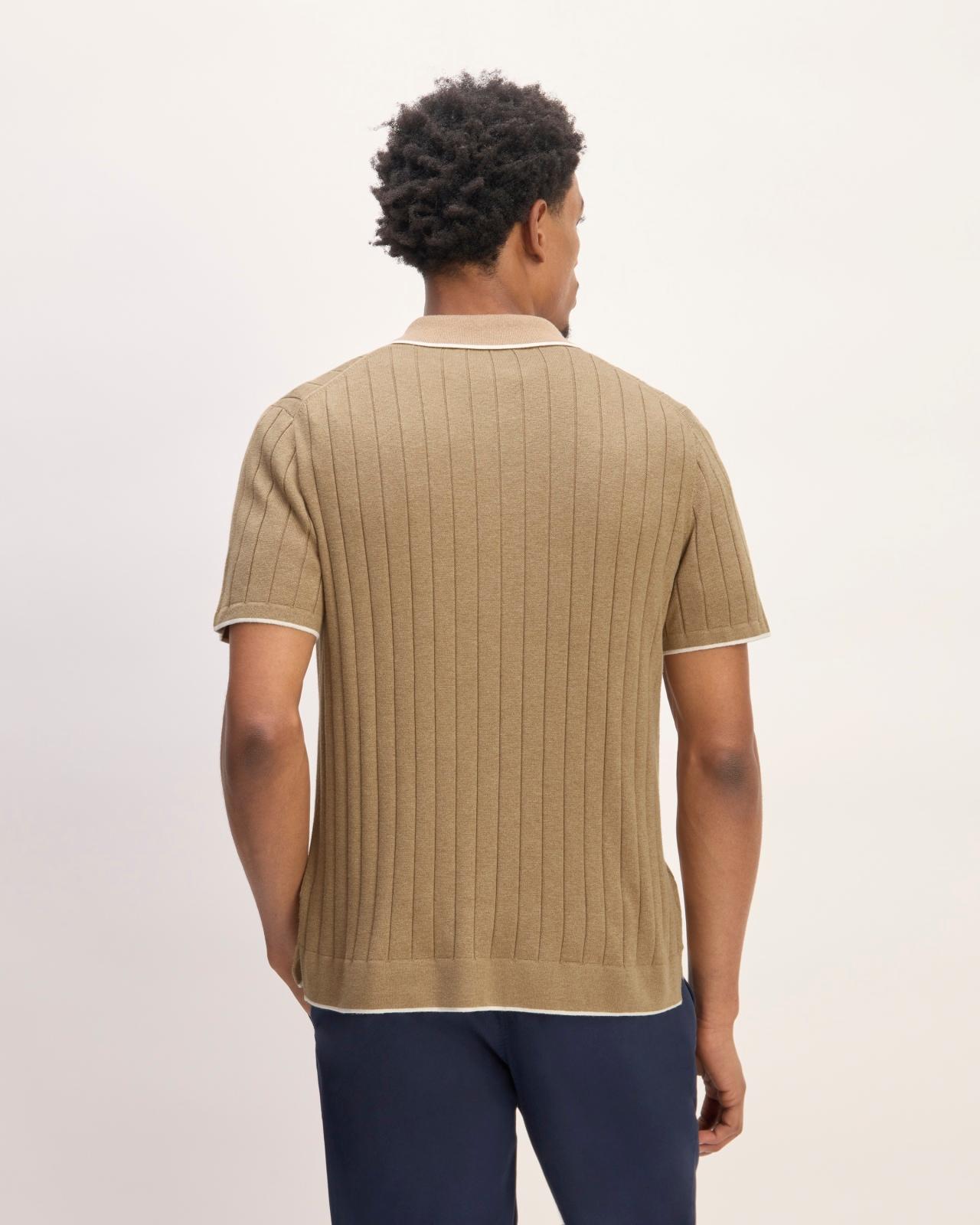 About This Style. This piece features a slim polo top in a textured sweater knit fabric short sleeves button-front placket and made of a blend of 60% organic cotton and 40% ecomade coolmax materials. Did You Know? Organic cotton uses crop rotation cover crops and organic fertilizers instead of toxic chemical fertilizers or pesticideswhich means cleaner water lower water usage lower pesticide use healthier soil and a safer working environment for cotton farmers compared to conventional cotton. Mens No-Sweat Button-Down Polo Sweater by Everlane in Dark Heathered Camel, Size XXL