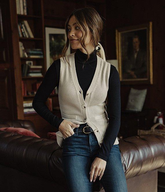 From The Normal Brand, this tank features: Texture chunky 3GG knit fabrication Tank silhouette V-neckline Sleeveless Front welt pockets Ribbed bottom band Fitted fit Straight hemline Button front closure Viscose/cotton/3GG Hand wash Imported.