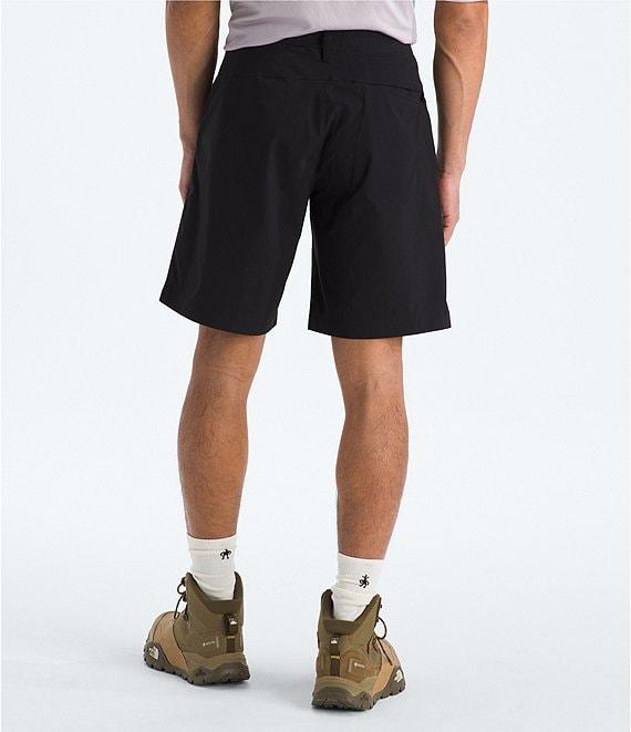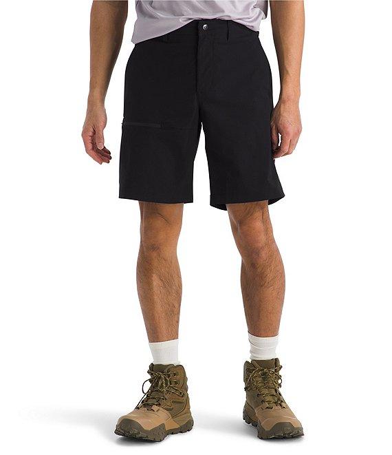 From The North Face, these shorts feature: Waistband with belt loops Zip-fly with a snap closure Open hand pockets Secure-zip thigh pocket Drop-in back pocket Heat transfer logo on left thigh Crotch gusset for mobility Pockets have mesh lining for breathability Inseam 9" Non-PFC DWR finish for added water repellency Recycled nylon/elastane Machine wash/tumble dry Imported.