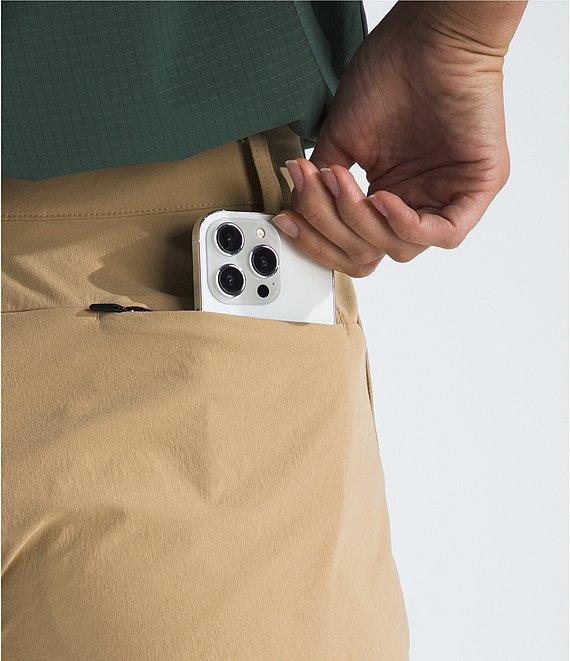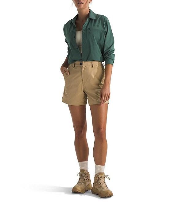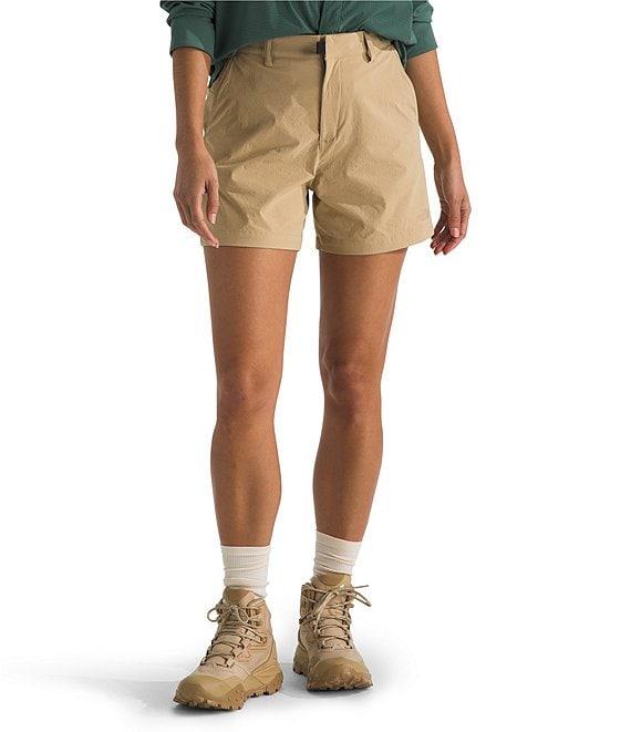 From The North Face, these shorts feature: Stretch fabrication Open hand pockets Non-PFC DWR finish for added water repellency FlashDry materials offer enhanced moisture Heat transfer logo on left thigh Regular fit Waistband with belt loops Zip-fly with hidden snap-tab closure Secure-zip back pocket Pockets have mesh lining for breathability Approx. 5" inseam Recycled nylon/elastane Machine washable Imported.
