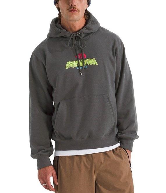 From The North Face, this hoodie features: Relaxed fit Darted hood with a drawcord for adjustability Crew neck Long sleeves Logo and graphics on the front and back Front kangaroo pocket Ribbed cuffs and hem Pullover construction Solid body of climate conscious cotton/recycled cotton/recycled polyester; solid rib of climate conscious cotton Machine wash/tumble dry Imported.
