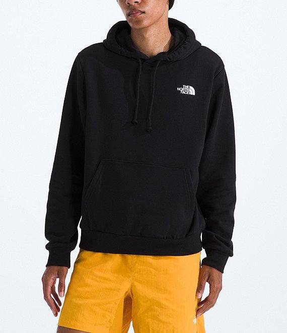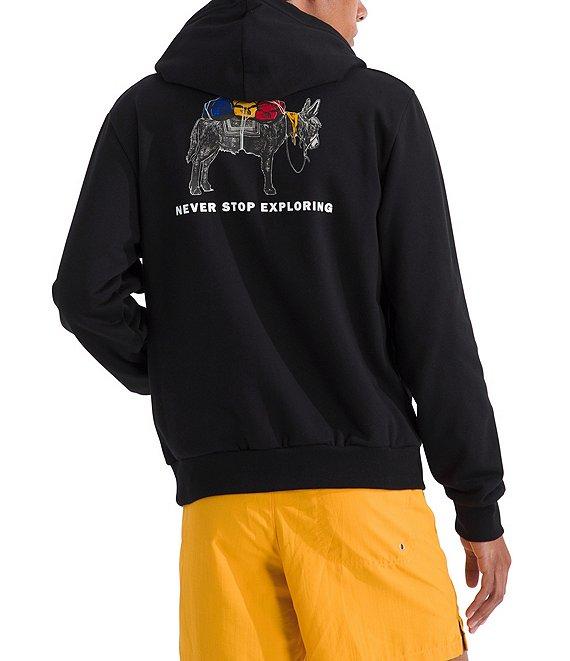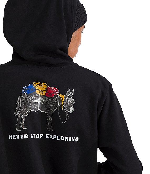 From The North Face, this hoodie features: Two-piece hood with a drawcord for adjustability Front kangaroo pocket Donkey graphic with "Never Stop Exploring" verbiage printed on the back Ribbed cuffs and hem Pullover construction Regular fit Body of cotton/polyester; rib of cotton/elastane Machine wash/tumble dry Imported.