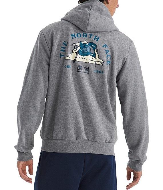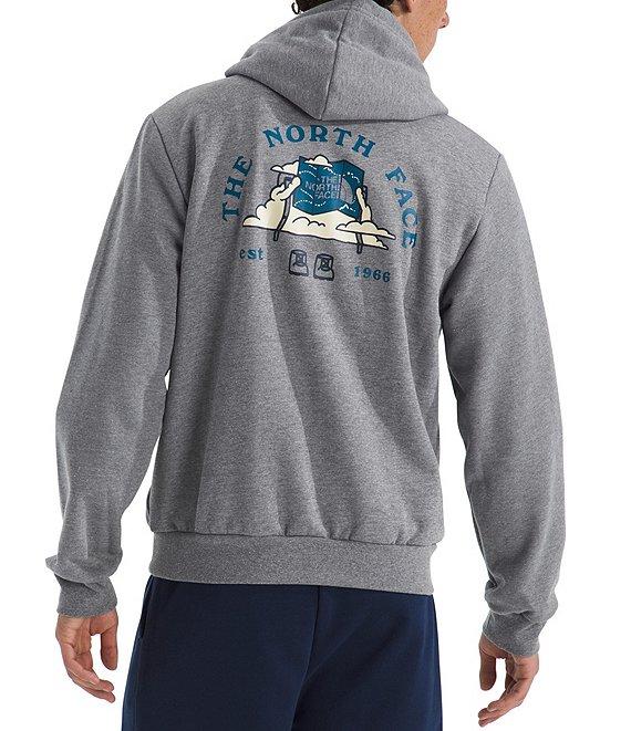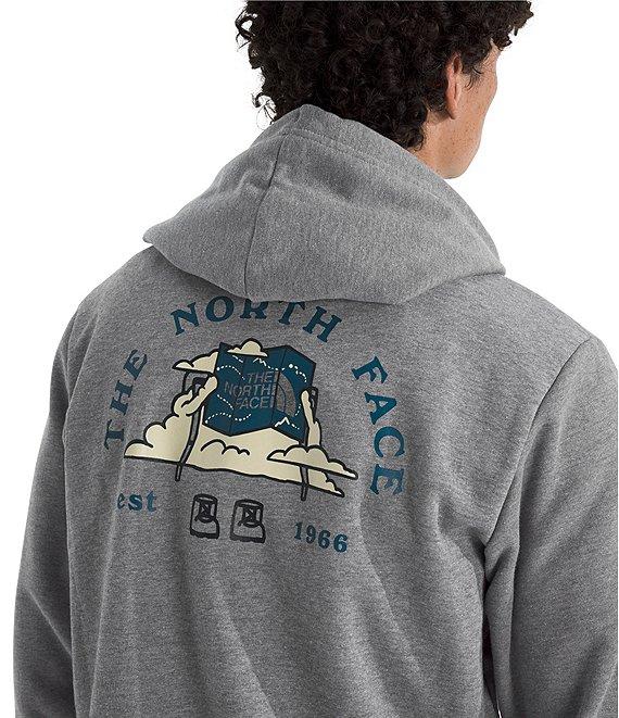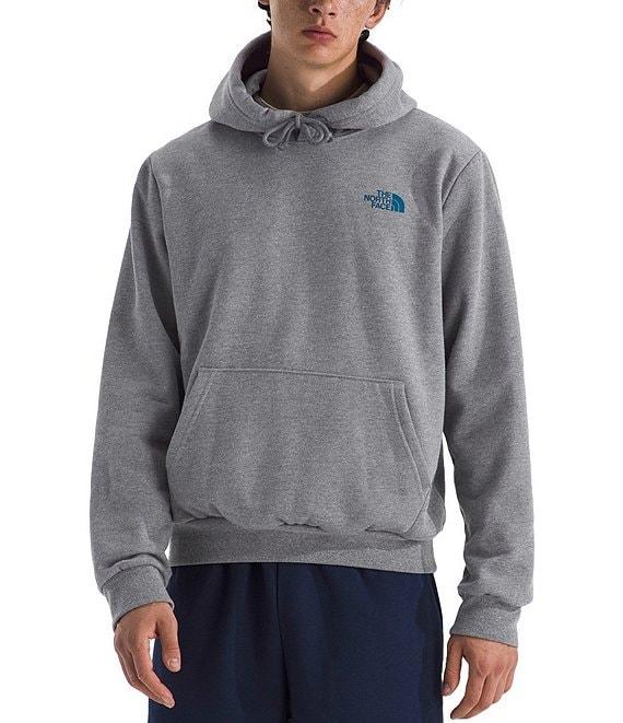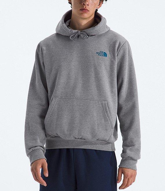 From The North Face, this hoodie features: Two-piece hood with a drawcord for adjustability Long sleeves Ribbed cuffs and hem Kangaroo hand pocket "The North Face" logo, graphic design on the back and verbiage on the back Regular fit Heathered body of polyester/cotton; rib of cotton/polyester/elastane Machine wash/tumble dry Imported.