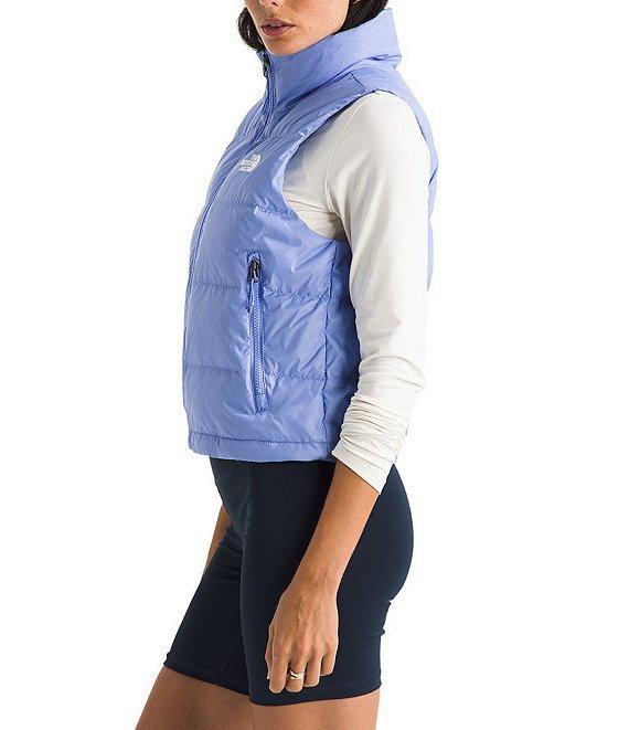 From The North Face, this vest features: Relaxed fit Stand collar neckline Sleeveless Exposed-zip hand pockets Non PFW DWR finish for added water repellent Embroidered logo on left chest and back-right shoulder Fully lined Straight hemline with internal drawcord with cord locks Exposed center front zip with an internal draft flap closure Approx. 19.75" length Recycled polyester/recycled nylon; lining: recycled polyester; fill: 600-fill recycled waterfowl down Machine wash/tumble dry Imported.