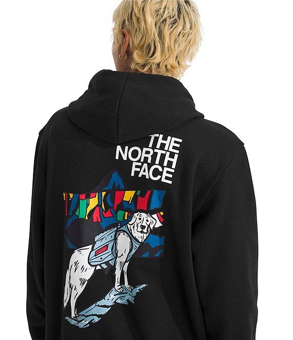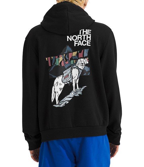 From The North Face, this hoodie features: Two-piece hood with a drawcord for adjustability Long set-in sleeves Front kangaroo pocket Logo print on the chest "The North Face" logo and a dog graphic printed on the back Circular design Pullover construction Regular fit Solid body of Climate Conscious Cotton/recycled polyester; solid rib of Climate Conscious Cotton/elastane Machine wash/tumble dry Imported.