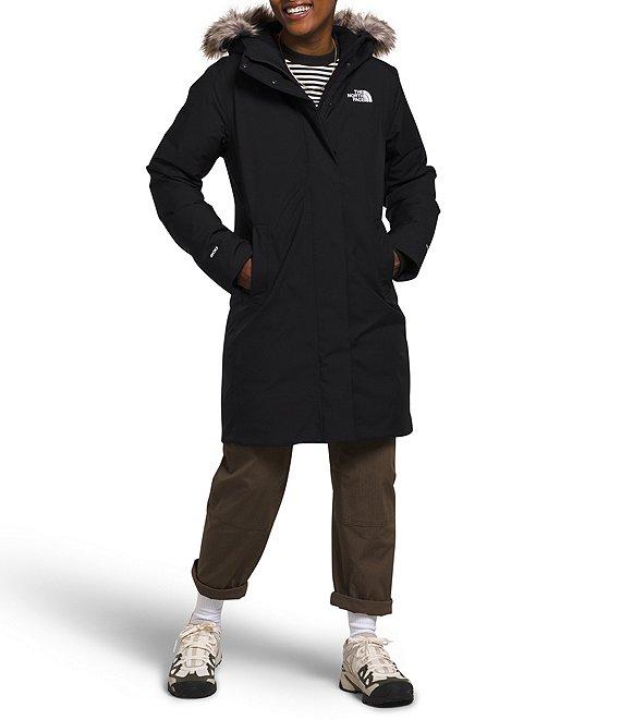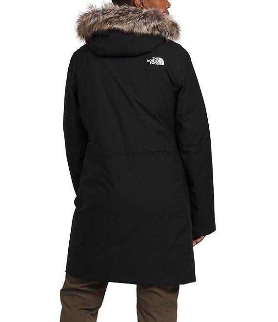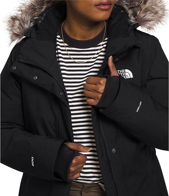 From The North Face, this parka features: Standard fit Attached, adjustable hood with zip-off faux fur trim Stand collar Long sleeves with internal thumbhole cuffs Interior shock cord at waistband for adjustability Waterproof Fully lined Seam-sealed DryVent 2L shell Non-PFC DWR durable water-repellent finish Heat transfer logo on left chest and back right shoulder Secure-zip welt hand pockets Storm flap with snap center front zip closure Approx. 35.25" length Recycled polyester taffeta: lining: recycled polyester; fill: 600-fill recycled waterfowl down Machine wash/tumble dry Imported.