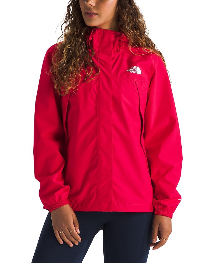 The North Face Womens Antora Rain Jacket.Color:Hibiscus.Size:L.Material:Body: 75D 128 g/m DryVent 2L-100% polyester ripstop with non-PFC durable water-repellent (non-PFC DWR) finish; body lining: 50 g/m 100% polyester mesh; hood/sleeve and pocket lining: 75D 66 g/m 100% polyester taffeta.Jackets.