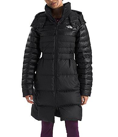 From The North Face, this parka features:Slim fit Attached hood with storm flap and inner collar with hidden-snap closureRaglan sleeves Adjustable waistbandReverse-coil zip hand pocketsBeltedHeat seeker Eco synthetic insulation in draft flap, waistband, and beltHollow-core fibers for added warmthNon PFC DWR finish Fully lined Straight hemline Exposed two-way VISLON center front zip with internal draft flapApprox. 37 lengthRecycled polyesterFill: 600-fill recycled waterfowl downMachine wash/tumble dry Imported.
