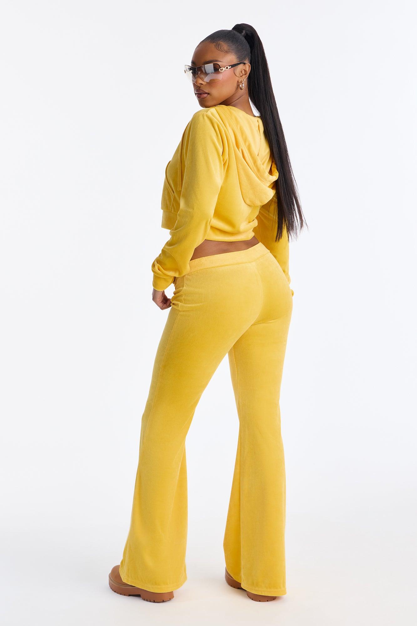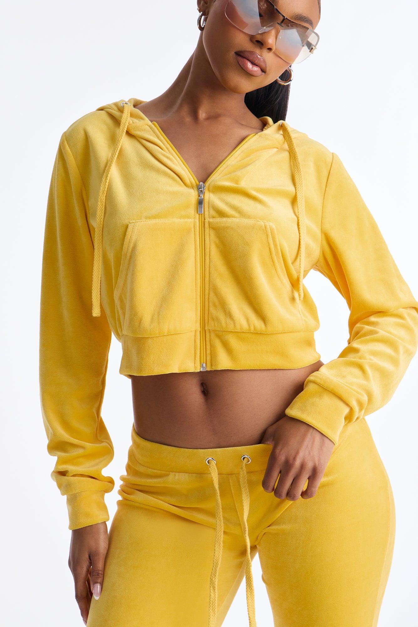 Available In Grey And Yellow. 2 Piece Ensemble Cropped Zip Up Hoodie And Low Rise Velour Pant Set Stretch Inseam 33" Elastic Waistband Low Rise Pockets Top / Bottom Self: 100% Polyester Imported California Proposition 65WARNING: Cancer and Reproductive Harm - www.P65Warnings.ca.gov.