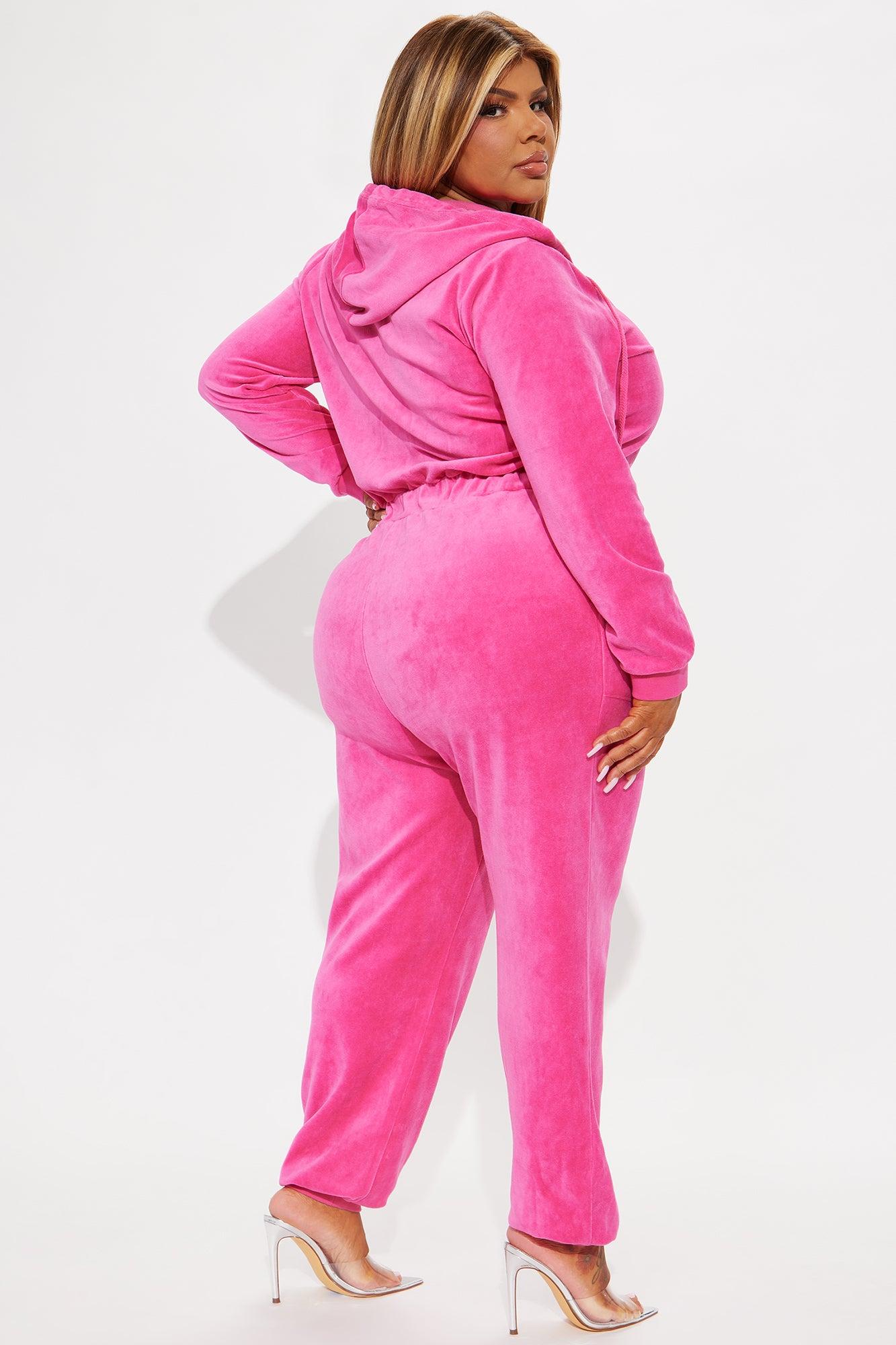 Available In Black And Pink. Velour Jumpsuit Hooded Front Zipper Drawstring Long Sleeve Elastic Waistband Side Pockets Jogger Leg Stretch Inseam 29" Self: 80% Cotton 20% Polyester Contrast: 95% Cotton 5% Spandex Imported California Proposition 65WARNING: Cancer and Reproductive Harm - www.P65Warnings.ca.gov.