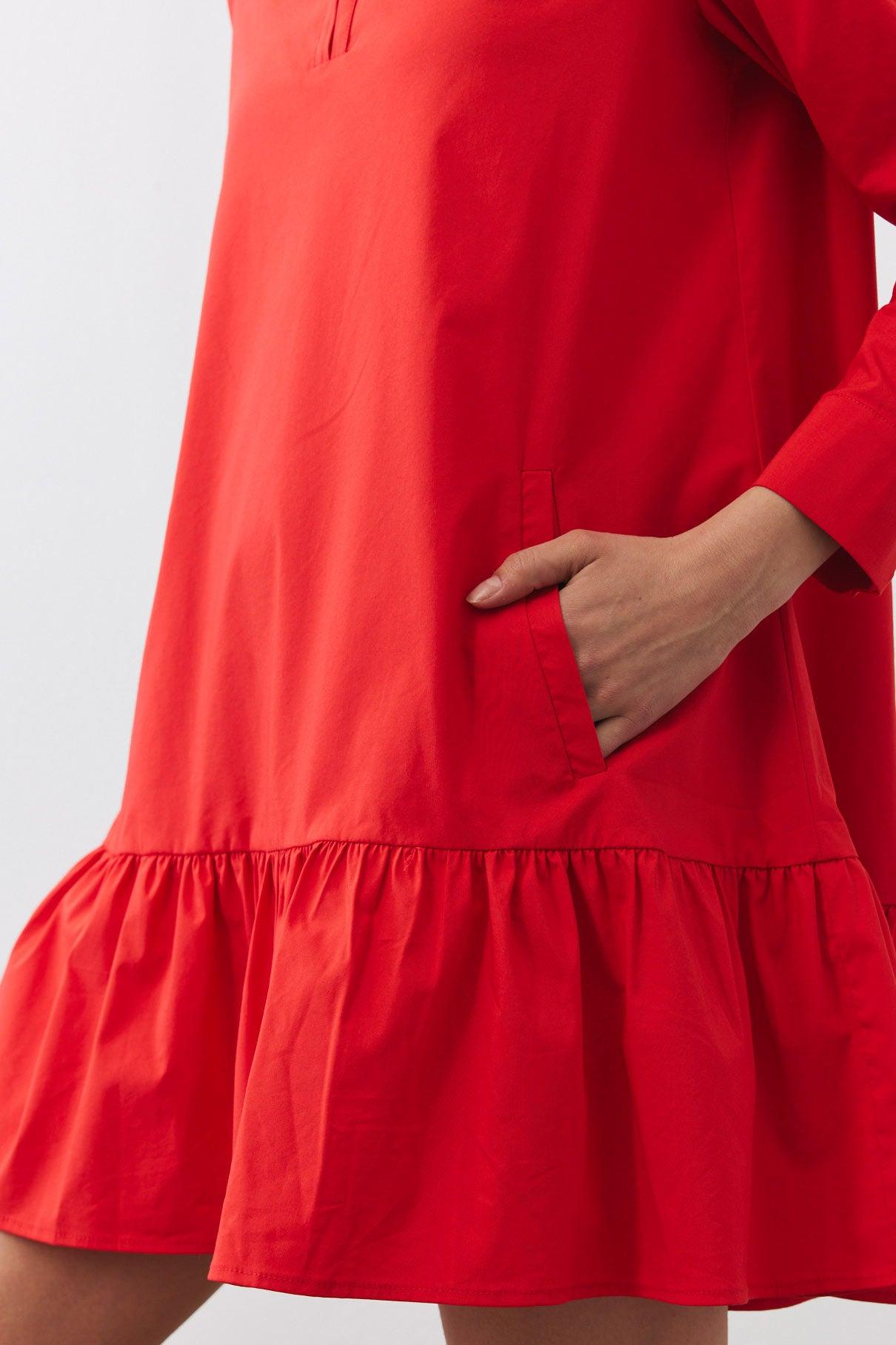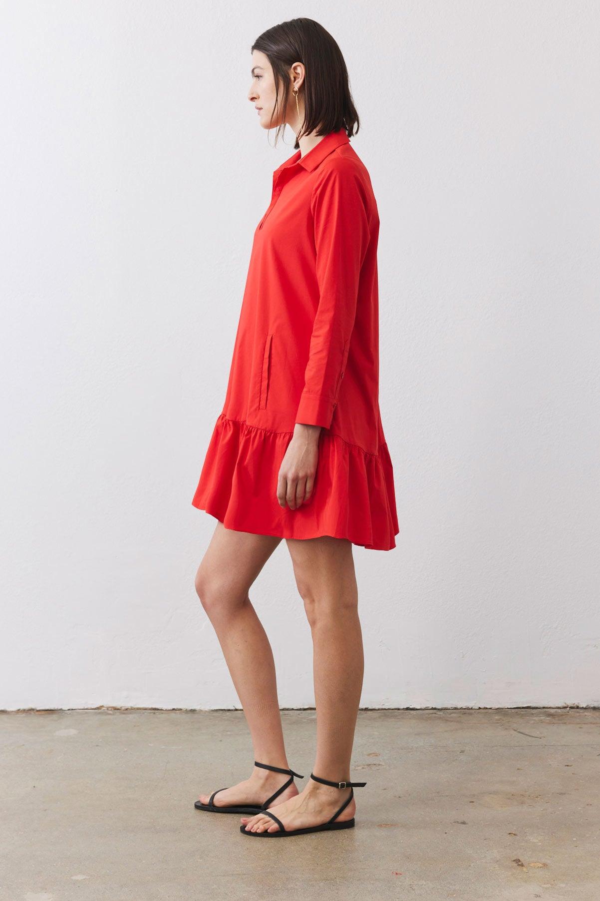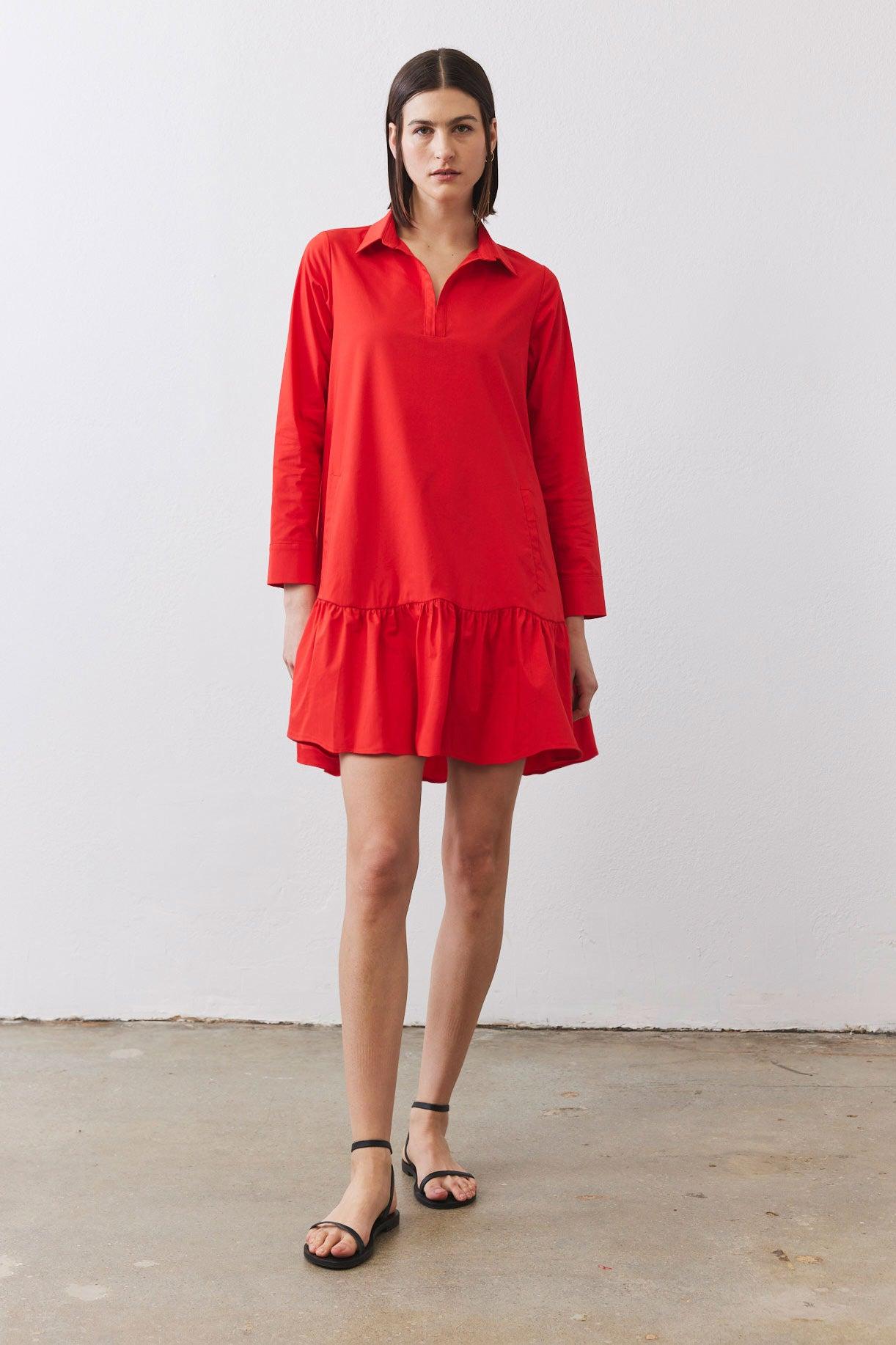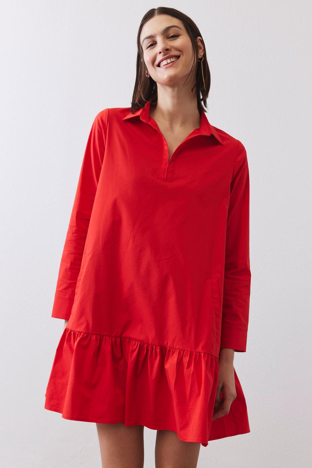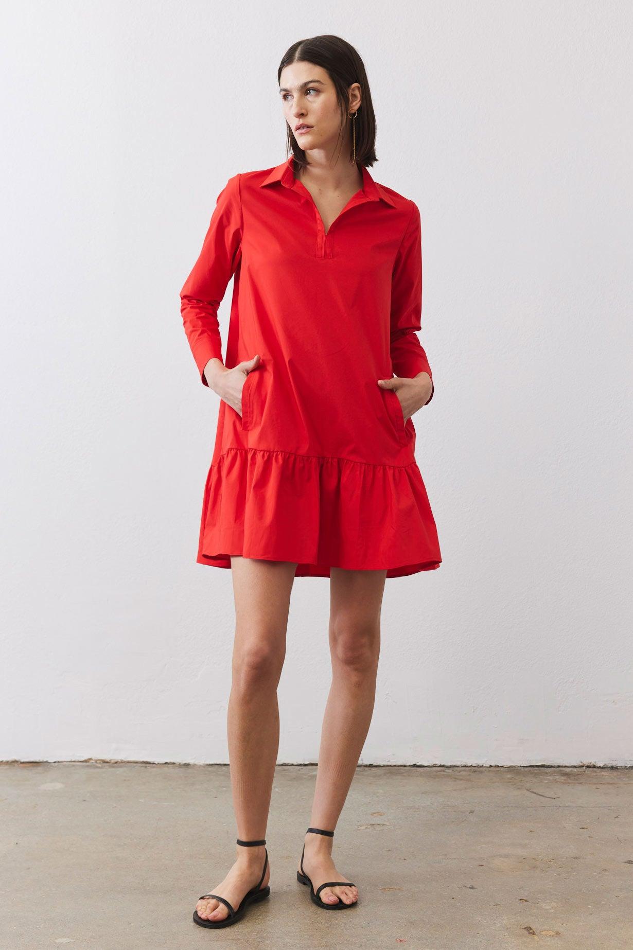 This dress combines effortless style with a relaxed silhouette, featuring a collared neckline, long sleeves, and a playful ruffled hem. Perfect for casual chic dressing, it offers a bold yet comfortable look. Collared neckline Long sleeves Ruffled hem Oversized fit