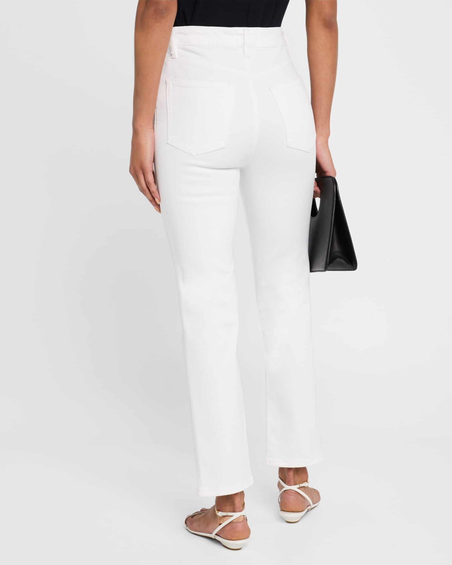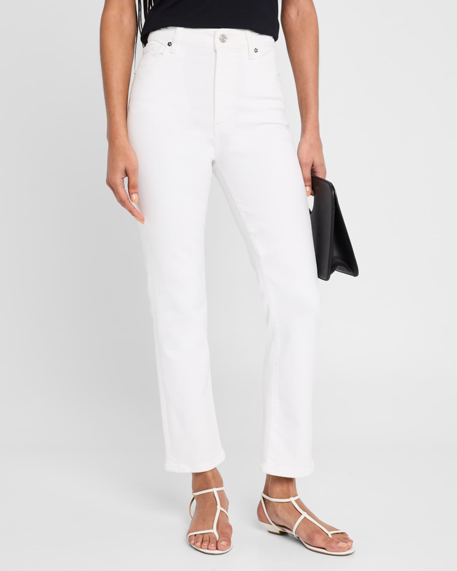 FRAME "The Pencil Crop" jeans in crisp white denim Approx. 11.3" rise; 27" inseam Mid-rise; sits high on the hip Five-pocket style Slim, straight legs Cropped length Button/zip fly; belt loops Cotton/Promodal® rayon/elasterell-p Machine wash warm; dry flat Imported