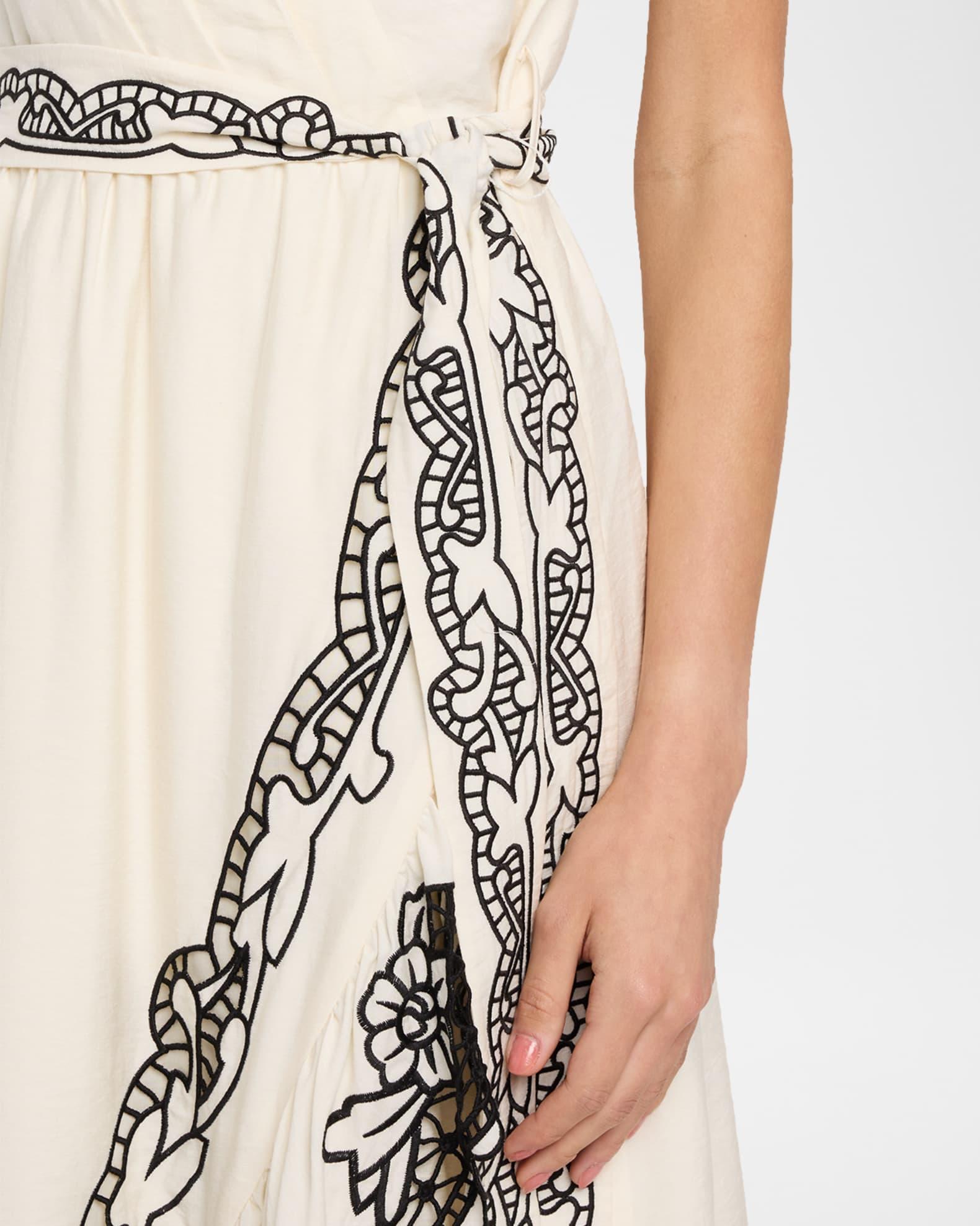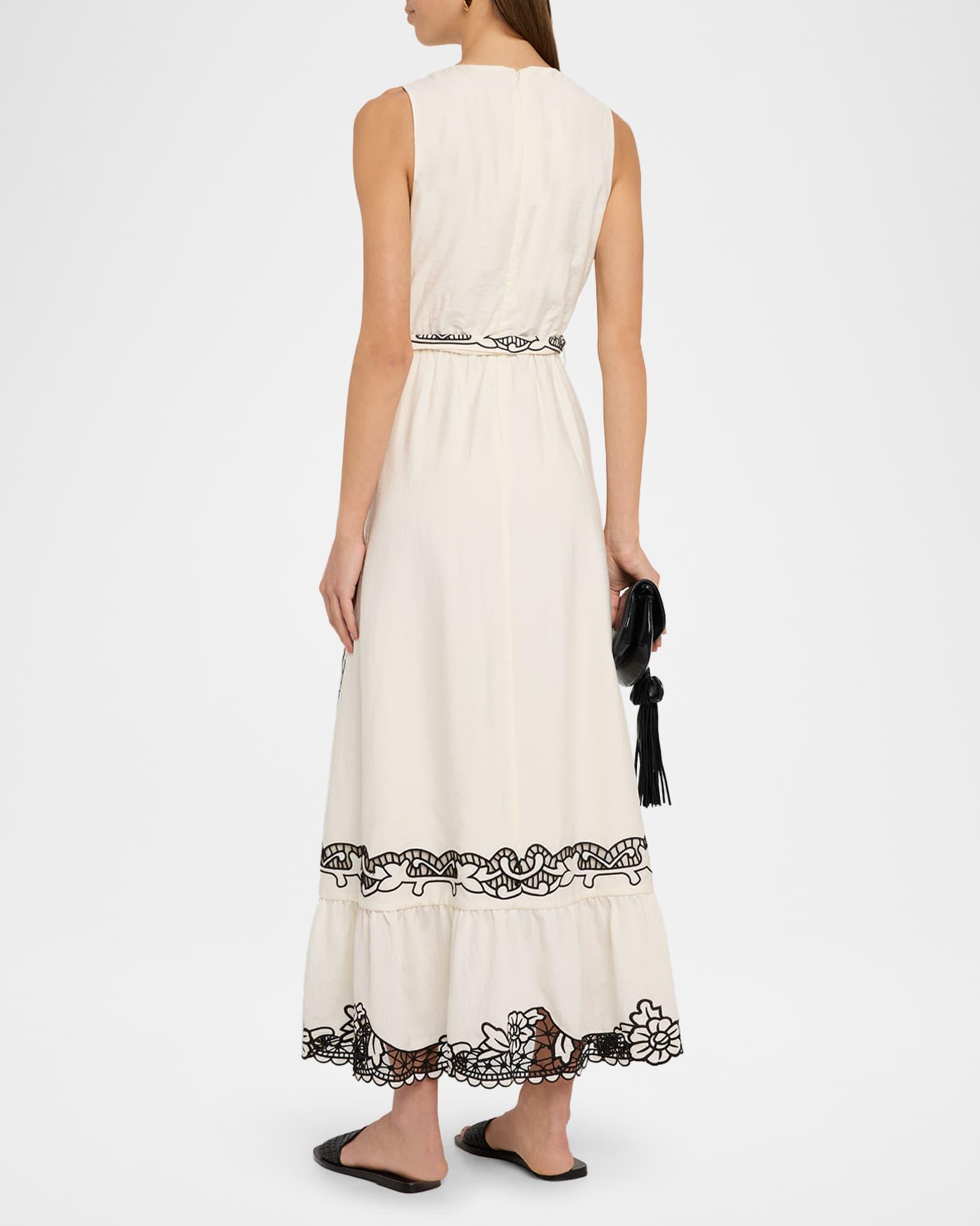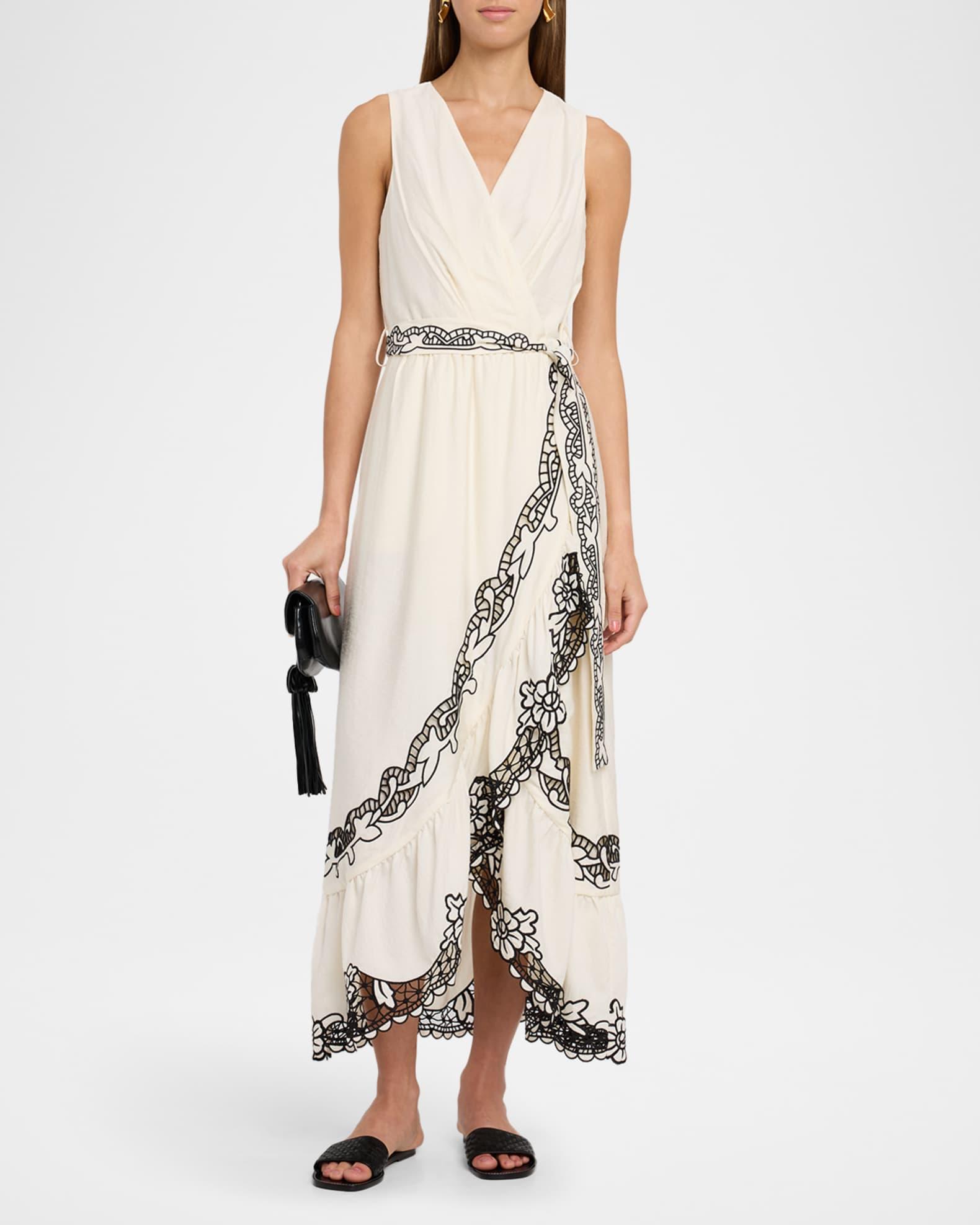 Elie Tahari "The Poppy" faux wrap maxi dress with contrast embroidery of vining florals, lattice lace, and scalloped detailing Approx. 48"L from shoulders to hem Surplice neckline Sleeveless Waist self-tie High-low hem Hem falls below the knee A-line silhouette Invisible back zipper Linen/Amni® nylon Lining: Cotton Dry clean Imported