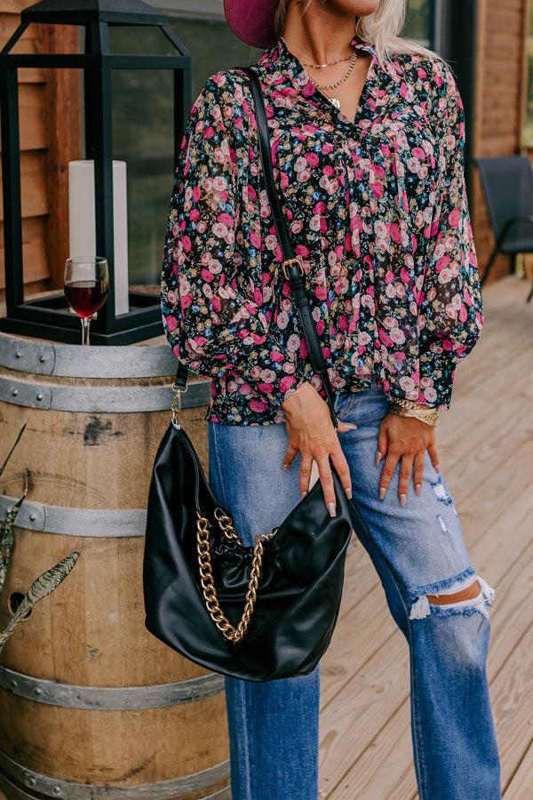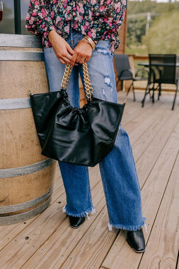 - Welcome this chic tote to your accessory collection this season! - Sleek faux leather material - Gold hardware - Chunky chain handles - A detachable adjustable faux leather shoulder strap - Three button closure and ruched elastic detail - A fully lined spacious interior with three additional pockets