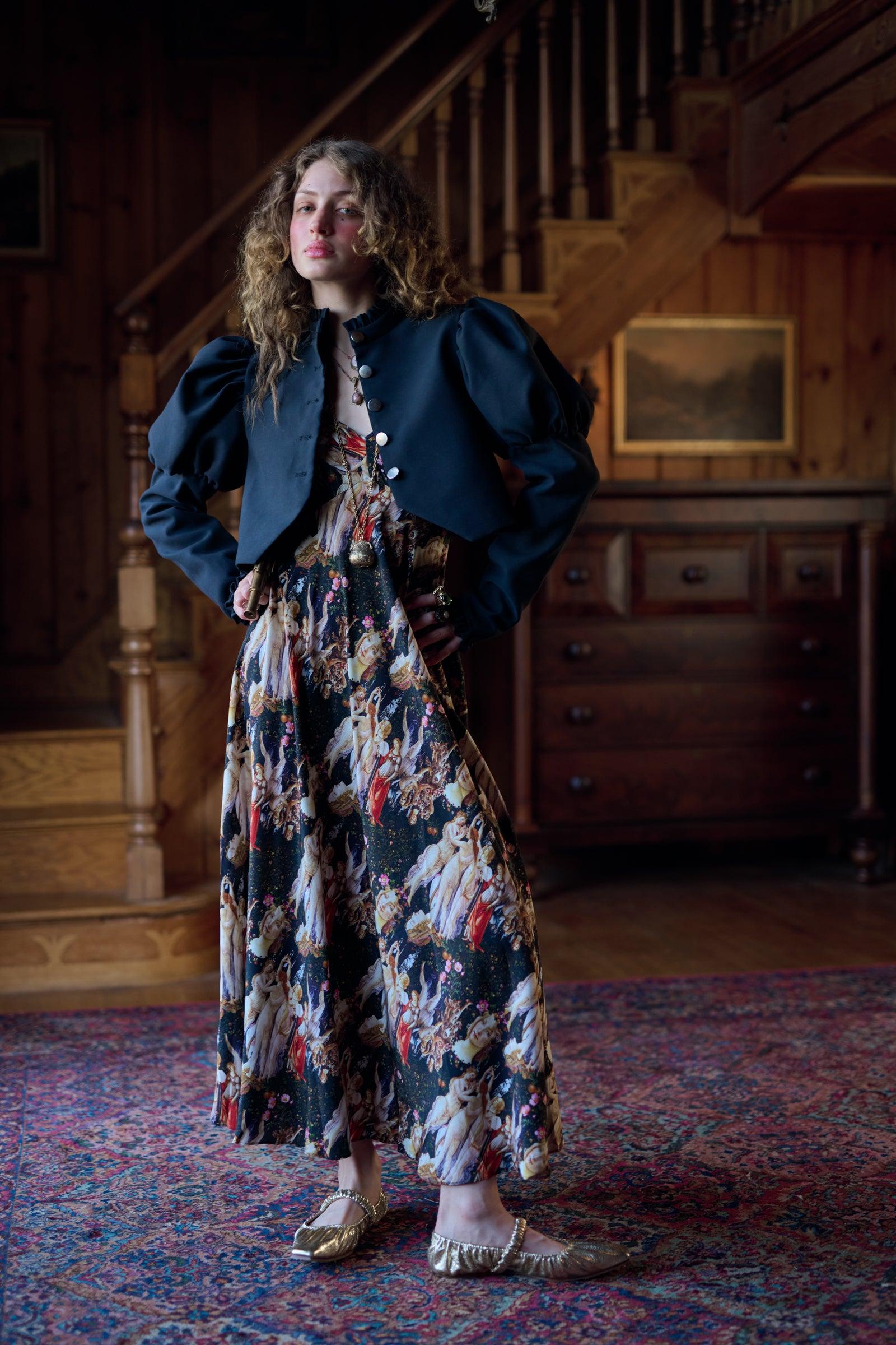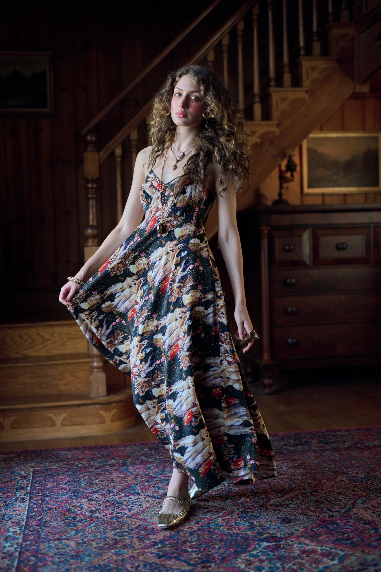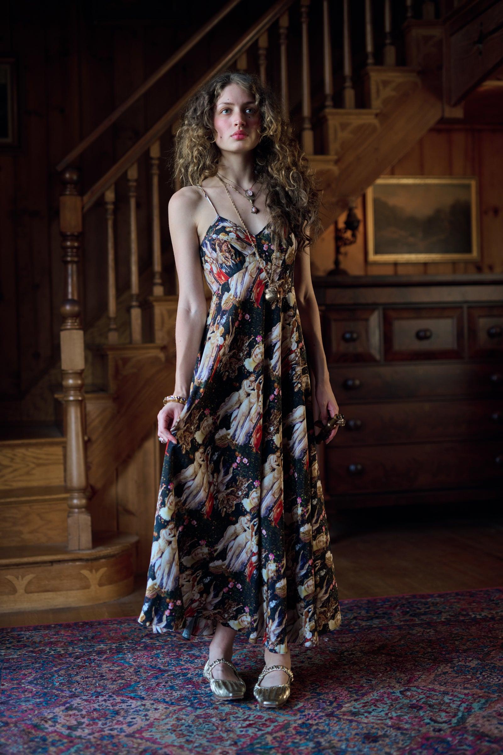 Float through Botticelli's divine garden in The Primavera Norma Jean Slip. Crafted from luxurious, matte opaque silk with a delightfully cool touch, it's cut on the bias to offer a natural, accommodating fit. The dress's subtle A-line silhouette adapts gracefully to various bust and tummy shapes, mimicking the fluid forms in Botticelli's timeless work. With its invisible zipper and fit-and-flare design accentuating all the right curves, you'll feel like a heavenly body worthy of a Renaissance painter’s masterpiece. Vintage silk fit and flare slip dress Thin adjustable straps Ankle length Unlined Side invisible zipper closure To ensure the best fit, measure your across bust and high waist before ordering and steam for optimal beauty. Sydney is 5’10” and wearing a size XS in Selkie. Her measurements are 31” bust, 24” waist, 34” hip. Fabric: Vintage Silk