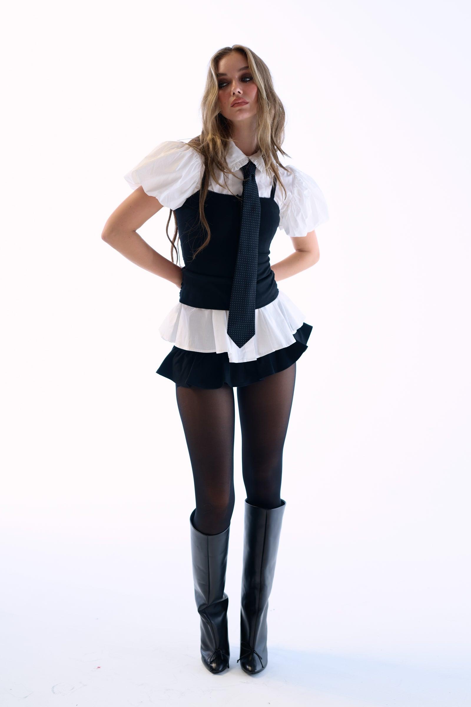 This Black Swan Dance Set reimagines classical dancewear for everyday elegance. This two-piece stretch cami features adjustable straps for the perfect fit and a mini skort showcasing power mesh paneling at the sides for breathable structure. This essential pairing creates a foundation as adaptable as it is beautiful—ready to complement everything in our collection or stand alone as a tribute to the disciplined art form that has captivated audiences for centuries. Style with the Black Swan French Ballet Tutu and Class Earhart Puffer to complete the look. Two-piece stretch cami and mini skort set Power mesh paneling at sides Adjustable straps To ensure the best fit, measure your across bust and high waist before ordering and steam for optimal beauty. Isabella is 5’5.5” and wearing a size XS in Selkie. Her measurements are 32” bust, 25” waist, 37” hip. Fabric: 68% Rayon, 28% Nylon, 4% Elastane