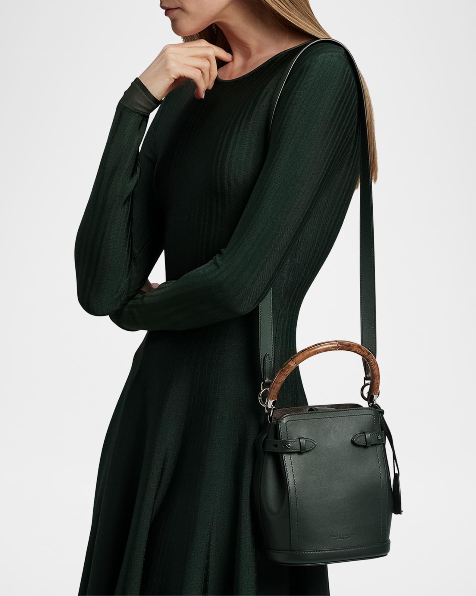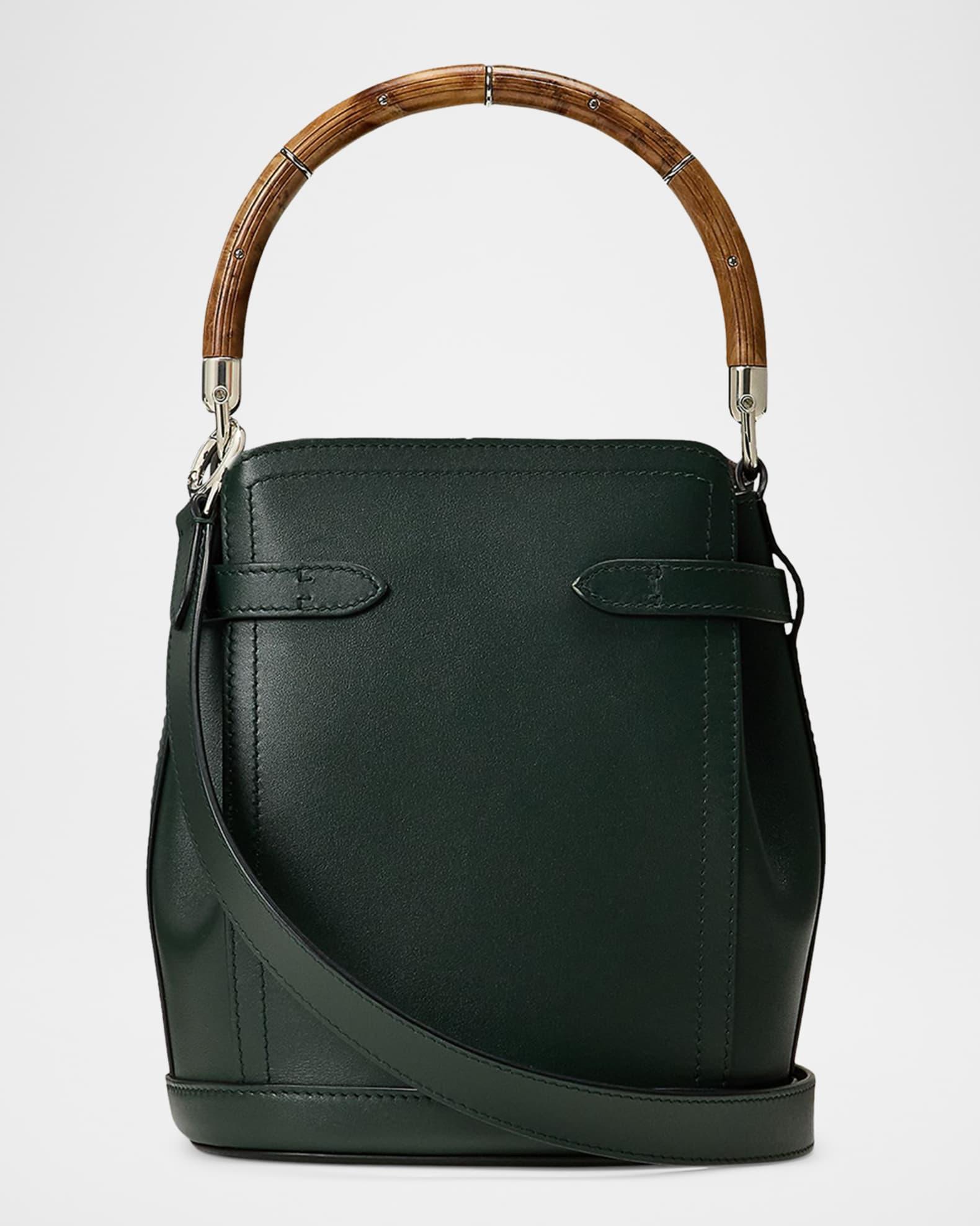 Ralph Lauren "The Ralph" small bucket bag crafted in full-grain calfskin leather Hand-carved burl wood and metal rounded top handle Detachable leather shoulder strap Can be worn as a top handle or shoulder/crossbody bag Removable calf-suede keybell with "Ralph Lauren"-engraved metal plate Open top with adjustable side tabs and an internal strap Interior, one slip pocket Lining: Suede Approx. 7.8"H x 6.5"W x 4.3"D Made in Italy Proposition 65 warning for California residents
