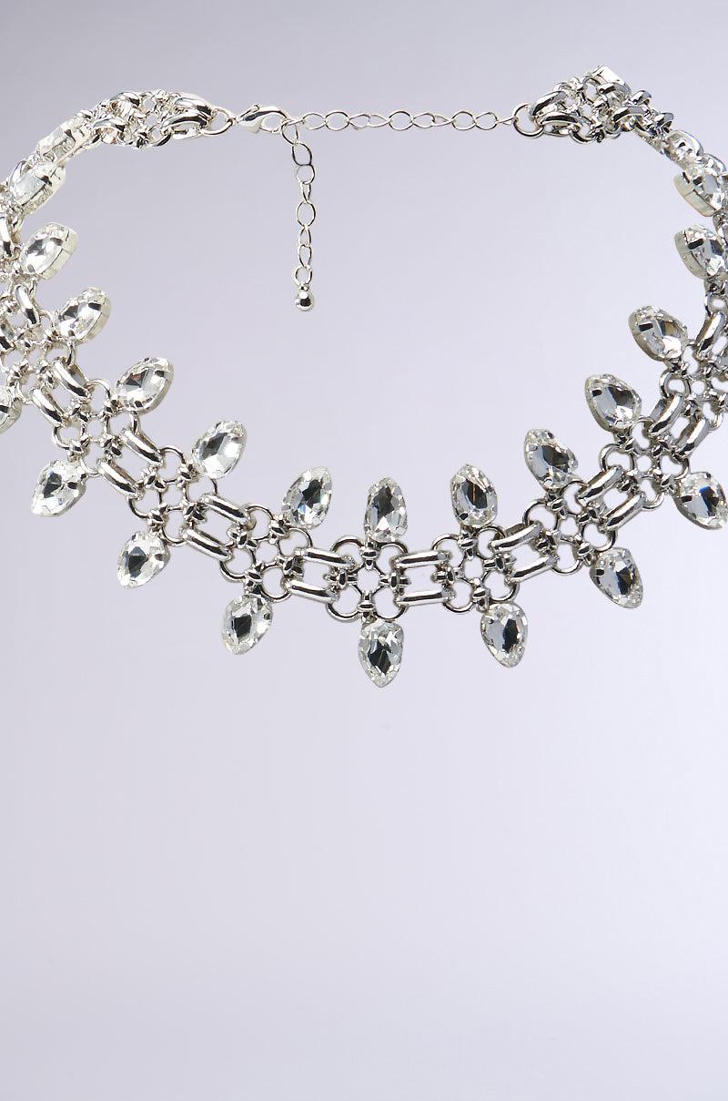 Iykyk, with The AKIRA Label The Real Will Know Necklace. This stunning piece is crafted from a faux silver metallic base and features a wide choker silhouette made of interlocking hardware, with glittering teardrop-shaped gemstone trim on the top and bottom. Complete with an extended chainlink and lobster clasp closure. - 100% Man-Made Materials (all measurements approximate from size O/S)- 16” Length- Imported Product ID: 472602