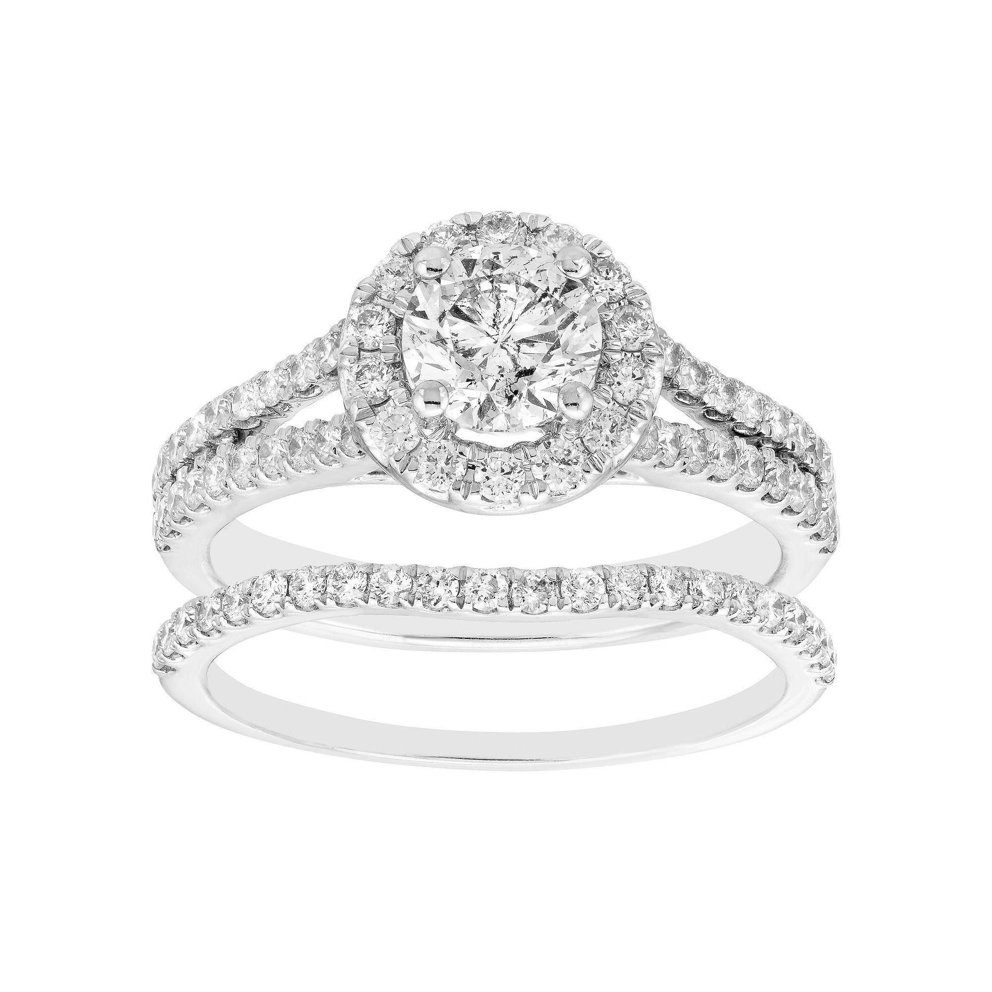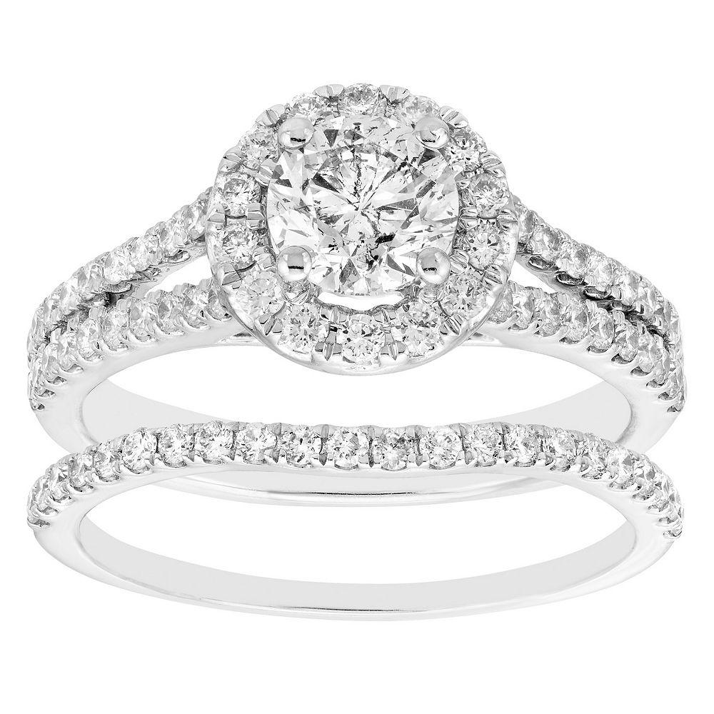 Beautifully adorned with breathtaking certified diamonds, this 14k white gold engagement ring set is a beautiful way to express your love and commitment. Beautifully adorned with breathtaking certified diamonds, this 14k white gold engagement ring set is a beautiful way to express your love and commitment. Width: 8 mm Metal: 14k white gold Plating: rhodium Finish: polished Packaging: box & certificateDIAMOND DETAILS Total weight: 1 1/4 ct. Center stone weight: 3/4 ct. Color grade: H Clarity: I1 Shape: round Setting: prong Gemstones may have been treated to enhance their appearance. Special care may be required. Please visit our Gemstone Treatment & Special Care Guide for more information. Diamond weights are approximate. Diamond total weights may vary between .01 and .08 ct. Some diamonds have fewer than 17 facets. Image(s) may be enlarged to show detail. Please note, due to the high value of this item, a signature may be required upon delivery. Size: 6. Gender: female. Age Group: adult.