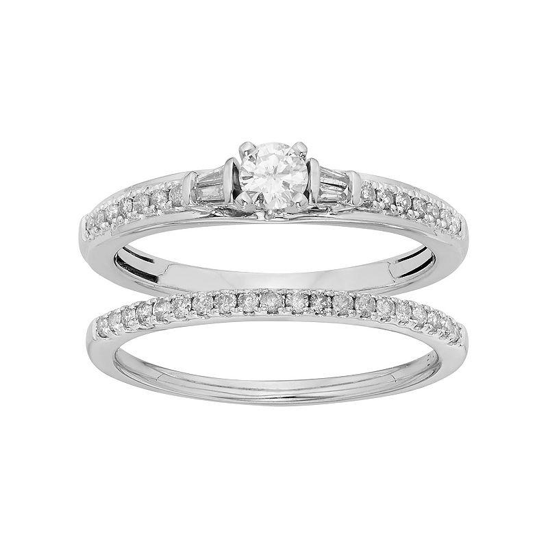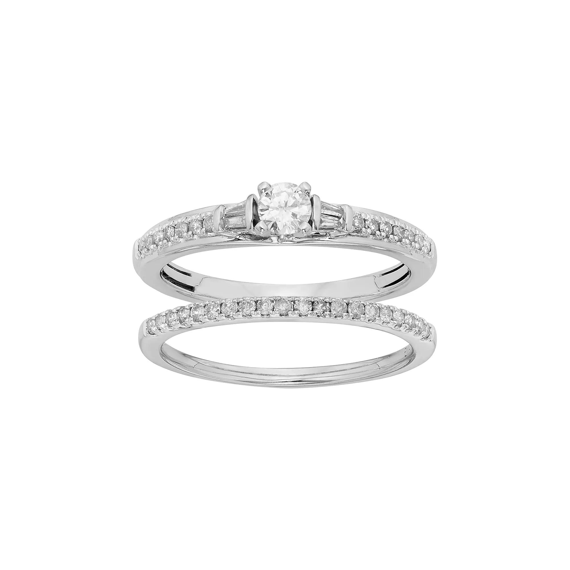 With a prominent round-cut diamond surrounded by baguette- and round-cut diamond accents, this 10k white gold engagement ring set abounds with eye-catching appeal. Celebrate your love for a lifetime with this illuminating engagement ring set. SET DETAILSIncludes: 2 ringsTotal width: 4 mmMetal: rhodium-plated 10k white goldDIAMOND DETAILSTotal weight: 1/2 ct.Center stone weight: 1/5 ct.Shape: round, baguetteColor grade: IClarity: I2Setting: prong, barImage(s) may be enlarged to show detail.Diamond weights are approximate. Diamond total weights may vary between .01 and .08 ct. Some diamonds have fewer than 17 facets.Please note, due to the high value of this item, a signature may be required upon delivery.Gemstones may have been treated to enhance their appearance. Special care may be required. Please visit our Gemstone Treatment & Special Care Guide for more information. Gender: female. Age Group: adult.