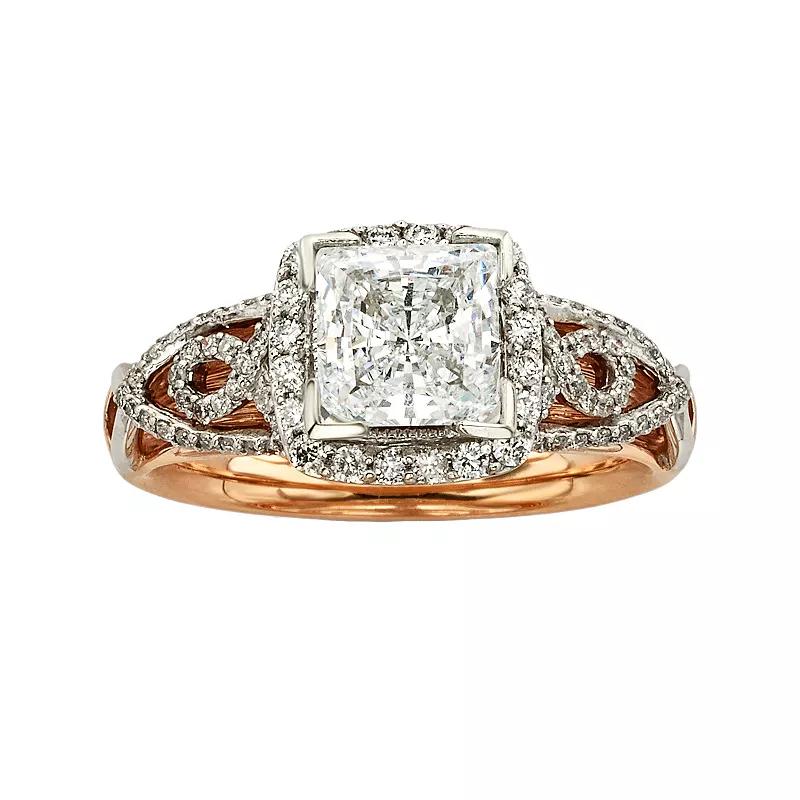 Beautiful IGL certified diamonds and eye-catching crisscross details give this halo engagement ring timeless elegance. Limit 1 per customer. Ring Details: Width: 9 mm Metal: 14k rose gold, rhodium-plated 14k white goldDiamond Details: IGL certified Total weight: 1 1/2 ct. Center stone weight: 1 ct. Cut: princess, round Color: H-I Clarity: I1 Setting: prongImage(s) may be enlarged to show detail.Diamond weights are approximate. Diamond total weights may vary between .01 and .08 ct. Some diamonds have fewer than 17 facets.Please note, due to the high value of this item, a signature may be required upon delivery.Gemstones may have been treated to enhance their appearance. Special care may be required. Please visit our Gemstone Treatment & Special Care Guide for more information. Size: 5. Gender: female. Age Group: adult.
