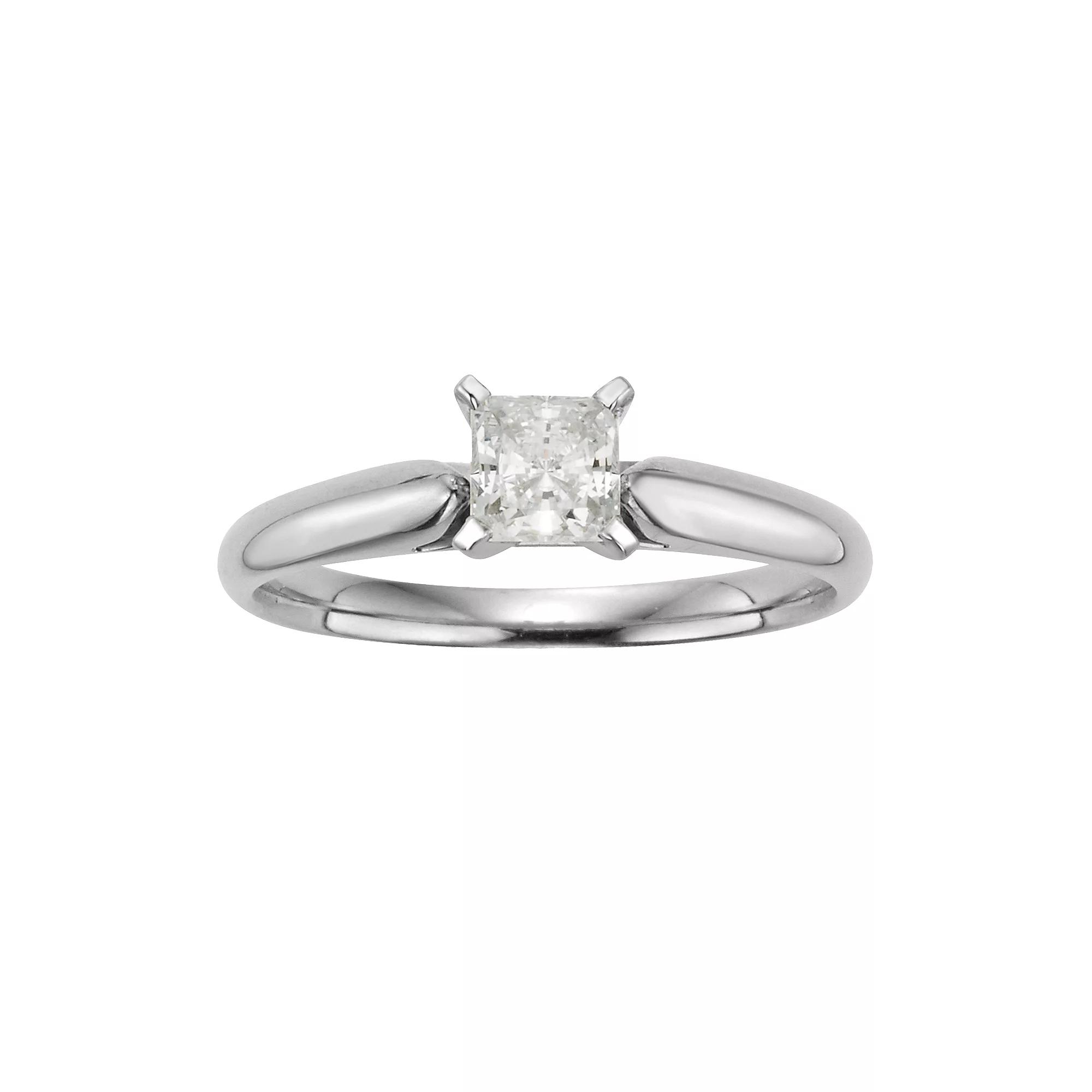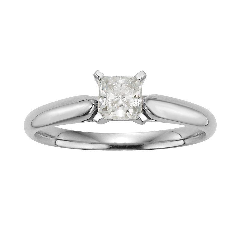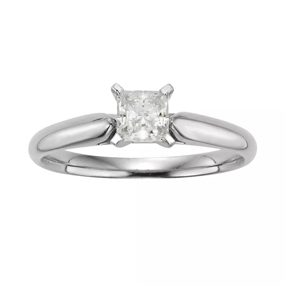 An IGL certified diamond solitaire gives this ring breathtaking beauty.Ring Details: Ring width: 2.75-mm Metal: rhodium-plated 14k white gold Feature: comfort fitDiamond Details: Carat total weight: 1/2 Cut: princess Color: H-I Clarity: I1 Setting: cathedralImage(s) may be enlarged to show detail.Diamond weights are approximate. Diamond total weights may vary between .01 and .08 ct. Some diamonds have fewer than 17 facets.Please note, due to the high value of this item, a signature may be required upon delivery.Gemstones may have been treated to enhance their appearance. Special care may be required. Please visit our Gemstone Treatment & Special Care Guide for more information. Gender: female. Age Group: adult.