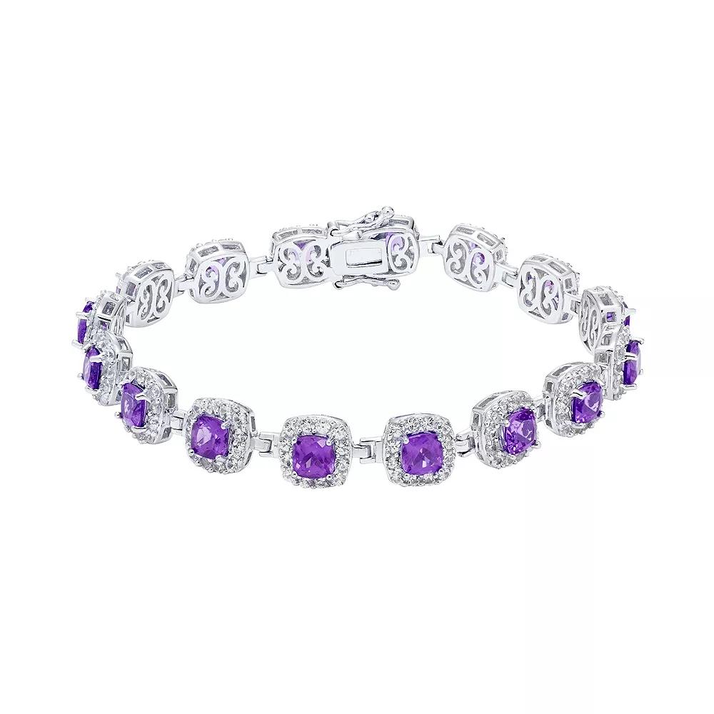 Step into sophisticated style with this amethyst and lab-created white sapphire halo bracelet.BRACELET DETAILSLength: 7.5 in. Clasp: safetyMetal: sterling silverPlating: rhodiumPackaging: boxedSTONE DETAILSStone type: amethyst, lab-created white sapphireTotal weight: 15 1/4 ct.Shape: cushion cut, roundSetting: prongGemstones may have been treated to enhance their appearance. Special care may be required. Please visit our Gemstone Treatment & Special Care Guide for more information. Size: 7.5". Gender: female. Age Group: adult.