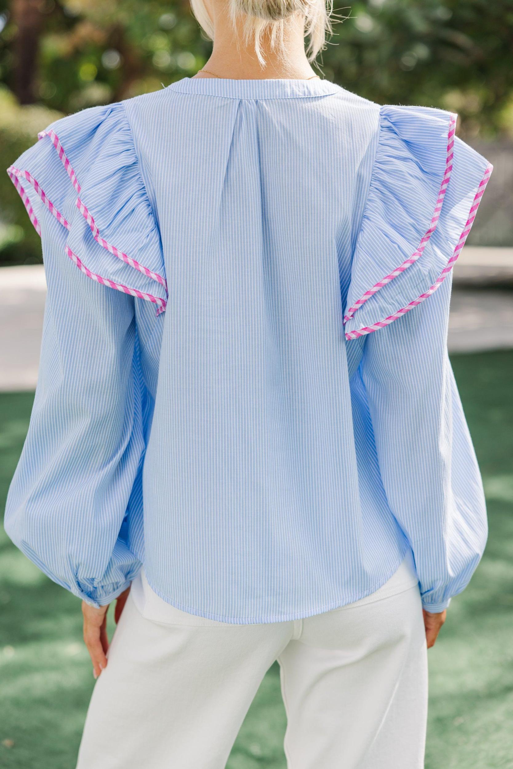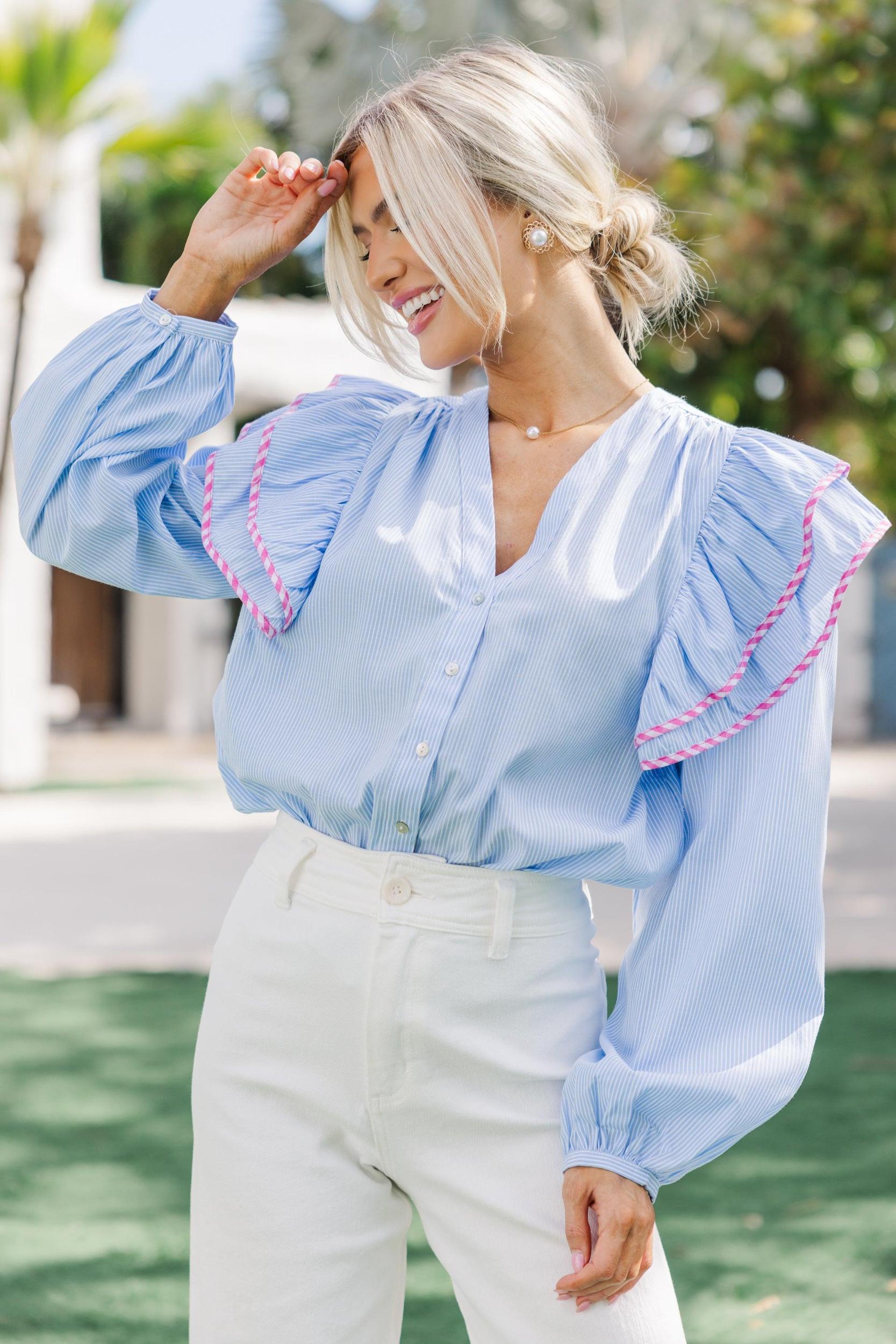 This floral blouse is absolutely stunning! The combination of ruffles, the floral print, and those neutral hues is perfection! You are going to love styling this blouse with your favorite jeans, trousers, or even skirts! Flattering V-neckline Long sleeves Feminine ruffled detailing Classic striped print Material has no amount of stretch Baileigh is wearing the small.
