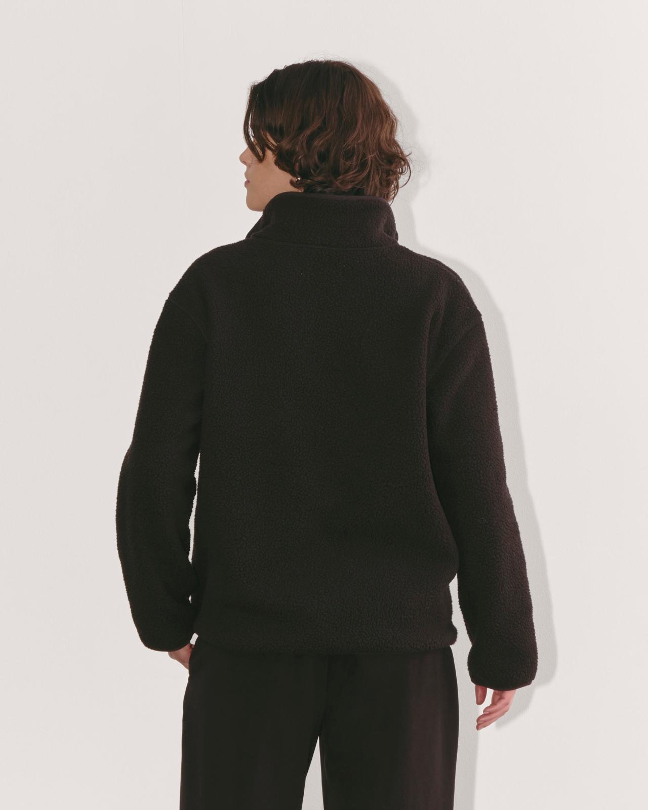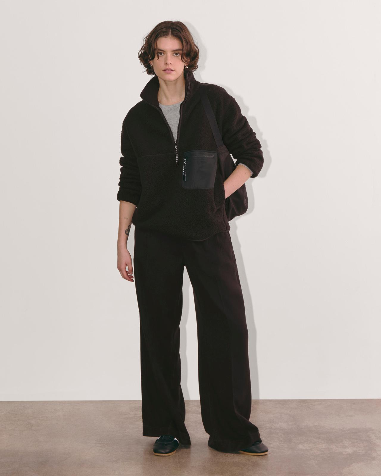Half-zip full cozy. A new ReNew style has entered the chat and its softer than ever. Made from 100% GRS-certified polyester this extra roomy pullover features a funnel neck patch pocket (with a zipper!) and side seam pockets. Throw it on during chilly work-from-home days or morning dog walks. The Global Recycled Standard (GRS) sets requirements for third-party certification of recycled input in productsincluding chain of custody social and environmental practices and chemical restrictionswith the goal of increasing the use of recycled materials and reducing the harmful impacts of production. Womens ReNew Fleece Oversized Half-Zip Sweater by Everlane in Black, Size XXL