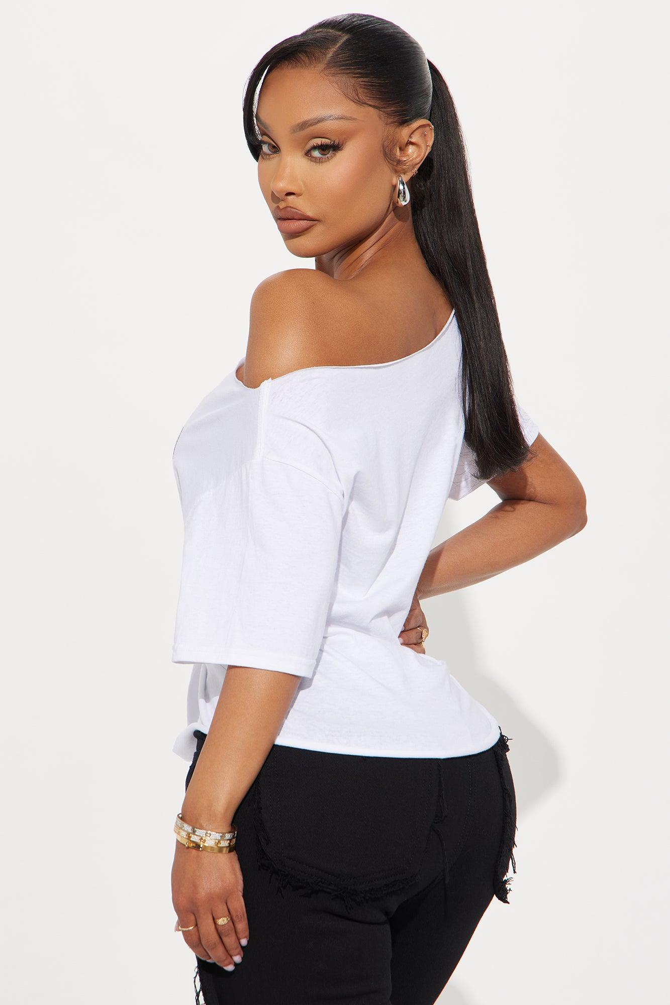 Available In Cream. Off Shoulder Top Short Sleeve Front Screen Stretch Disclaimer: Due To The Printing Process A Difference In Saturation May Occur. Each Garment Is Unique. 100% Cotton Imported