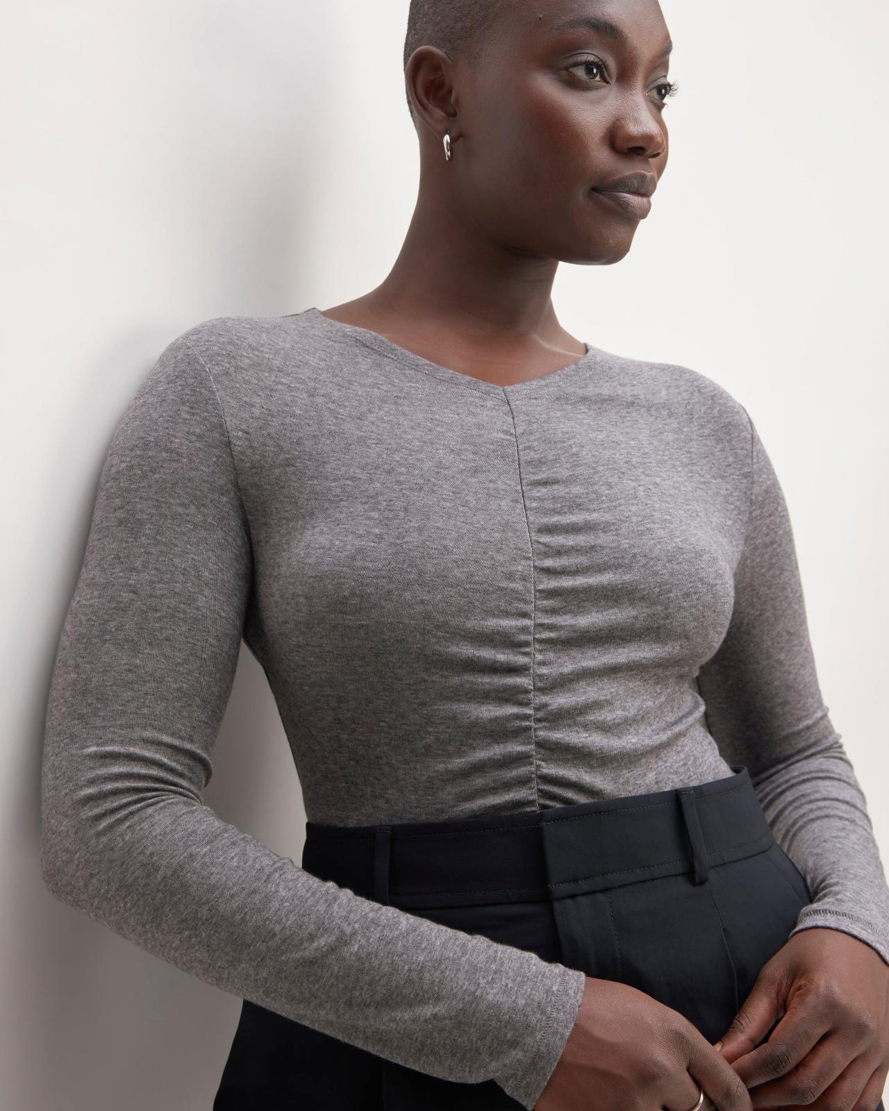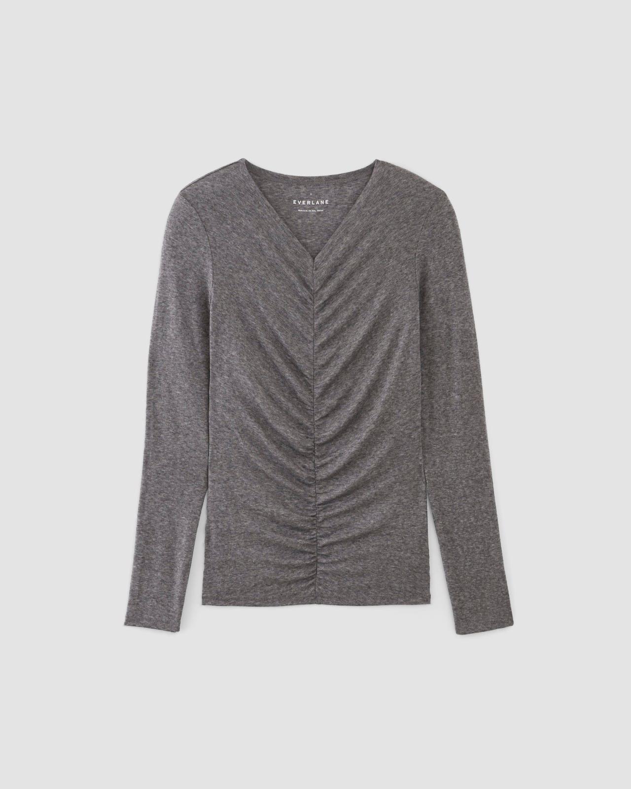 Ruched and ready to go. A top worth taking out the Merino TENCEL Relaxed V-Neck is an elevated knit youll want in your going-out wardrobe. A slim fit top with a high V-neck it has front ruched detailing. Made with our light jersey knit blend of soft merino wool and TENCEL Lyocell with a touch of stretch its silhouette is a little longer making it a great layering piece to tuck-in or top pants and skirts. Just add heels or heeled boots for a perfectly put-together vibe. Known for its lightness and versatility TENCEL Lyocell is a man-made cellulosic fiber extracted from FSC and PEFC-certified responsible wood sources. Lenzing the producer of TENCEL Lyocell has achieved the highest rating from CanopyStyle for clean chemistry use and water recycling. Based on third-party certified lifecycle assessments TENCEL Lyocell is over 50% less emissions intensive compared to conventional lyocell. Womens Merino TENCEL Relaxed V-Neck T-Shirt by Everlane in Heather Charcoal, Size XL