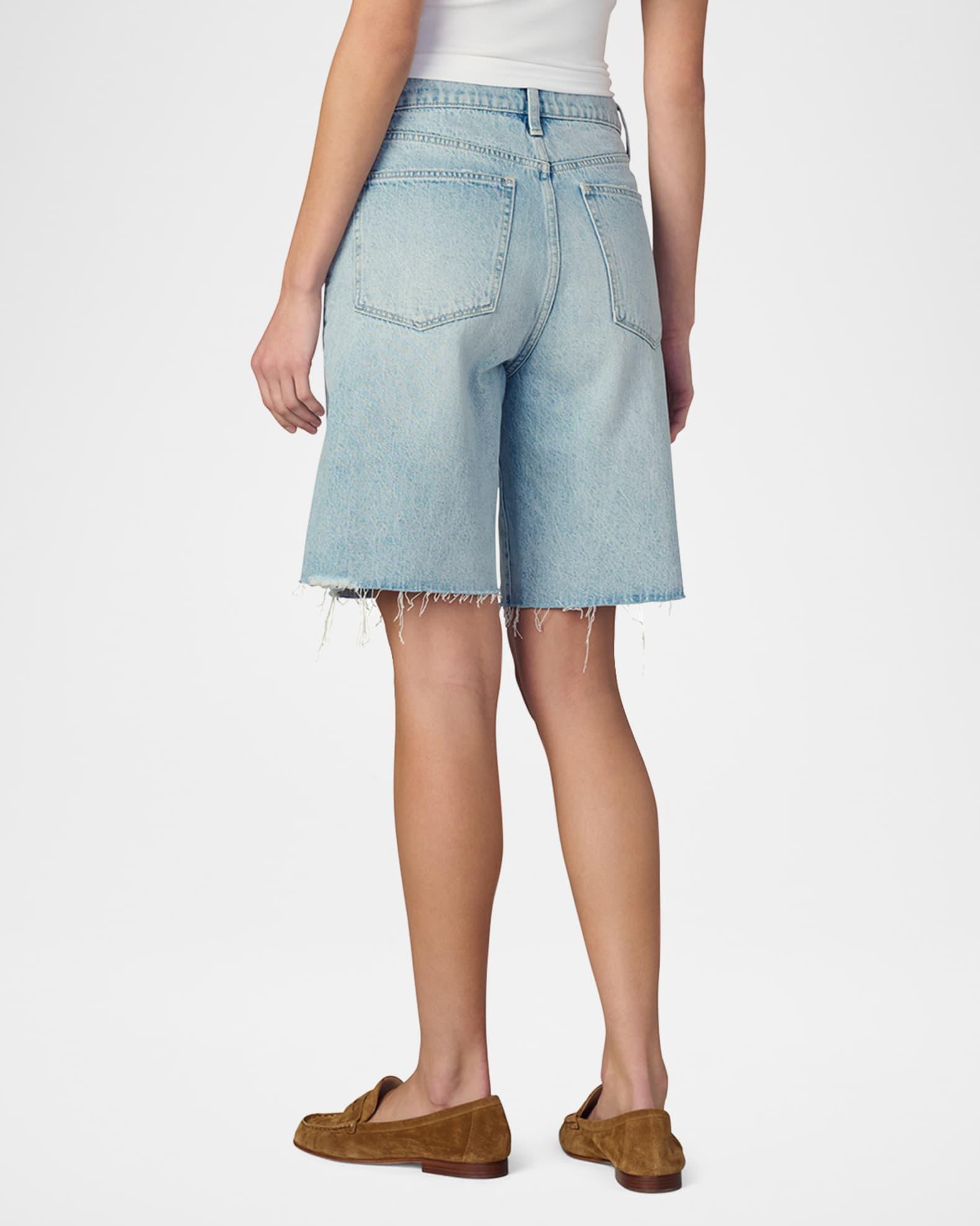 Joe's Jeans "The Ryan" bermuda shorts finished with a raw hem in light-wash denim Approx. 12" rise; 9.5" inseam Mid-rise; sits at the hip Five-pocket style Baggy fit Hem hits around the knee Button/zip fly; belt loops Cotton Machine wash cold Imported