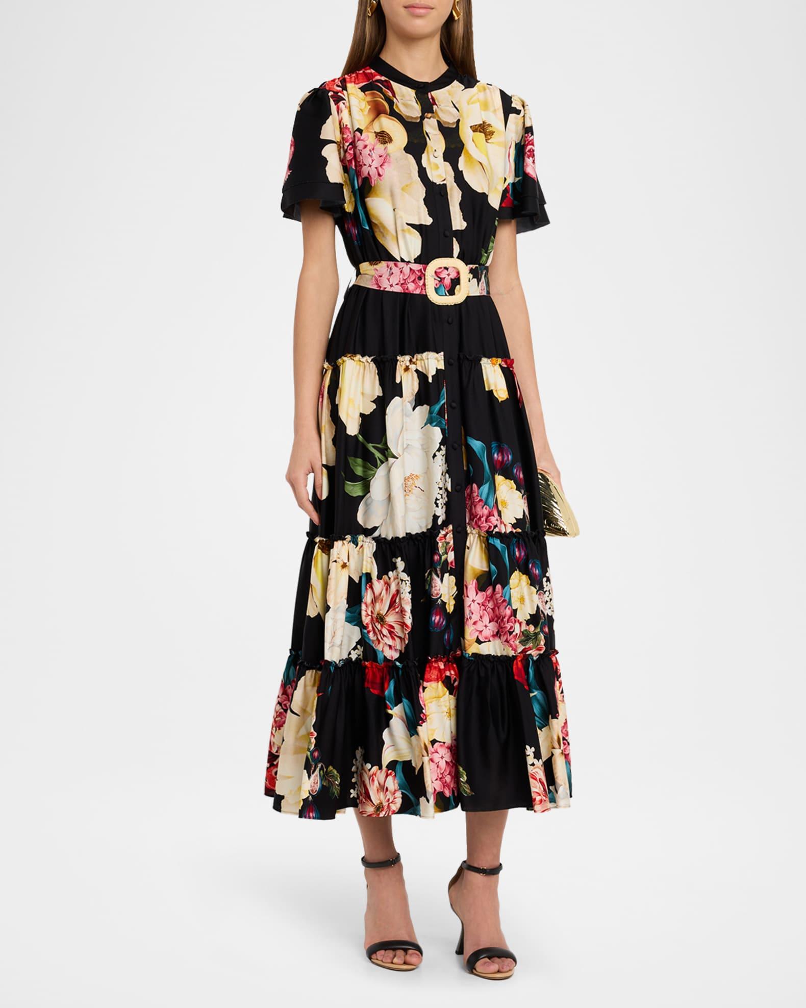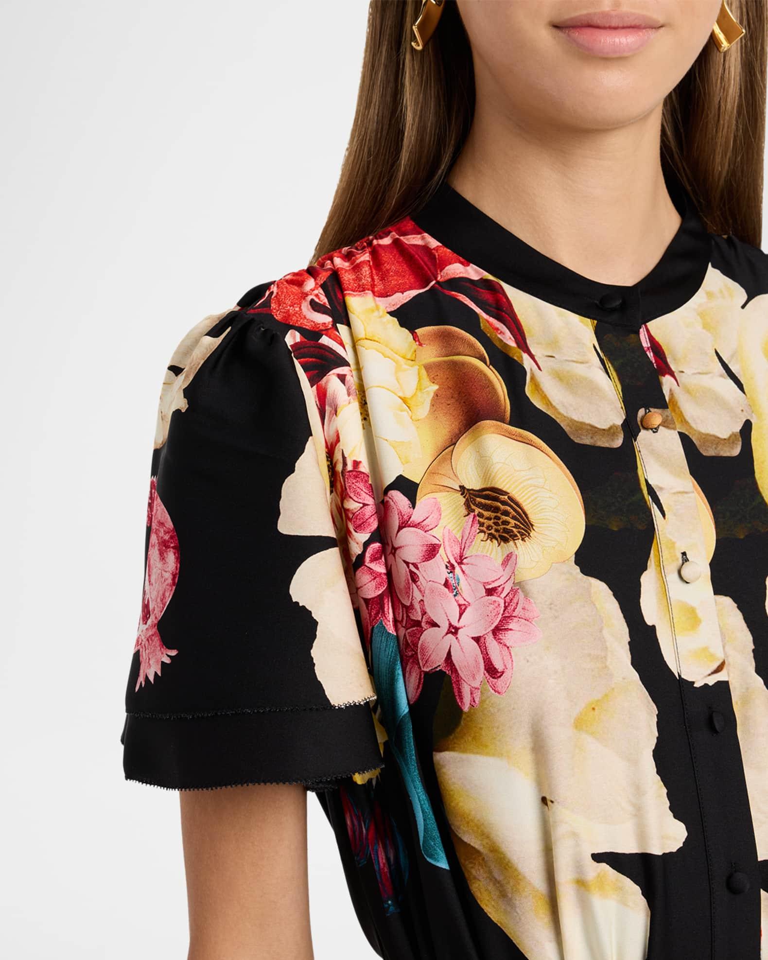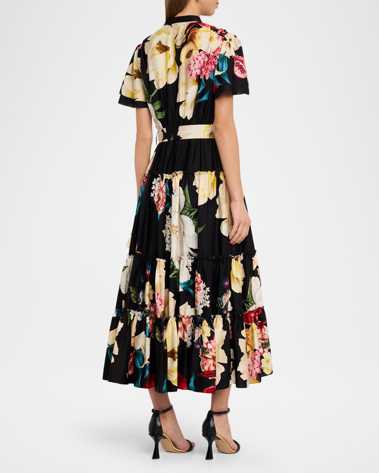 Printed with bright graphic florals and fruit, "The Sammie" midi dress from Elie Tahari is styled with ruched tiers, delicate ruffle trim, and a matching belt to cinch the waist Approx. 52"L from shoulders to hem Band collar; button front Short sleeves Hem falls below the knee A-line silhouette Silk/spandex Lining: Viscose Dry clean Imported