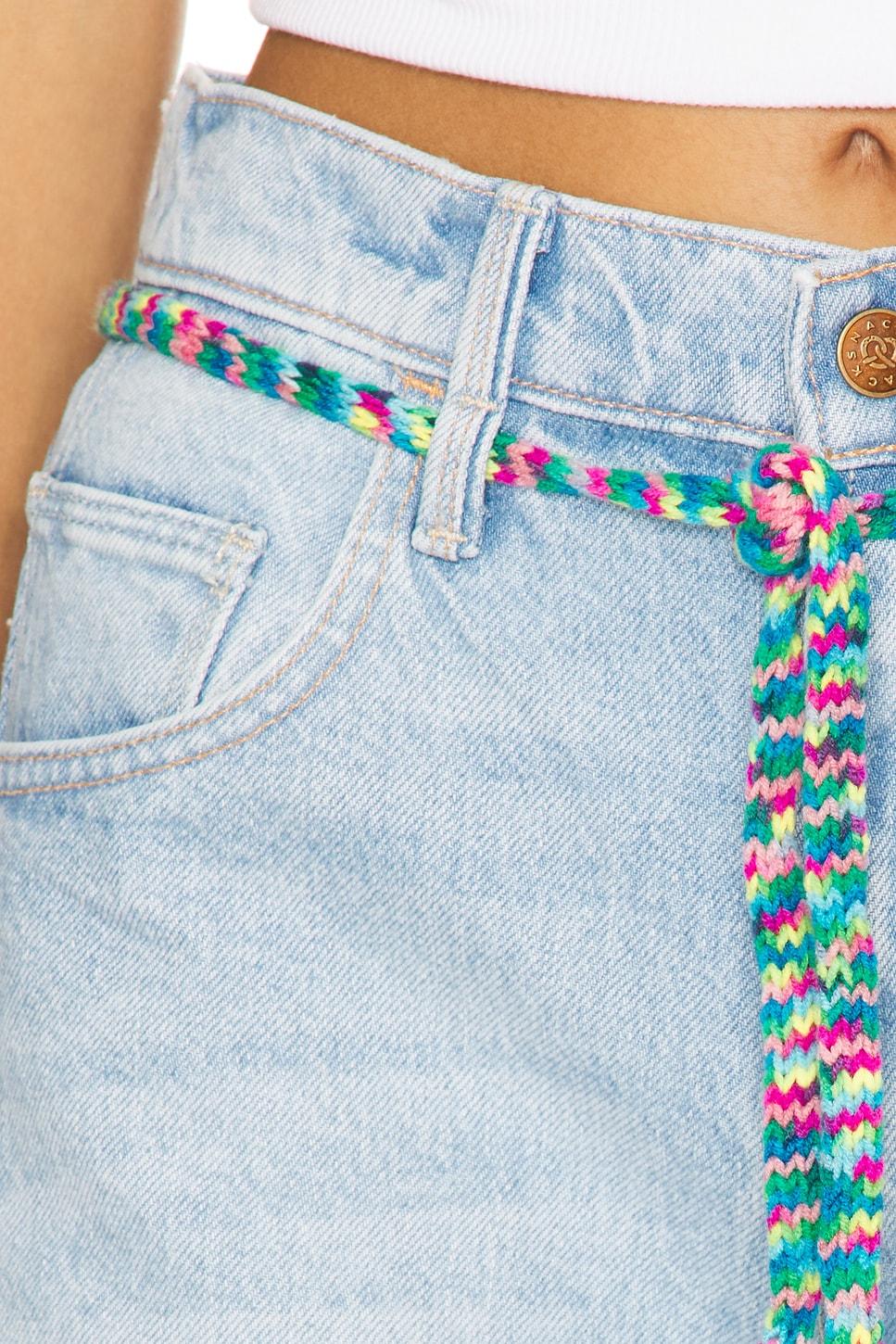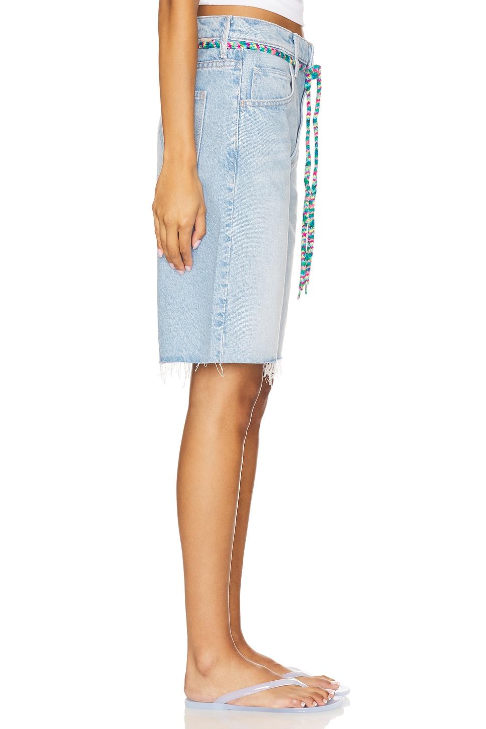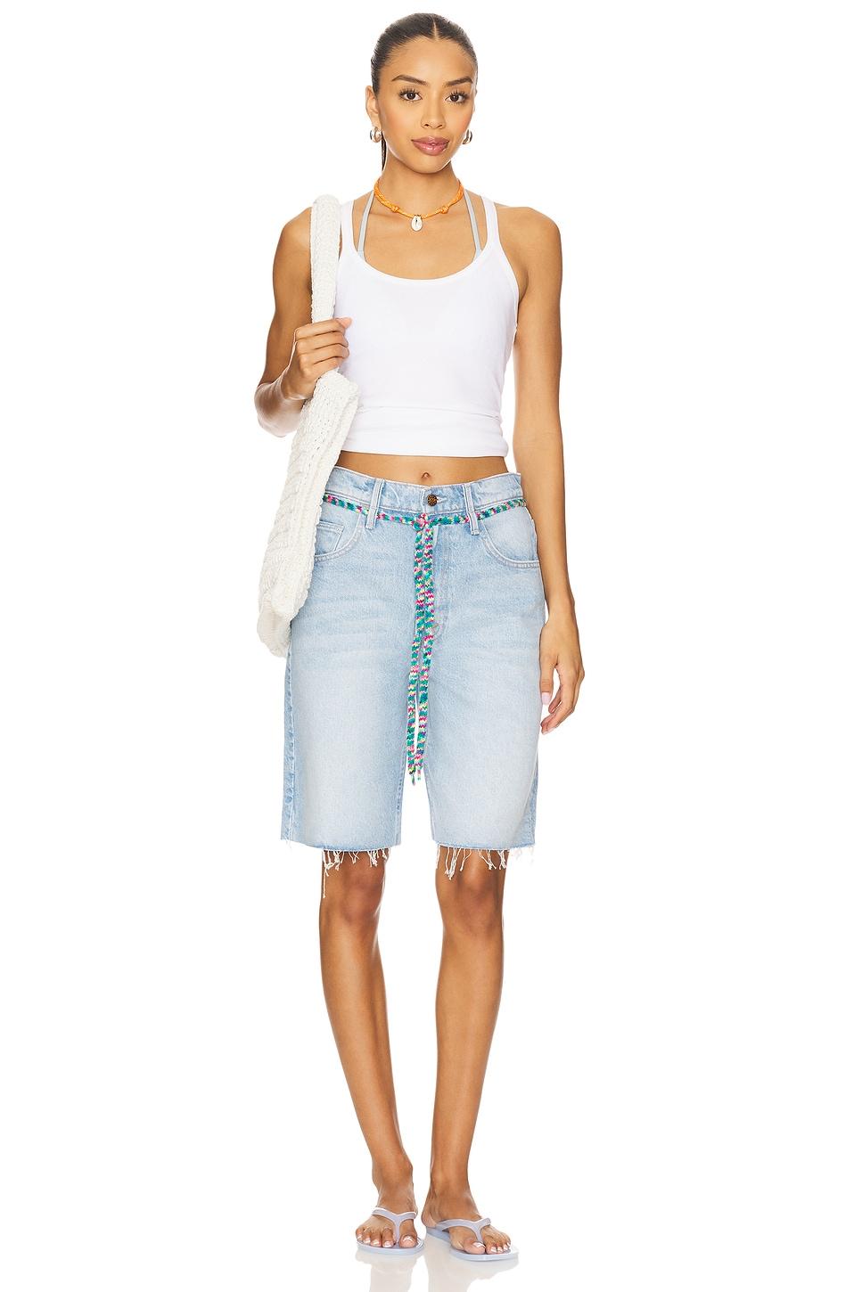 41% recycled cotton, 41% lyocell, 18% cotton. Machine wash. Zip fly with button closure. Optional multi-colored crochet self-tie at waist. 5-pocket design. Denim fabric with frayed raw hem. Shorts measure approx 21" in length. Made in US. Revolve Style No. MOTH-WF97. Manufacturer Style No. 4343-1321.