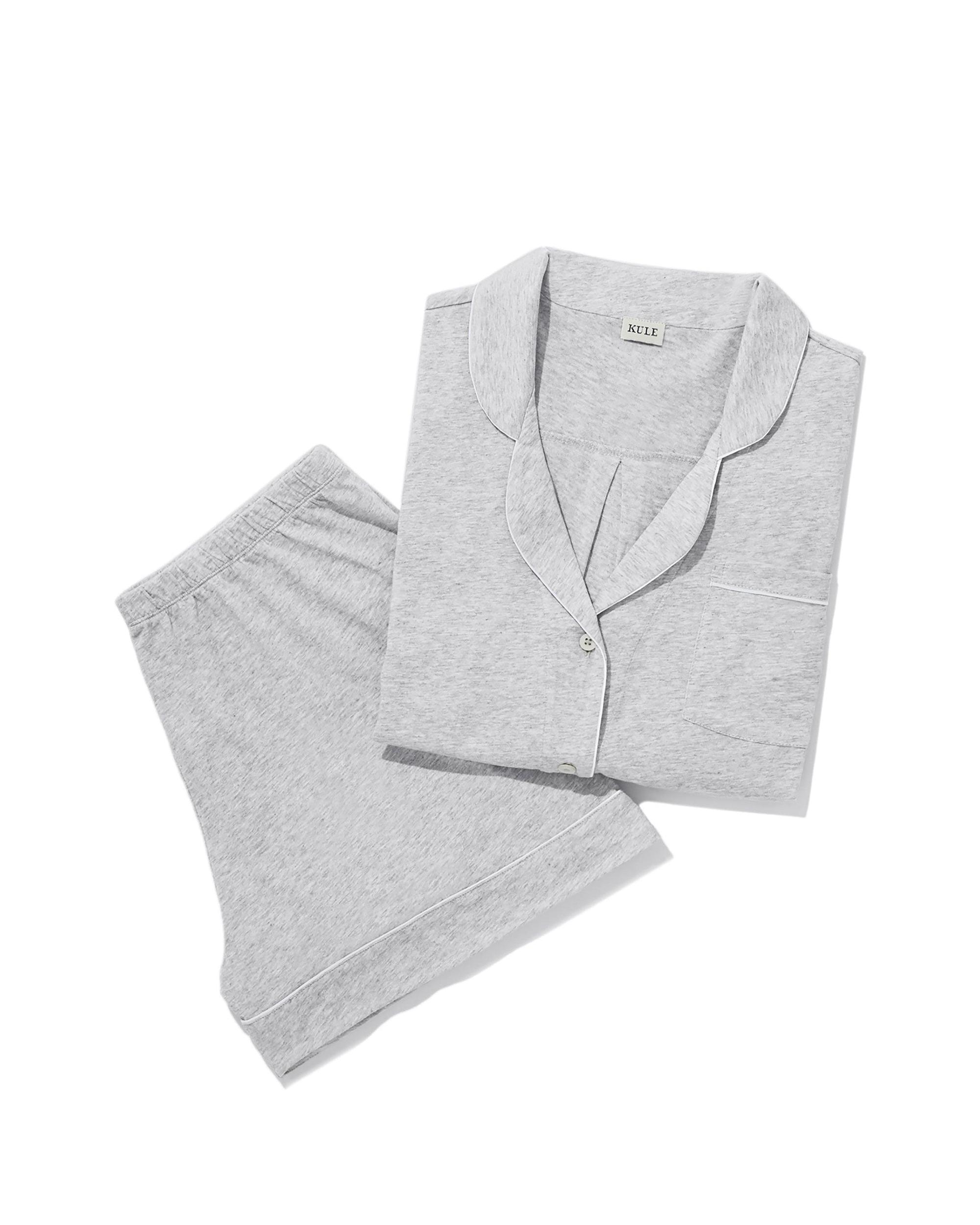 PJ party! But instead of some stiff tailored fabric, these pajamas are made from cotton jersey, so they're even MORE comfy. This set features contrast piping along the lapel, sleeves, hem, and front pocket. Comes with both a top and bottom.