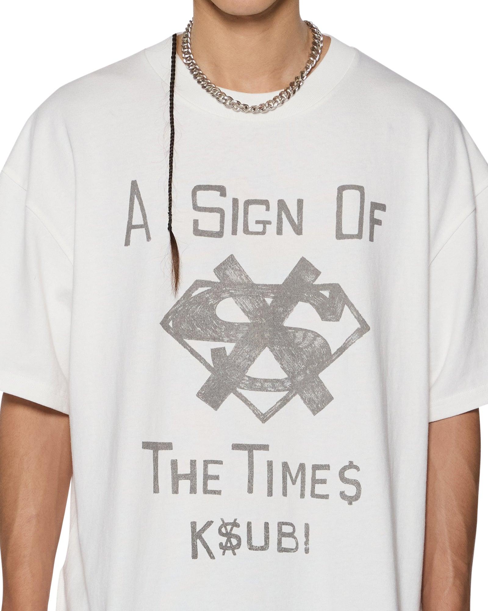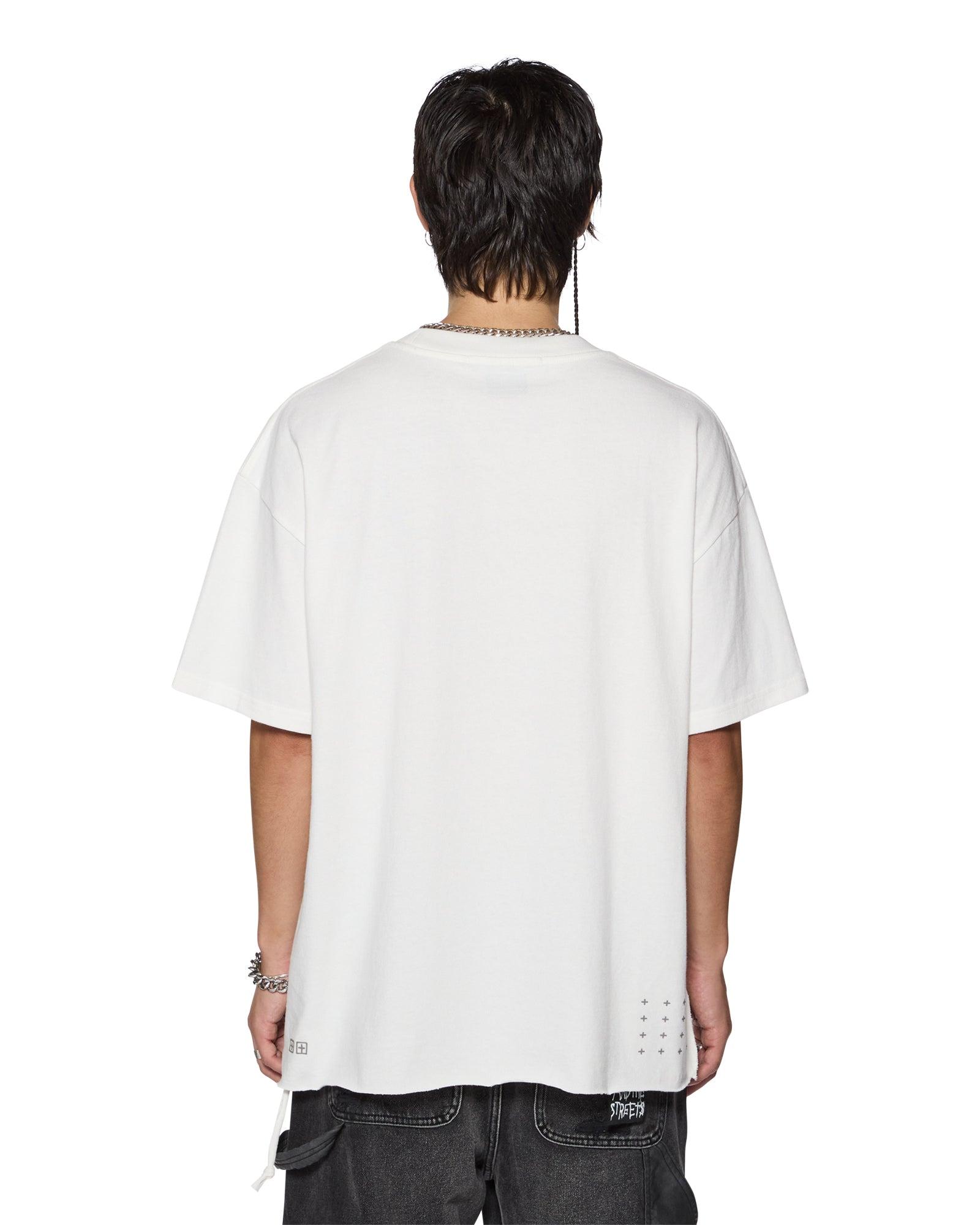 The Sign Ekcess SS Tee Antique White is a boxy oversized fitting short sleeve t-shirt with a dropped shoulder and raw cut back hem. Detailed with a reversed overlocked side seam, signature rats tail, and branded logos, it is made from a premium heavy weight cotton jersey in an overdyed faded black with an aged wash. Featuring seasonal screen printed artwork at the front, it is finished with t-box and 4x4 embroidered branding.
