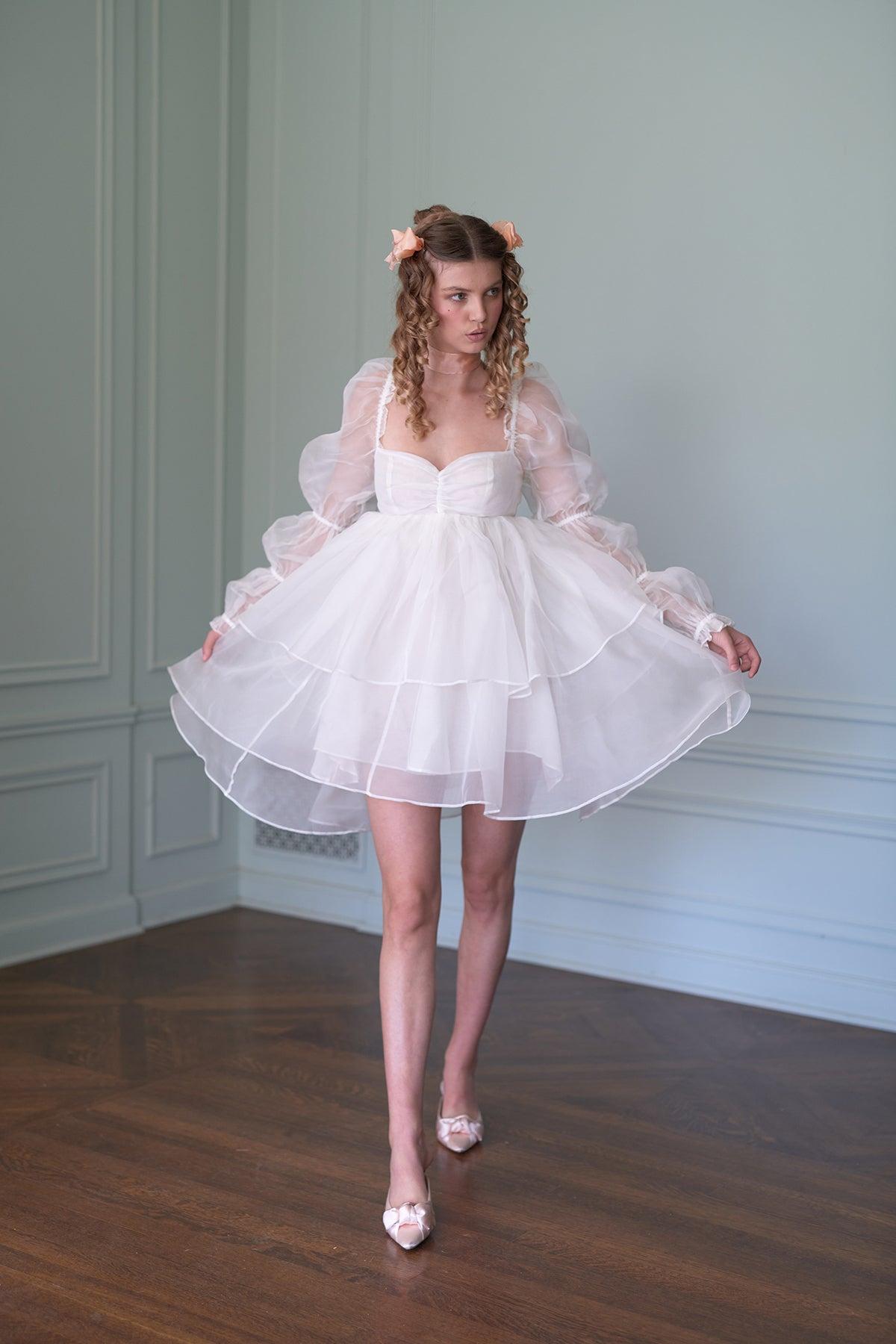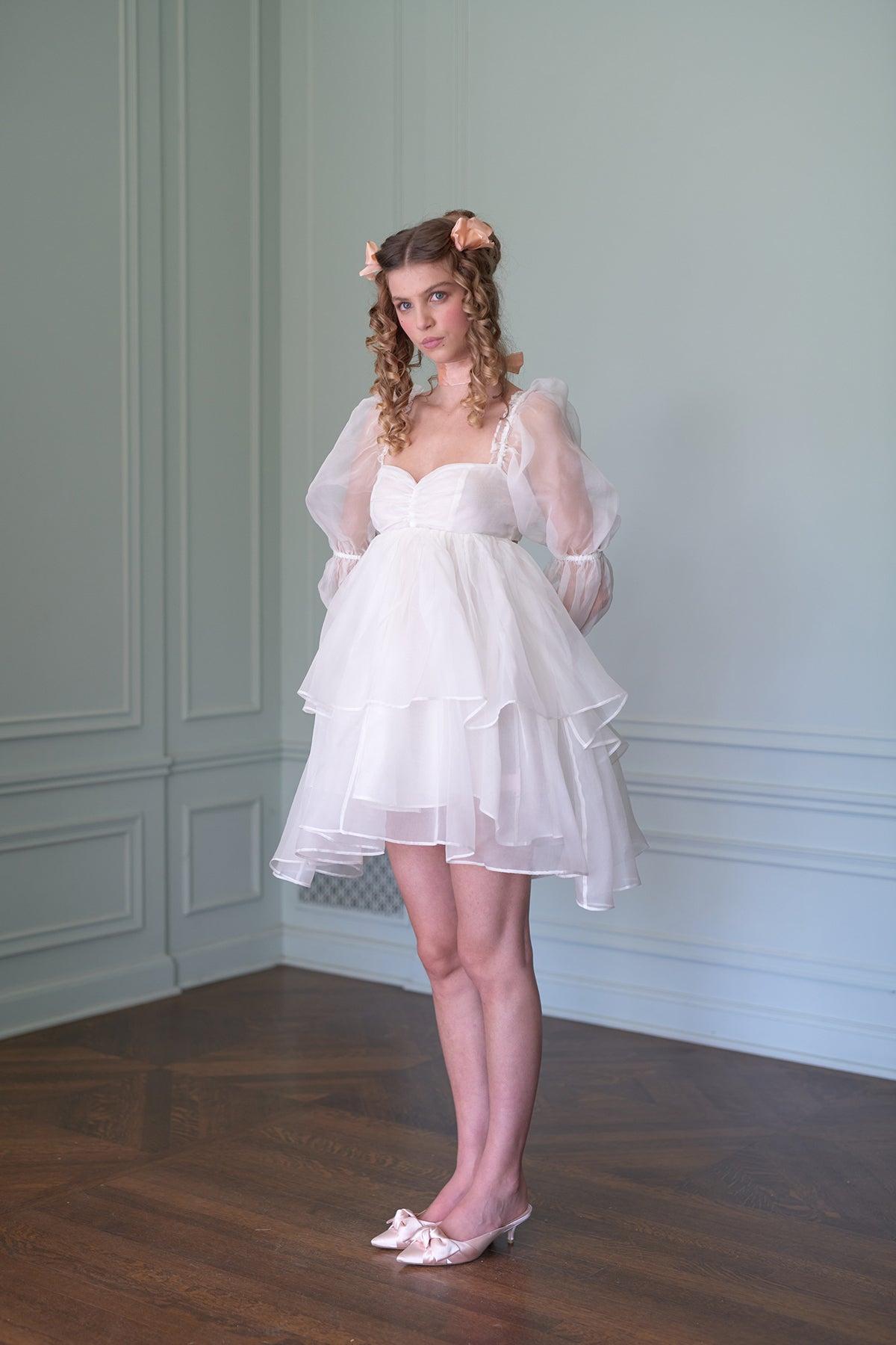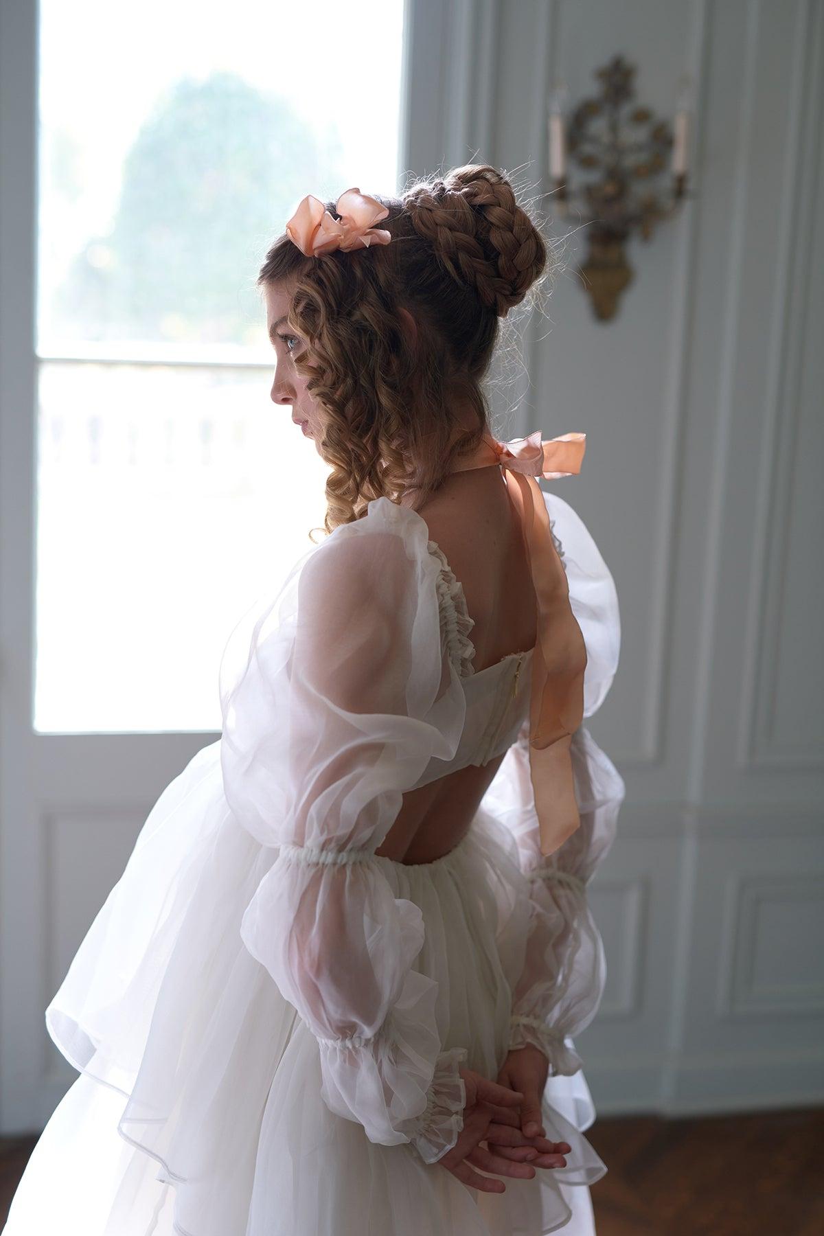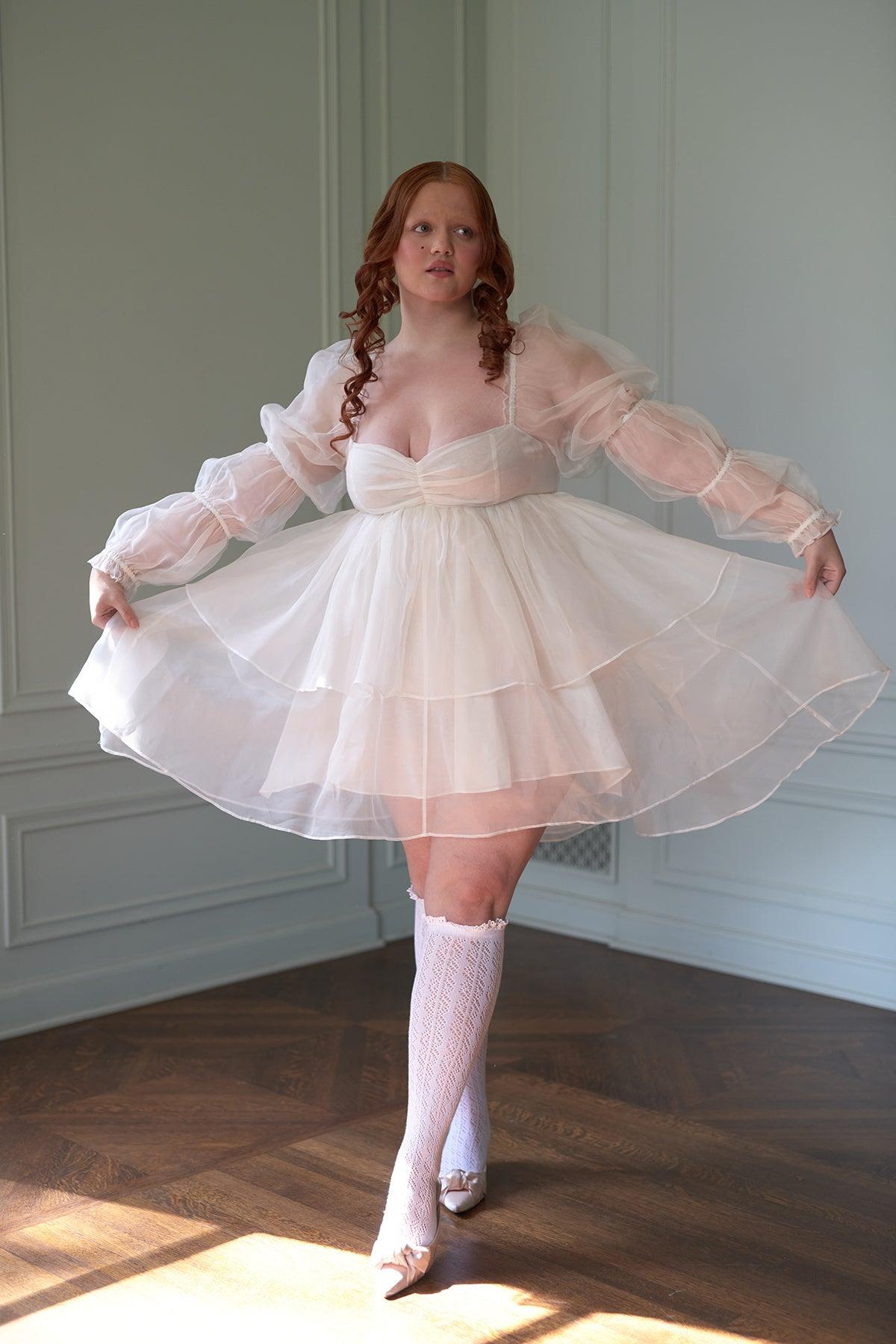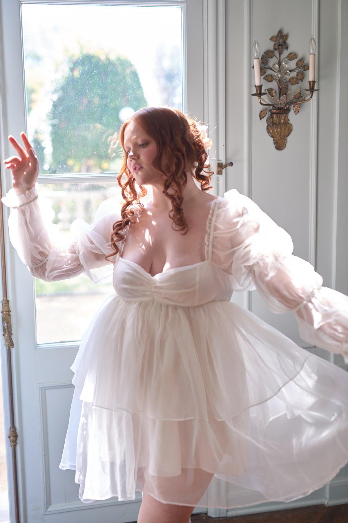 The Moonlight dress, inspired by late night lawn parties and 18th century royals, is back in Ivory Silk Gauze. The rococo design, with its long puff sleeves and open back, showcases the body as a true work of art, and ruching at the bust adds drama. Picture yourself surrounded by old friends under the cover of a white tent, jazz booming, stars twinkling, and a glass of champagne revives you as you dance until daylight. Long gathered puff sleeves Elastic shoulder straps Ruched at center bust Bust and skirt lined with rayon Two offset layers of organza skirt Pleated open back and zipper closure Fit notes: Pick your size by matching your across bust and under bust measurements to our size chart. Models pictured are wearing a size XXS and XXL. Silk Gauze with organdy lining Care: Dry clean only Designed and fit in LA, Made in partnership with our reputable and expert production team in Jianying, China. Our products are made with the utmost in quality by some of the best craftsman in the industry. Learn more about our team and see our facilities!