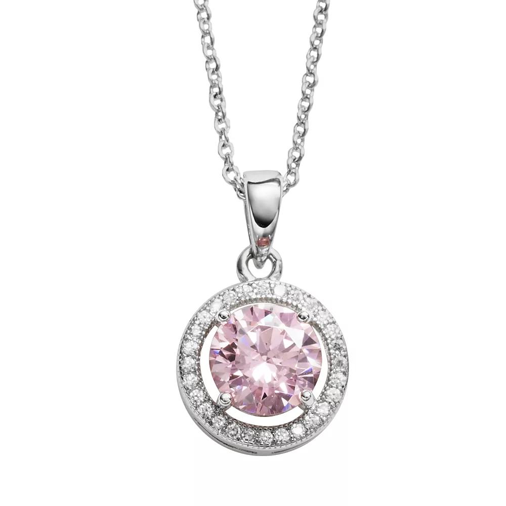 Pendant Details: Pendant length: .75-in. Chain length: 18-in. Clasp: spring-ring Metal: rhodium over silver-plated brass Features: milgrain accents Cubic Zirconia Details: Cut: round Color: pink & white Setting: prong & micro pave Size: 18". Gender: female. Age Group: adult. Material: Silver Plate Rhodium Brass.