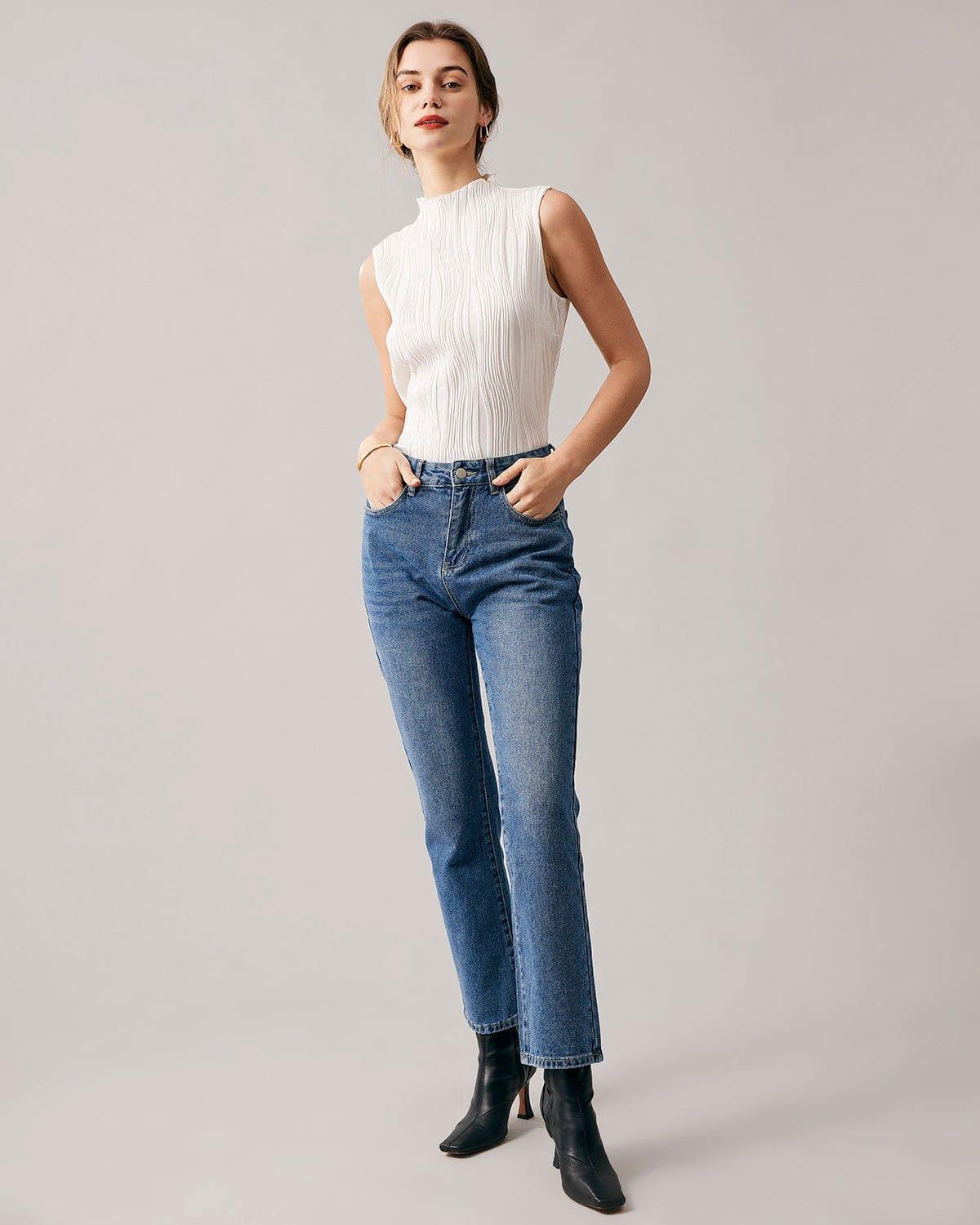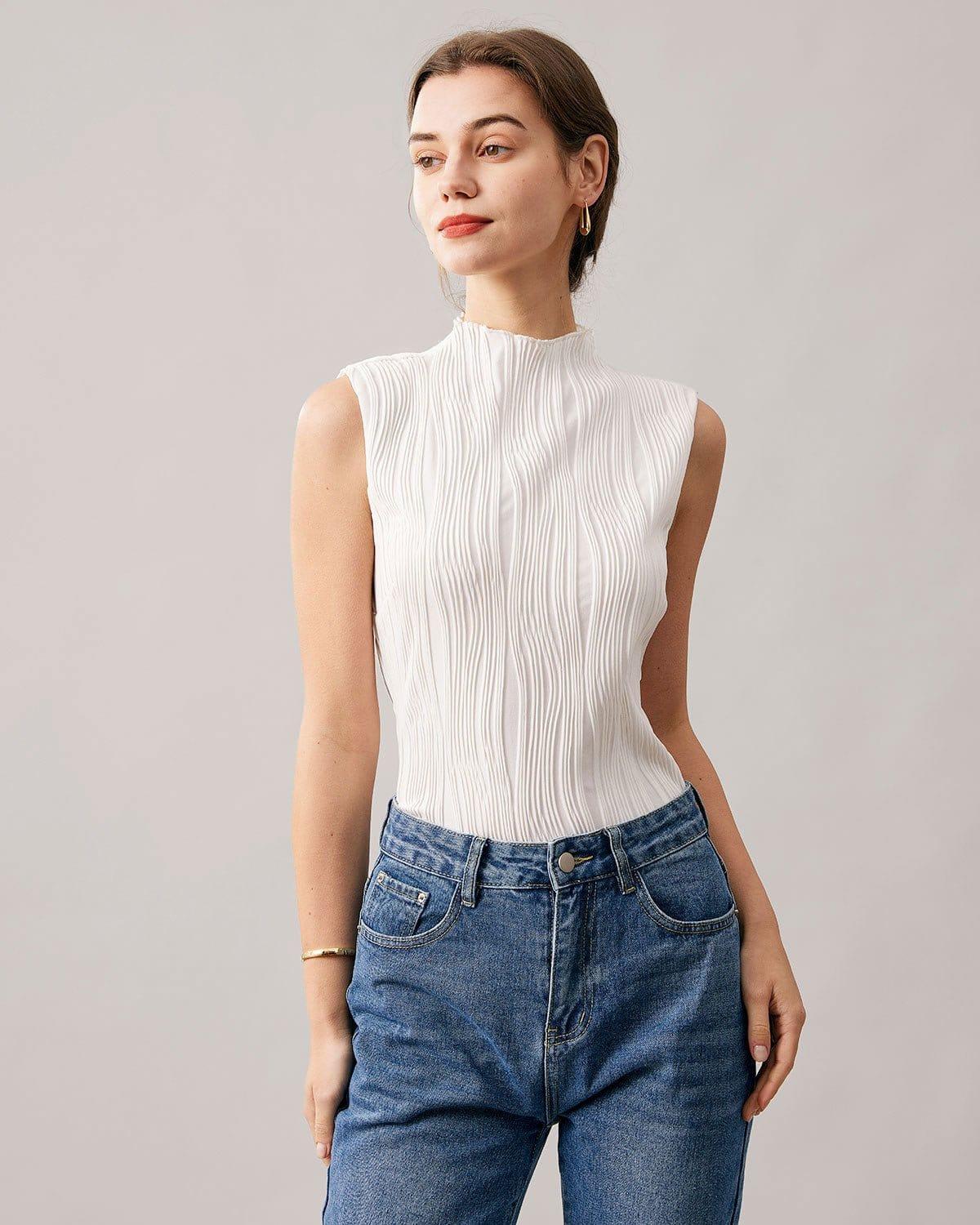 Fabric:This Sleeveless Tank Top is made of Polyester and Spandex. Polyester is an artificial fiber that feels soft, looks lustrous, and dries fast. It's also durable, with good resistance to wrinkles, stains, and sunlight. Spandex is lightweight and comfortable to wear, resistant to sweat, has excellent elasticity, and is durable and robust.Description:Designed in a water ripple texture, this Textured Top is a luxe update on a classic and will soon become your new go-to. Its mock neck, sleeveless, and white color design are perfect with high-waisted jeans or bottoms of any kind, showing off your shoulders. Coupled with medium stretch, you would get the right amount of coziness you want. Do not miss it! Details:- Polyester- Wave Cut- Regular- Water Ripple Textured- Medium Stretch