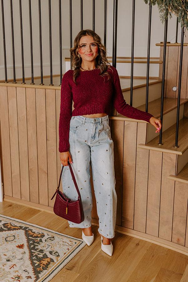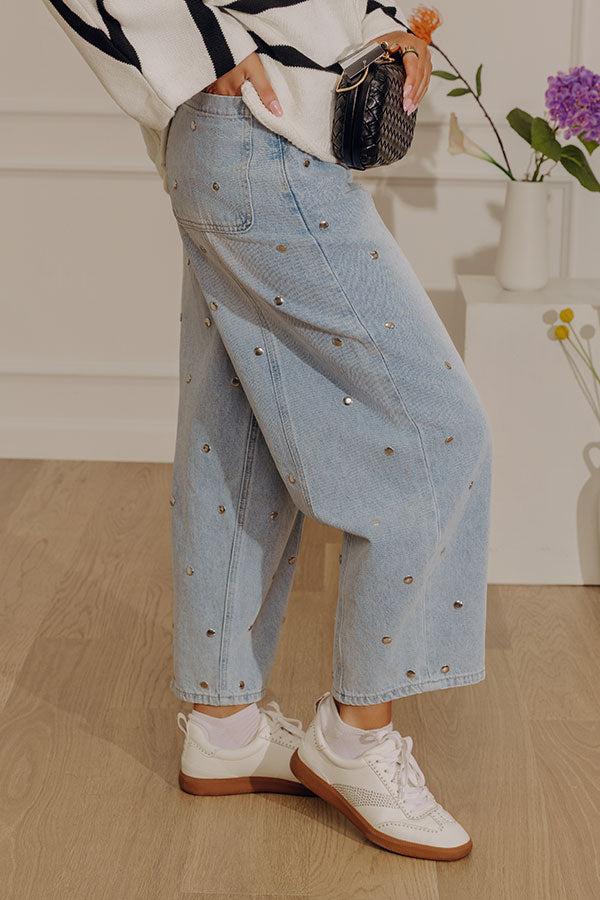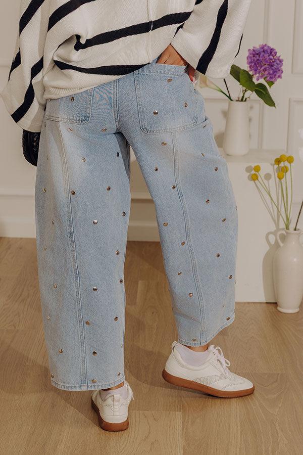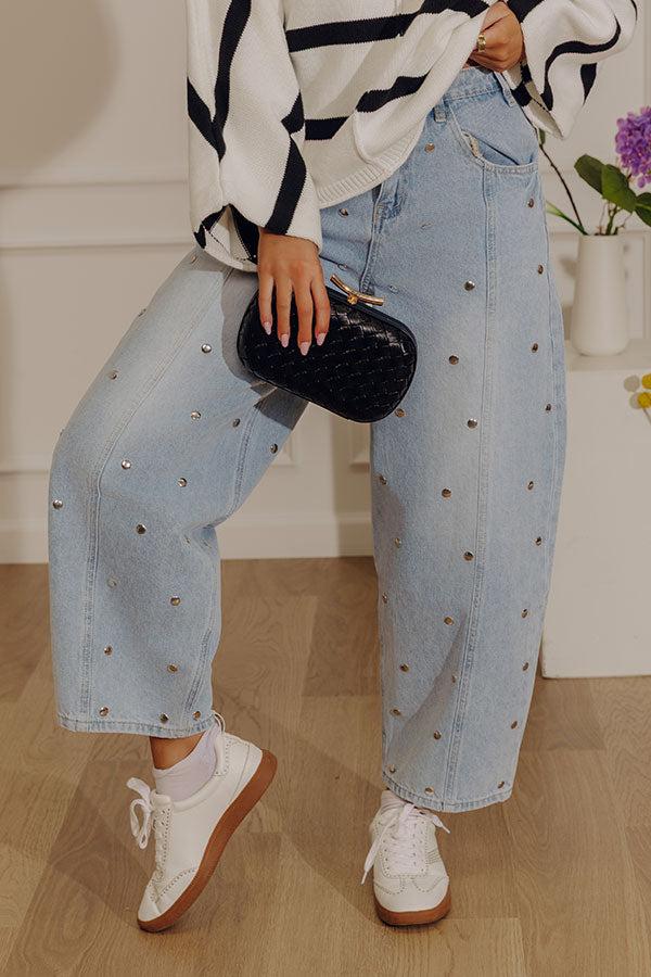 - Make a statement in these trendy barrel leg jeans! Subtle rivet detailing brings extra style to a classic denim look. - Unlined denim material - Flat, round rivet detailing featuring silver-toned metal - Belt loops - A hidden zip fly and button closure - Functional front and back pockets - Accent seams down the front - A wide, barrel leg silhouette that subtly tapers into straight hemlines