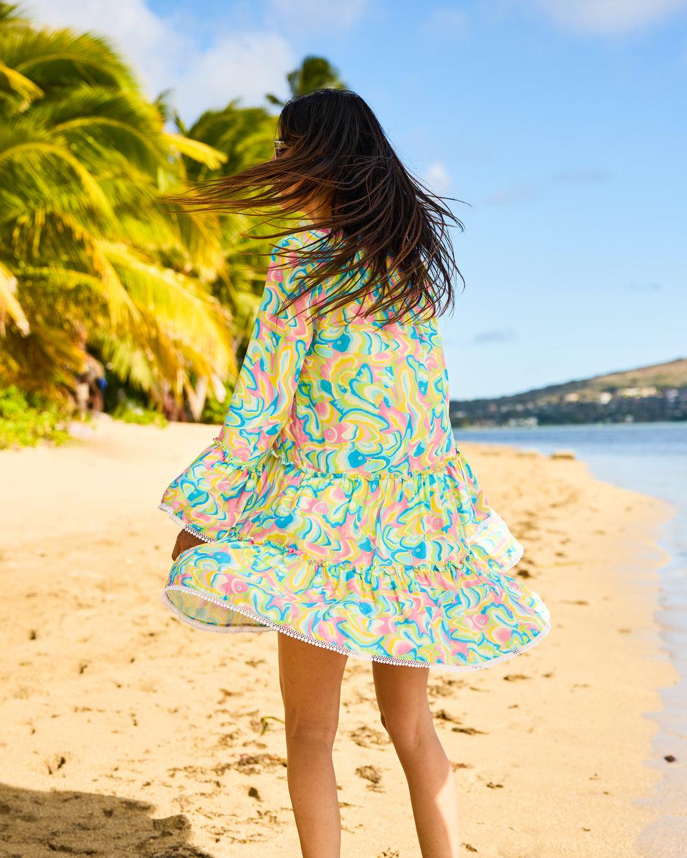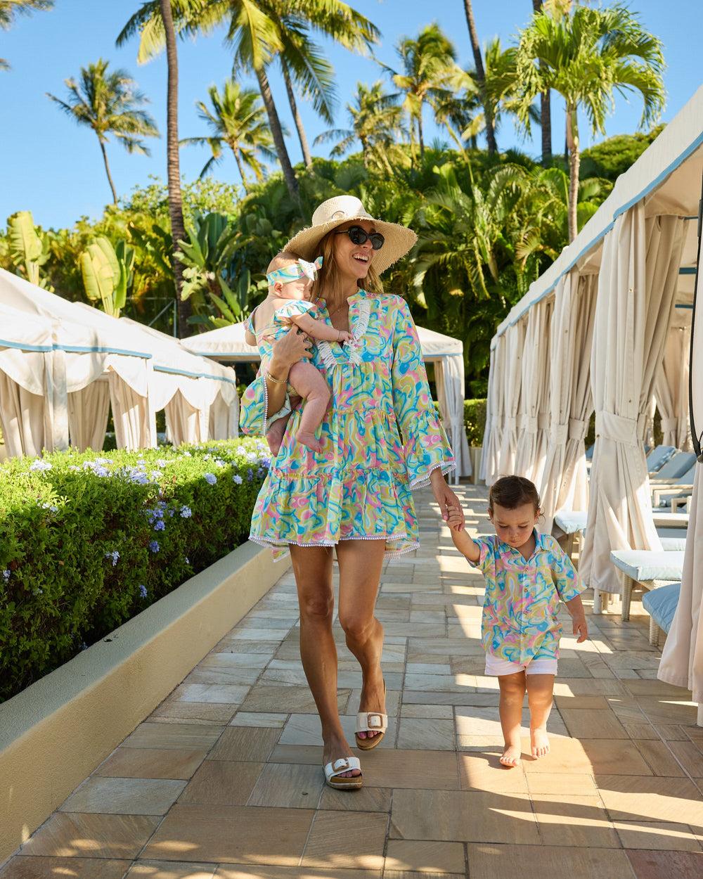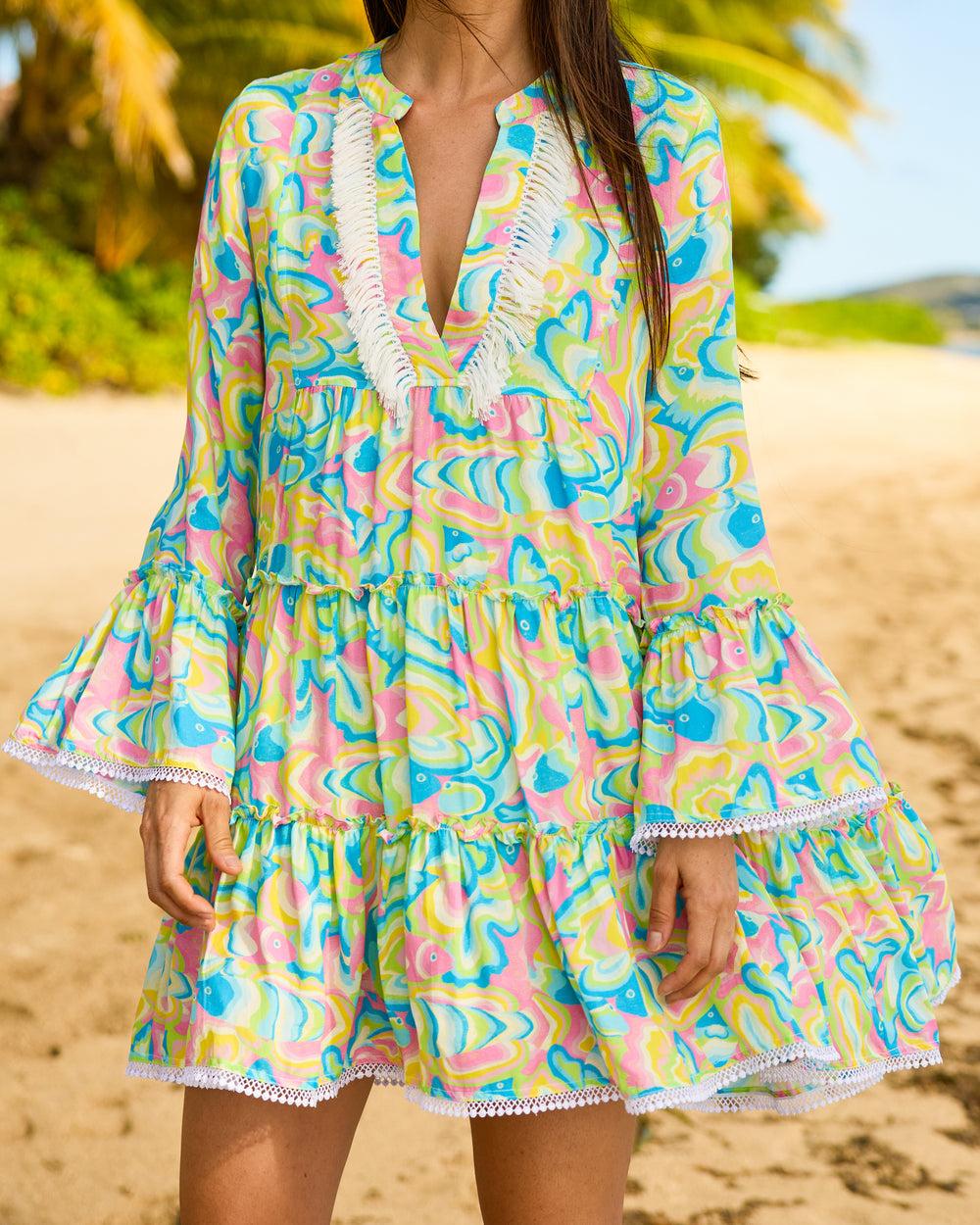 A perfect poolside afternoon at a five-star resort? Champagne at sunset with sweeping palm trees in view? This tiered tunic dress takes you to a warmer place, with a luscious, playful tropical print, luxurious lightweight fabric, and fine trim details. More than a cover up, this chic, effortless pullover dress is destined to get worn on more than just your upcoming trip to Caribbean.