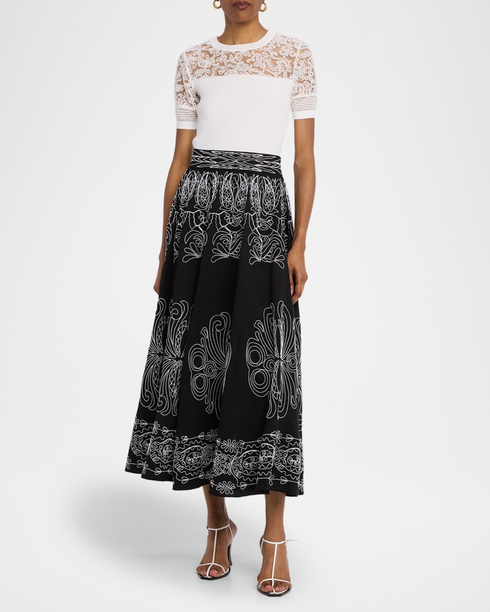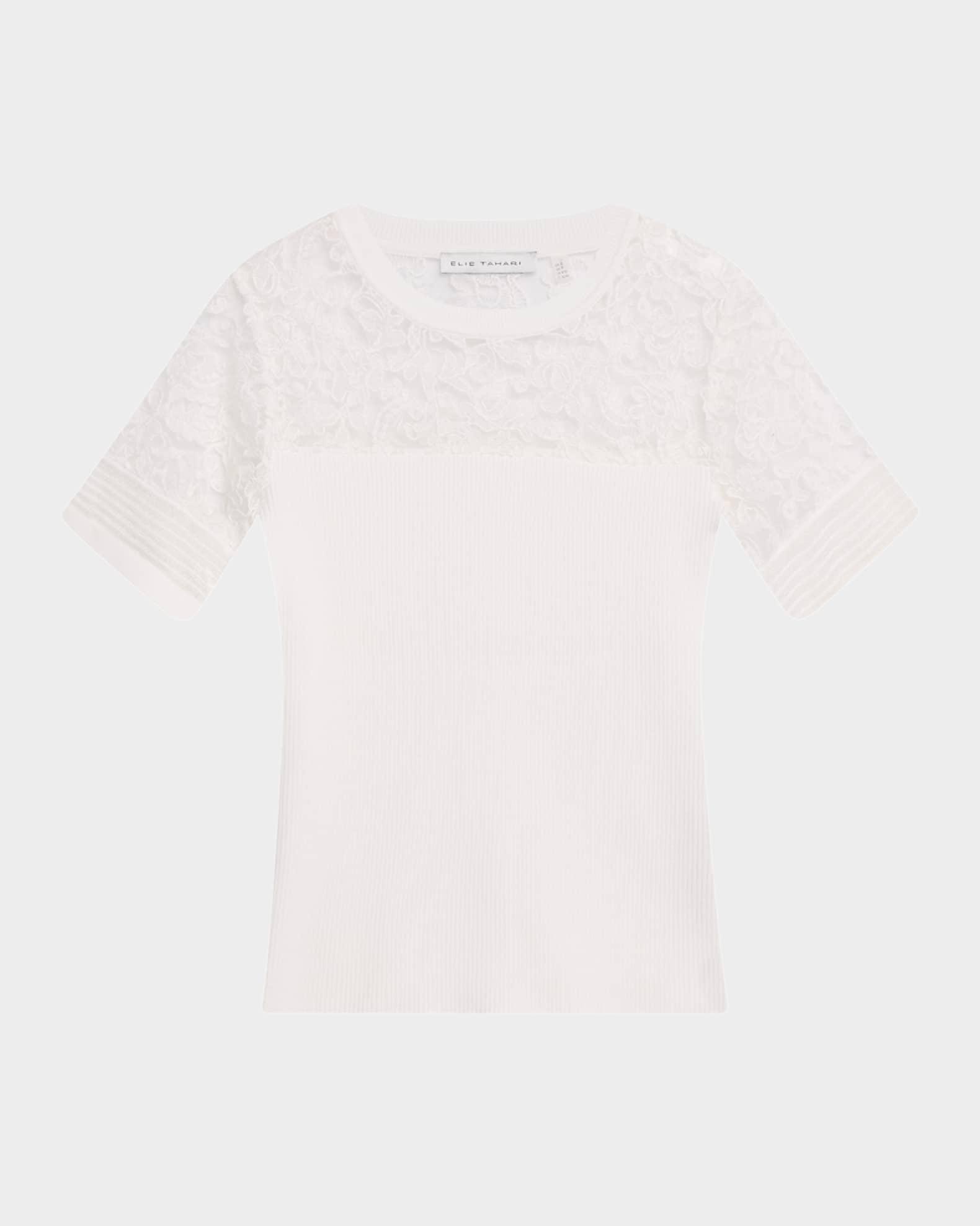 Elie Tahari "The Stephanie" rib knit top features a sheer yoke adorned with swirling textural embroidery Approx. 23.5"L from shoulders to hem Crew neckline Short sleeves; approx. 10"L Slim fit Pullover style Viscose/polyester Unlined Hand wash or dry clean Imported