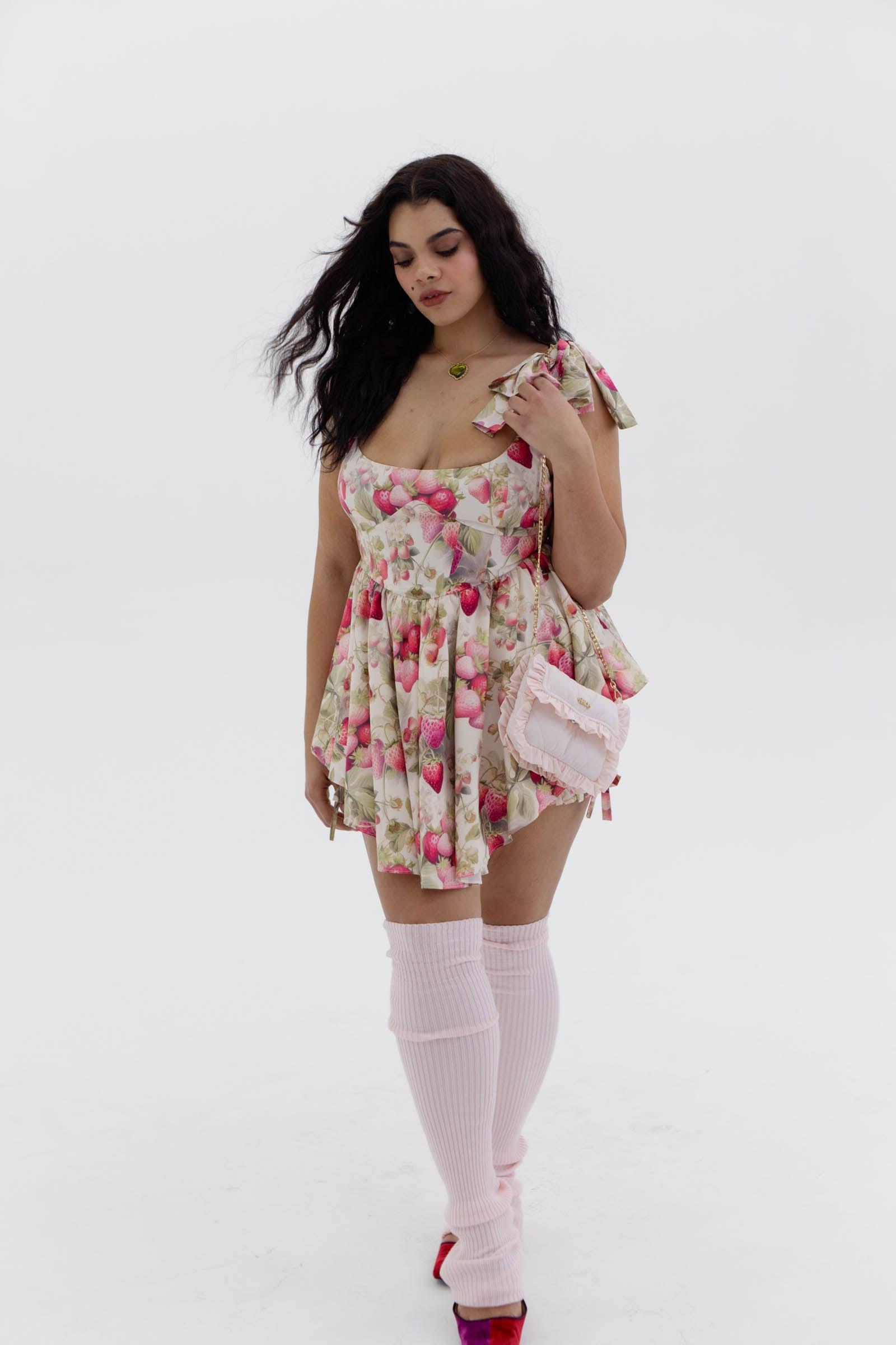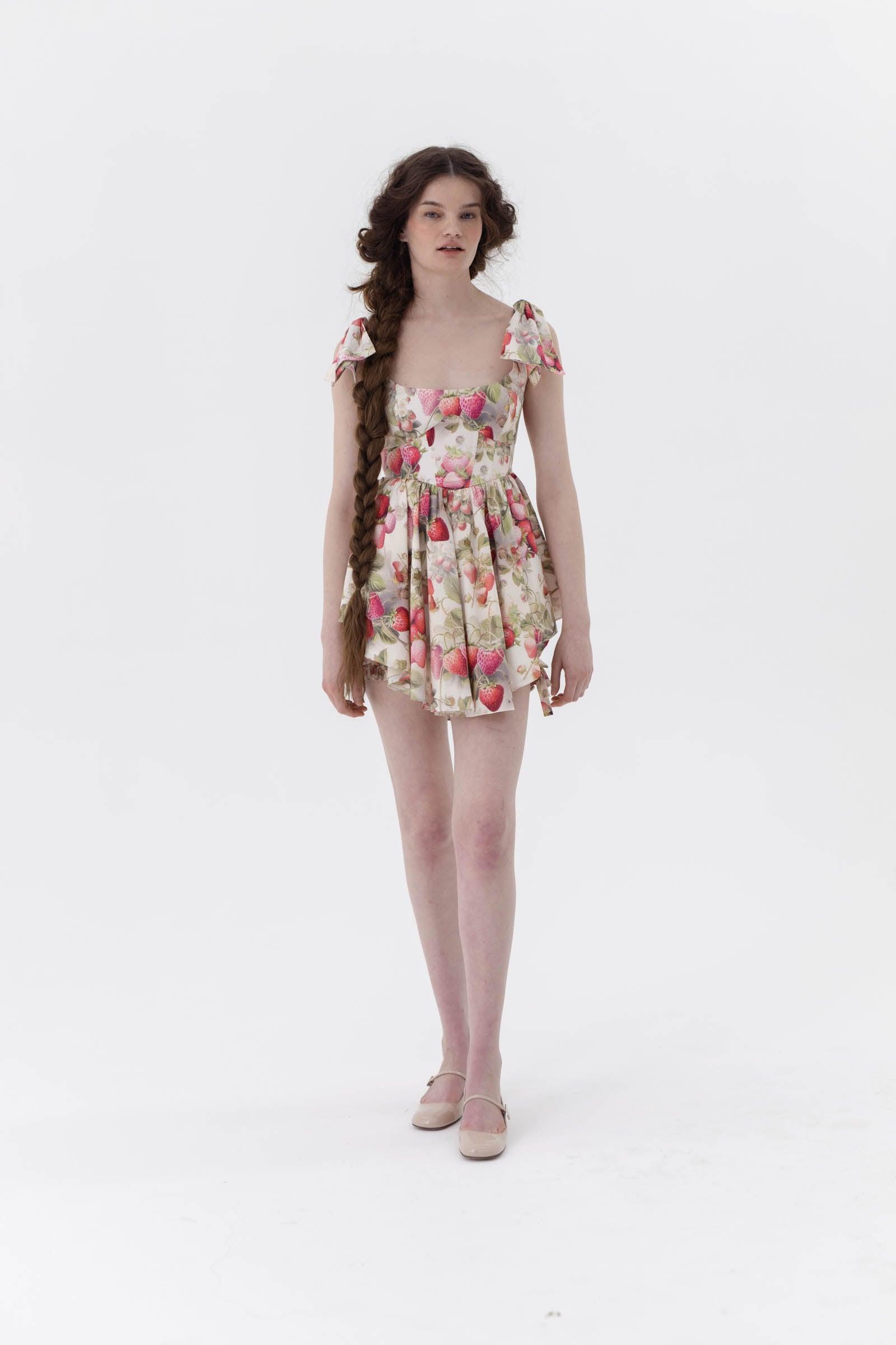 Envision honeybees flitting around freshly baked berry pies as you don this charming reinterpretation of the Cake Shop Dress, which retains the beloved skirt while introducing fresh details. Designed for the warmer weather, the delightful corset allows for a customized fit and serves as a playful way to showcase your back in springtime. Delicate ruffles embellish the tank top, and a high-low hemline lends a flirtatious air. Cotton mini tank dress with boning and functional corset lacing at back Mini skirt with high-low sides Invisible zipper closure Selkie's one-of-a-kind prints are uniquely placed, we're committed to sustainability and cut our fabric to prevent any excess waste. To ensure the best fit, measure your bust and high waist before ordering and steam for optimal beauty. Mariah is 5’10” and wearing a size XL in Selkie. Her measurements are 44” bust, 36” waist, 48” hip. Mallory is 5’9.5” and wearing a size XS in Selkie. Her measurements are 31” bust, 43” waist, 35” hip. Fabric: 100% Paper Cotton Care: Gently hand wash cold, lay flat to dry or dry clean